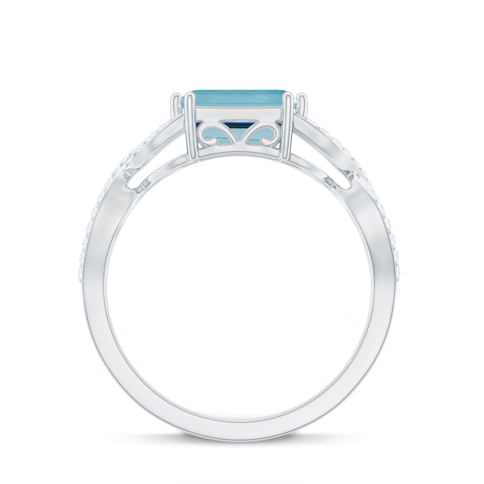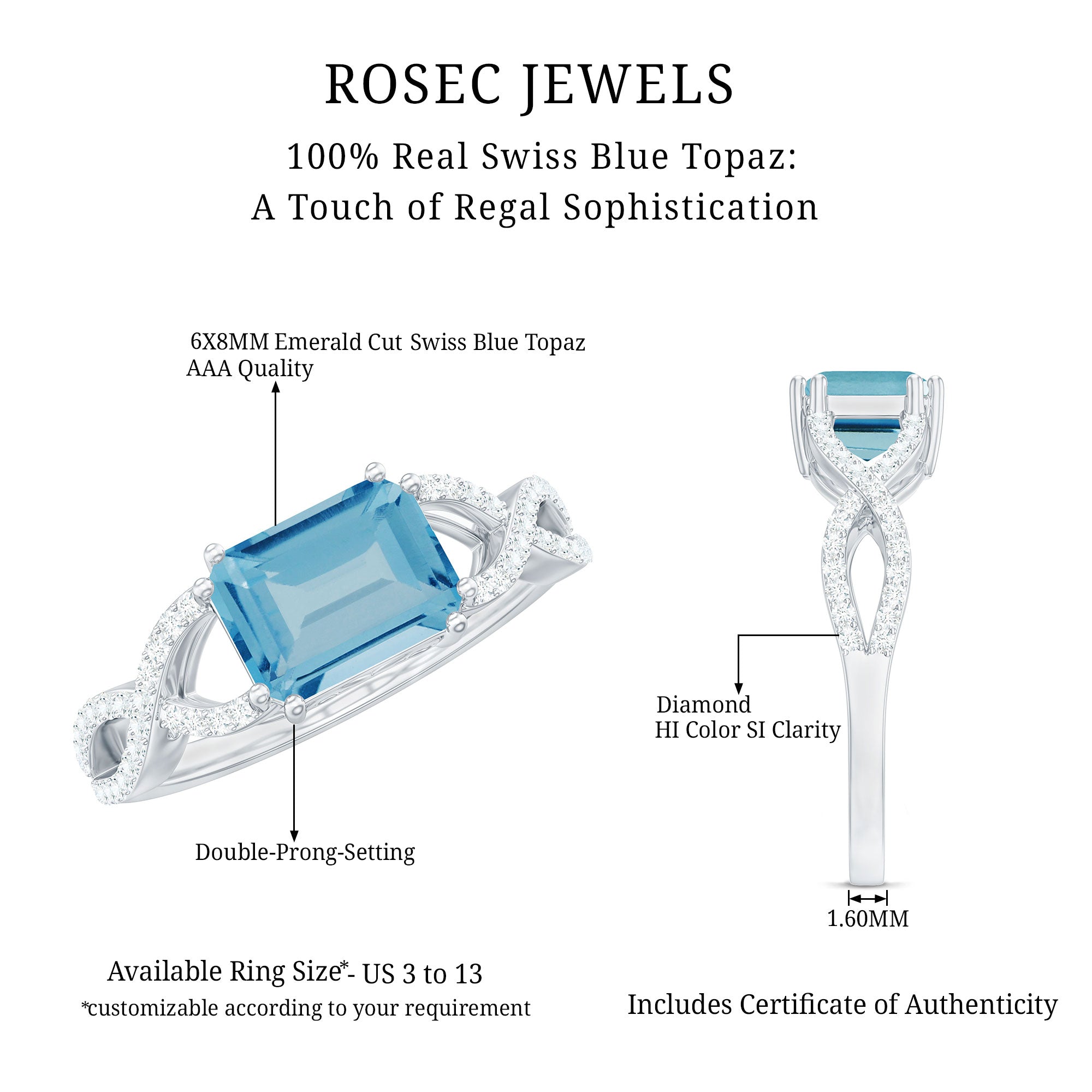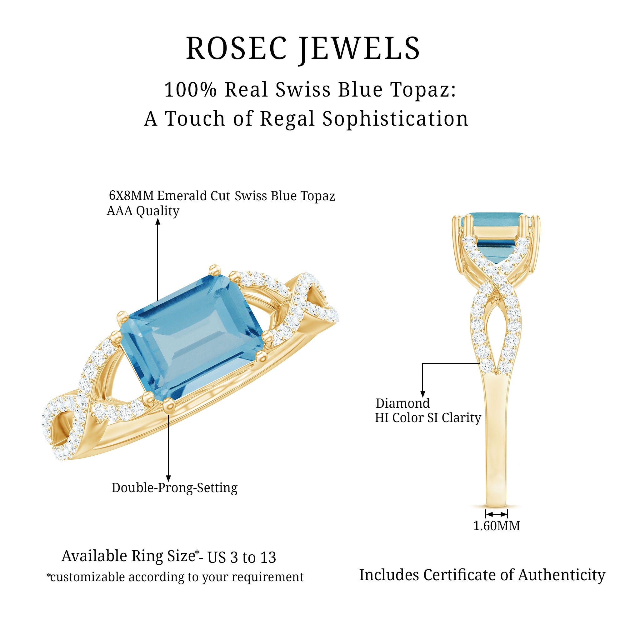 Introducing a stunning Designer Swiss Blue Topaz Engagement Ring to enhance your beauty with its captivating blue hue. Featuring an exquisite Emerald Cut Swiss Blue Topaz gemstone set as a solitaire in an East-West style and embellished with Diamond on a Gold Crossover Shank, this Solitaire Ring is the perfect choice for your lovely lady.