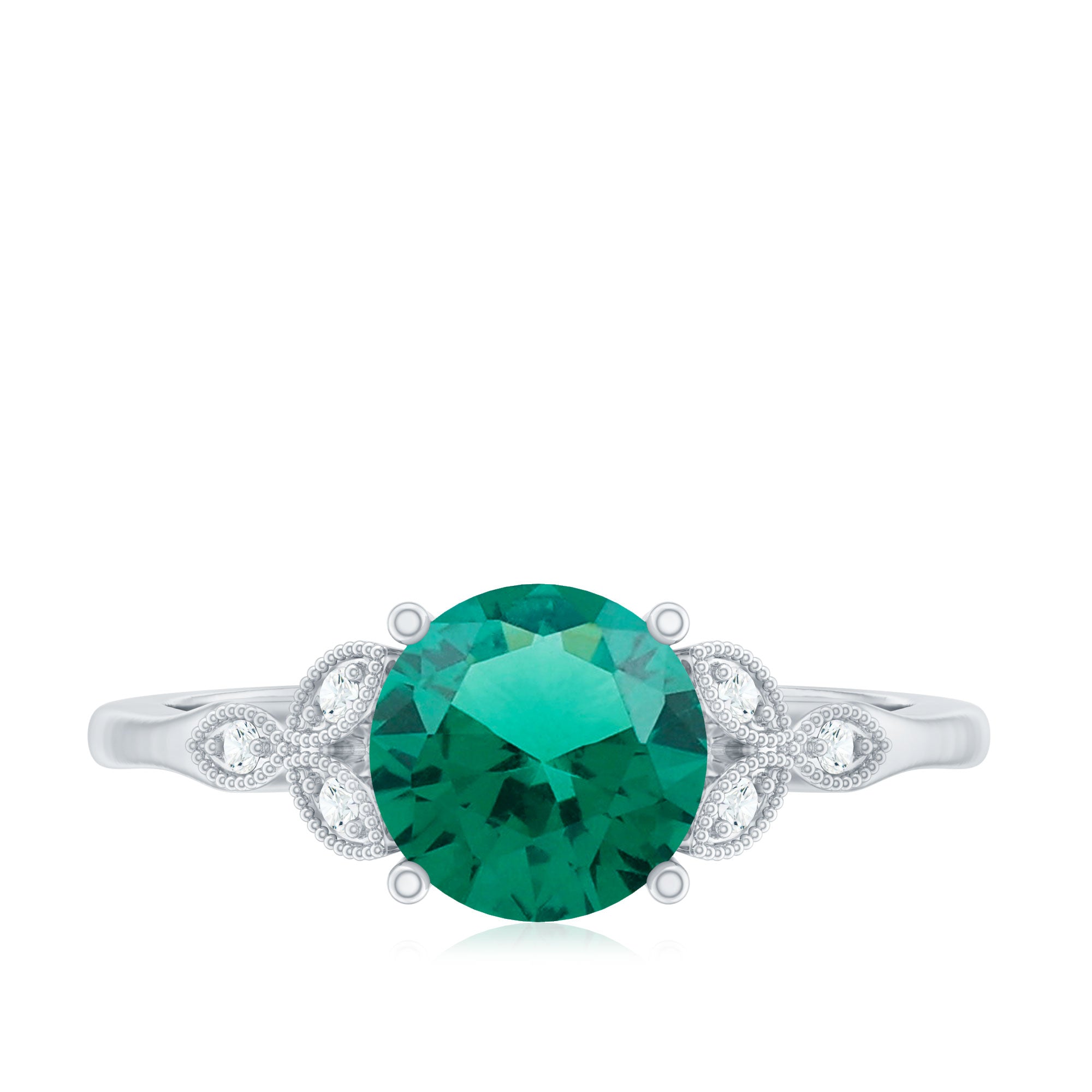 Indulge in timeless elegance with this Solitaire Engagement Ring. A mesmerizing 8 mm Round Shape Lab Emerald takes center stage, exuding rich green allure. The exquisite Lab Grown Diamond Trio and Beaded Detailing enhances the sophistication of this Emerald Ring (Synthetic), while the impeccable craftsmanship ensures lasting beauty. Meticulously designed by Aaaa Quality Emerald and Ef-Vs Quality Diamonds, this piece seamlessly combines modernity with tradition.