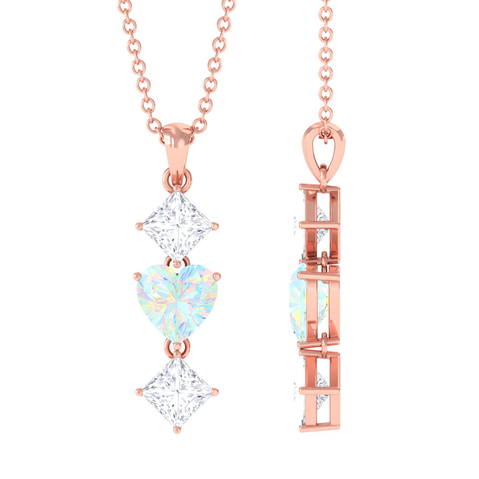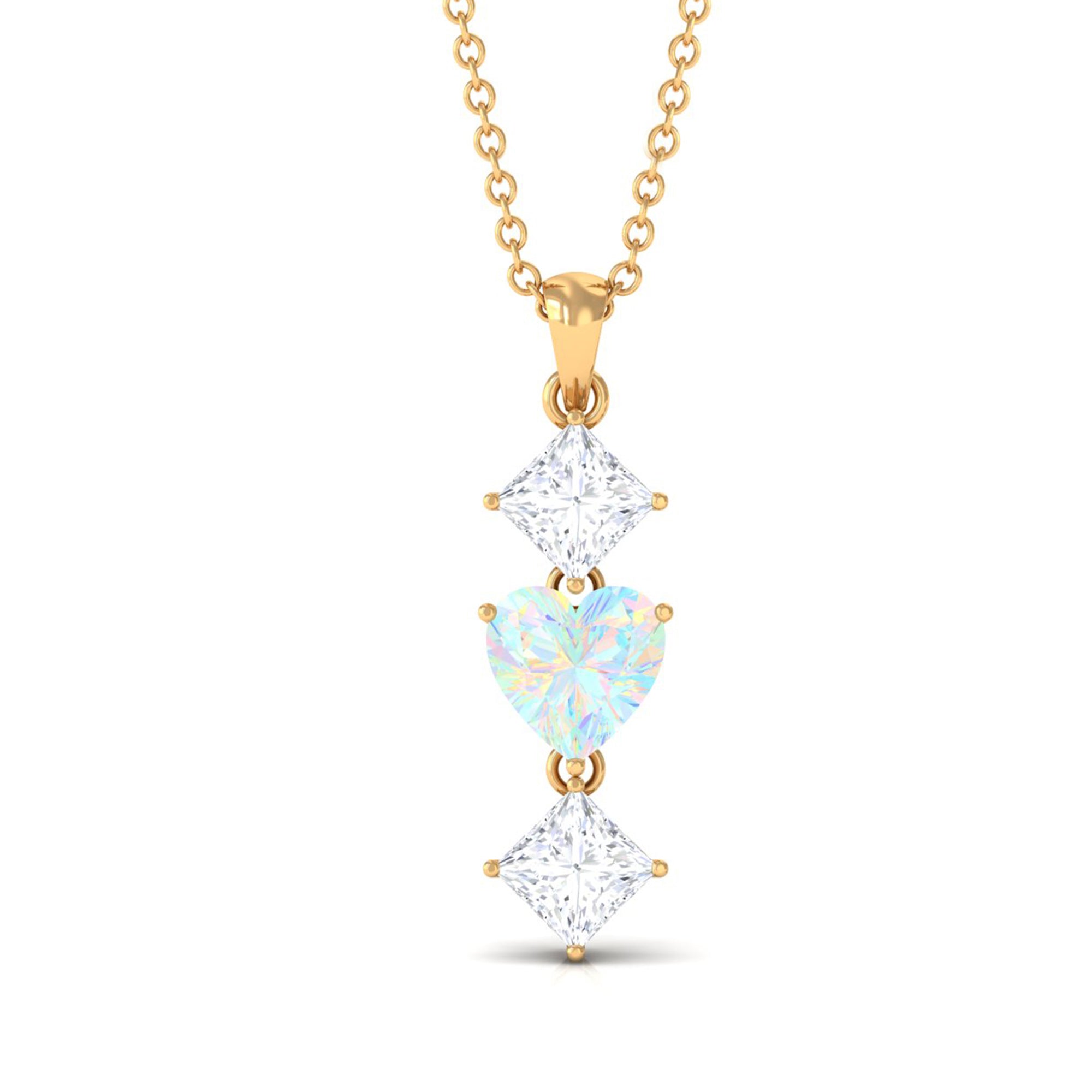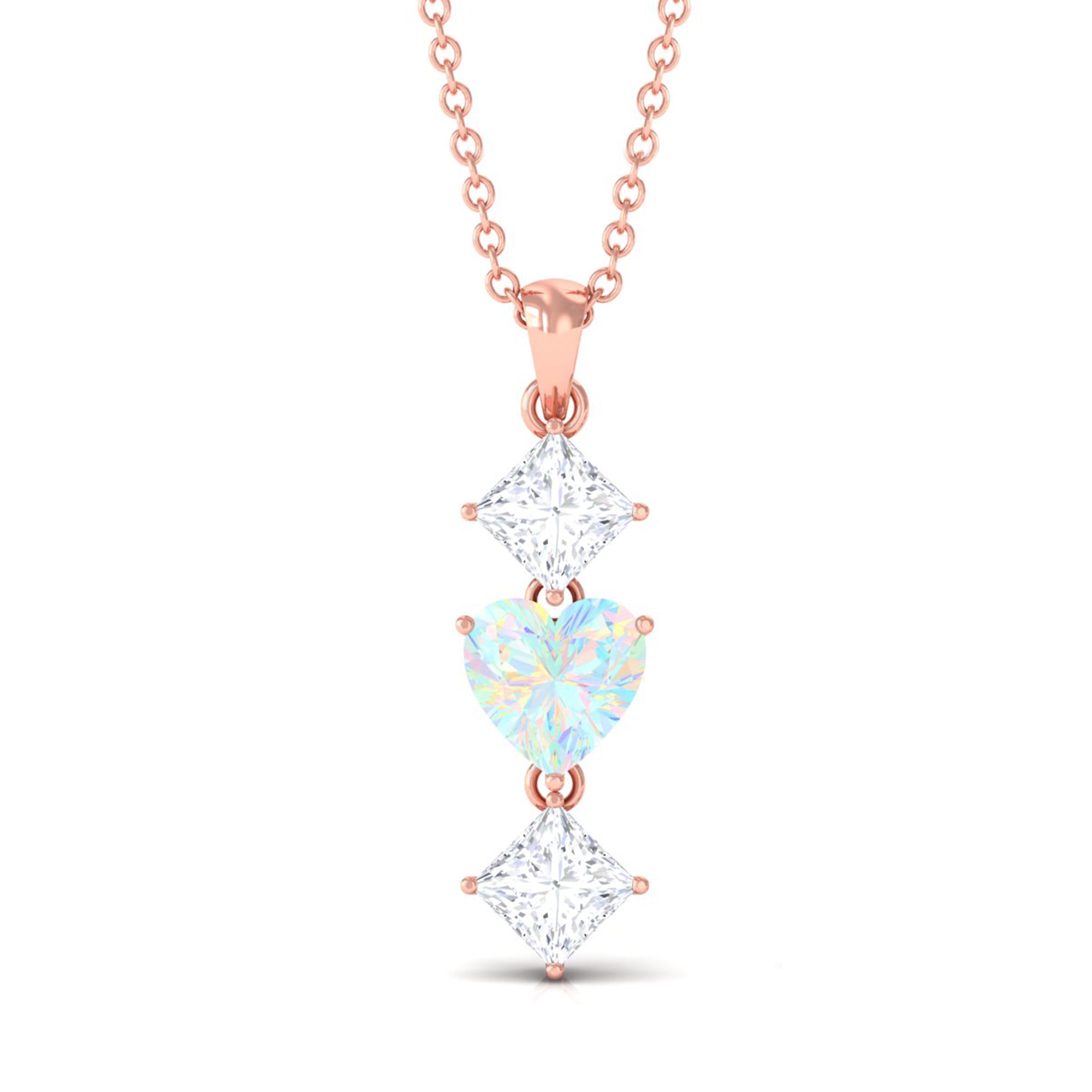 Simple and elegant this Ethiopian Opal Pendant is a much-awaiting for your jewelry case. The Heart Shape Ethiopian Opal in Prong Setting set as Drop in the center with Princess Cut Moissanite on Pendant Necklace is a special preset for birthdays or anniversaries. With its beautiful design and outstanding pattern you sure need not to think about sending this as a precious gift.