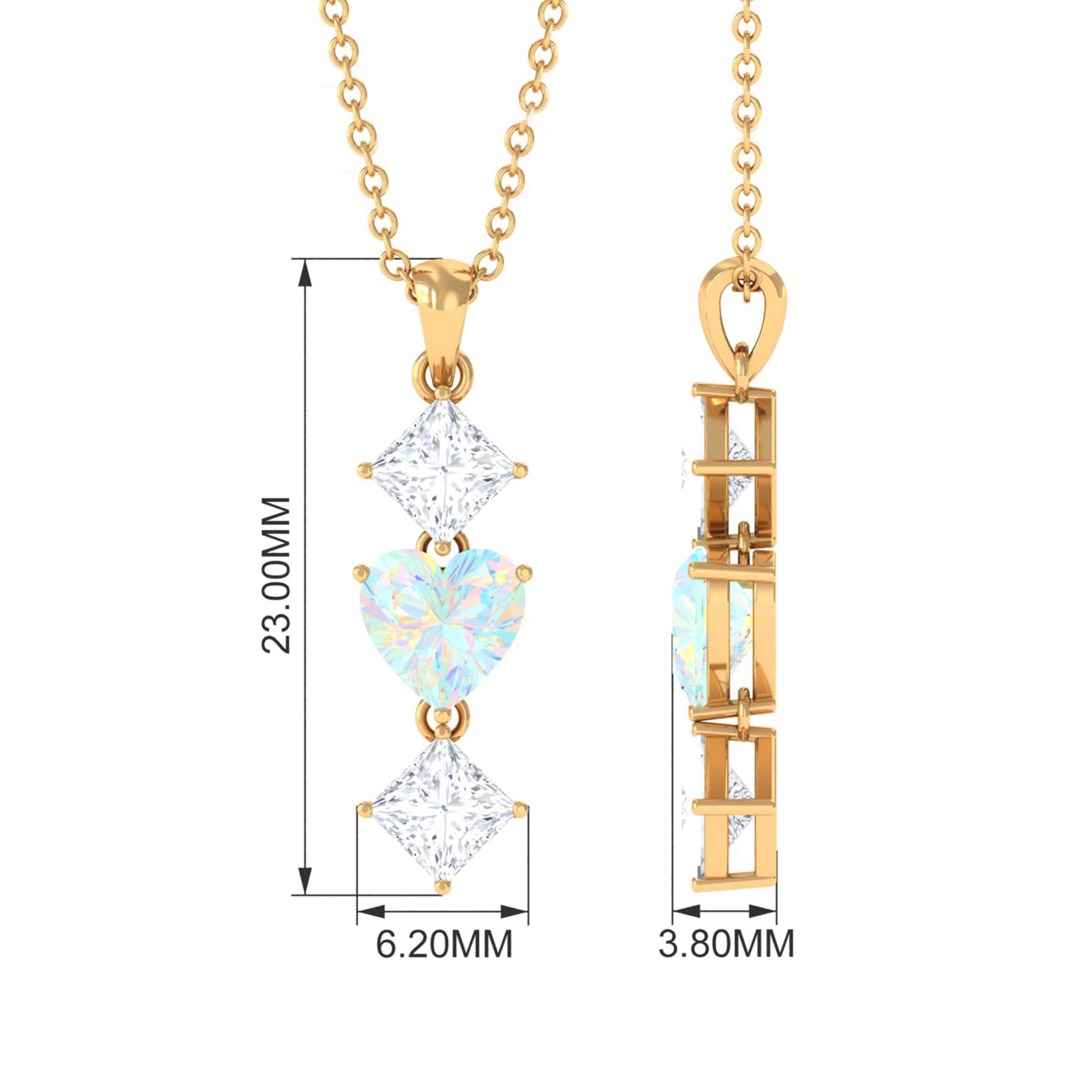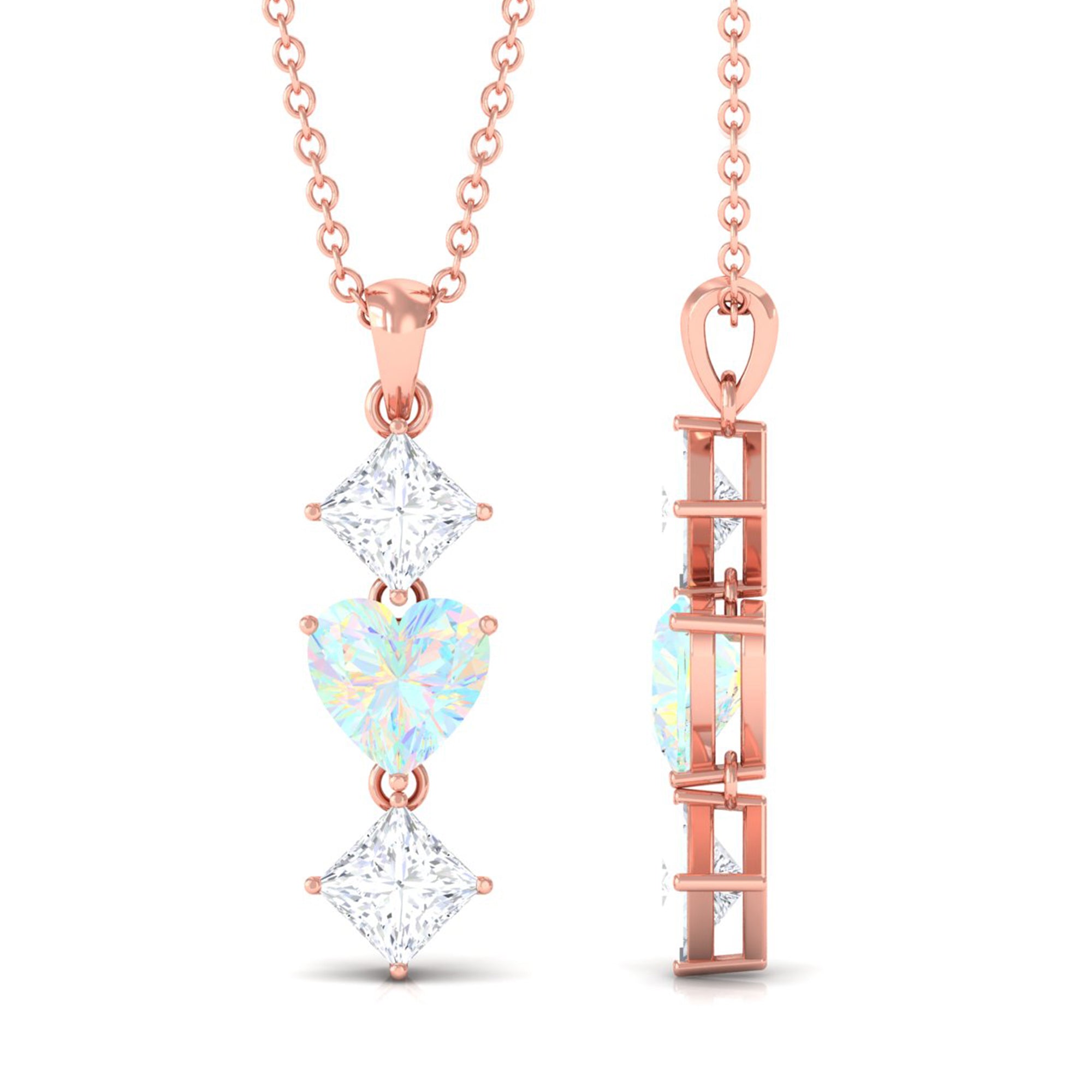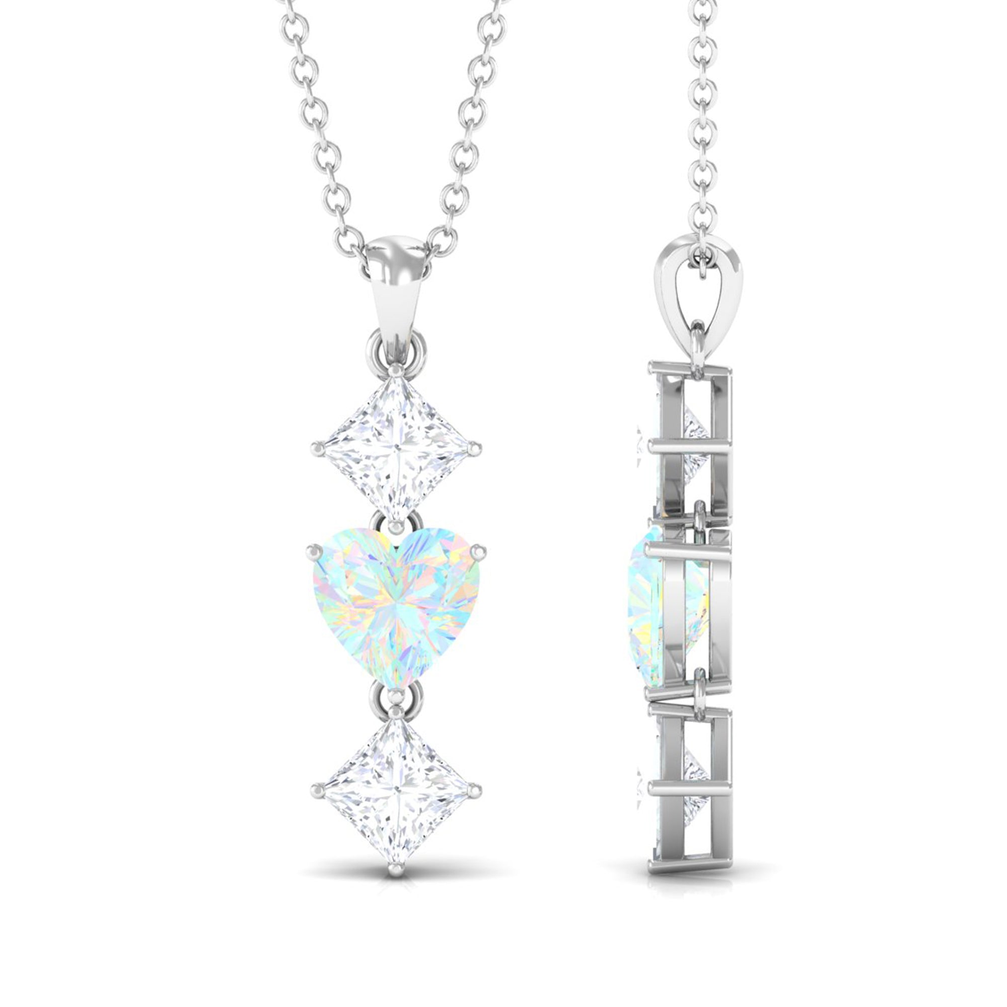Simple and elegant this Ethiopian Opal Pendant is a much-awaiting for your jewelry case. The Heart Shape Ethiopian Opal in Prong Setting set as Drop in the center with Princess Cut Moissanite on Pendant Necklace is a special preset for birthdays or anniversaries. With its beautiful design and outstanding pattern you sure need not to think about sending this as a precious gift.