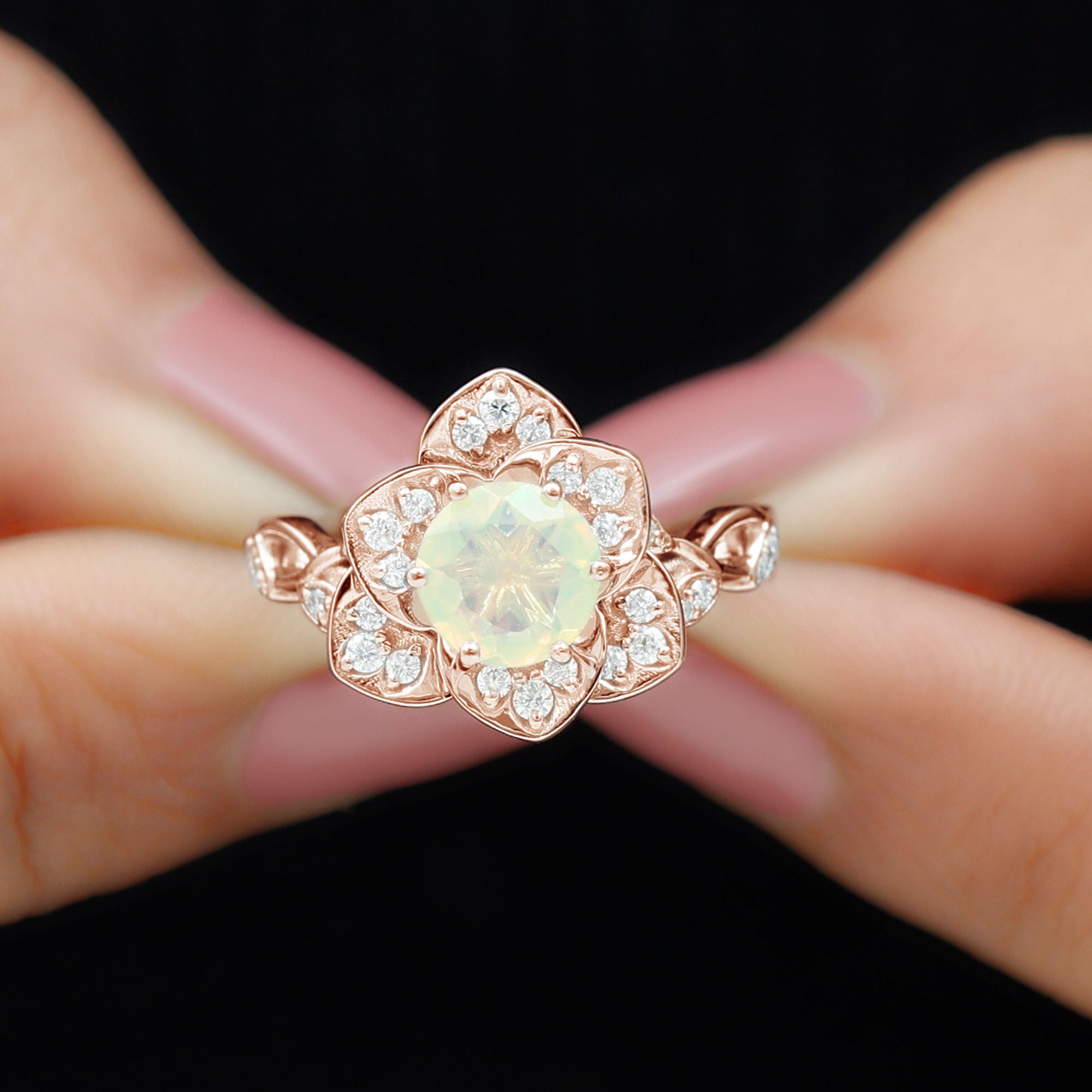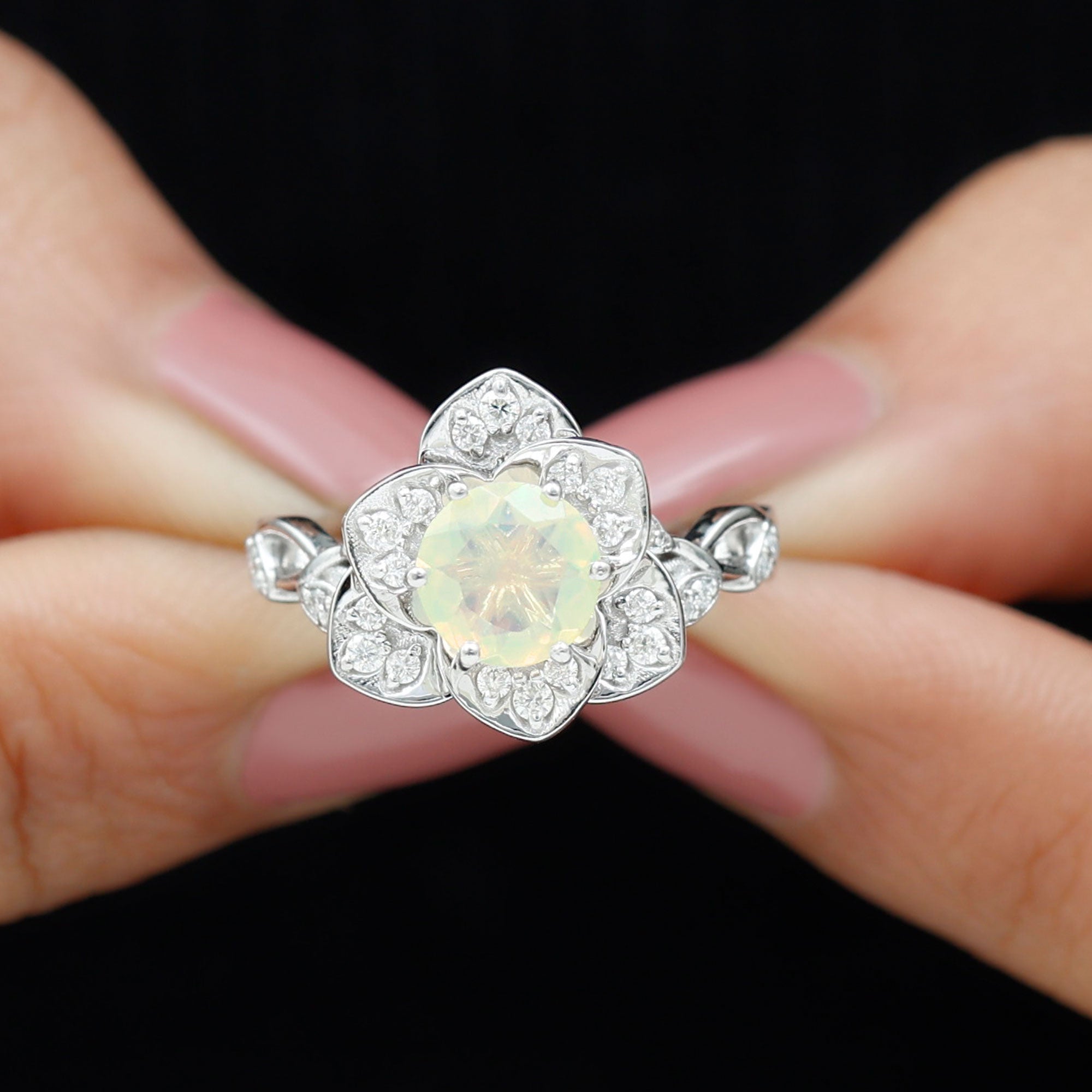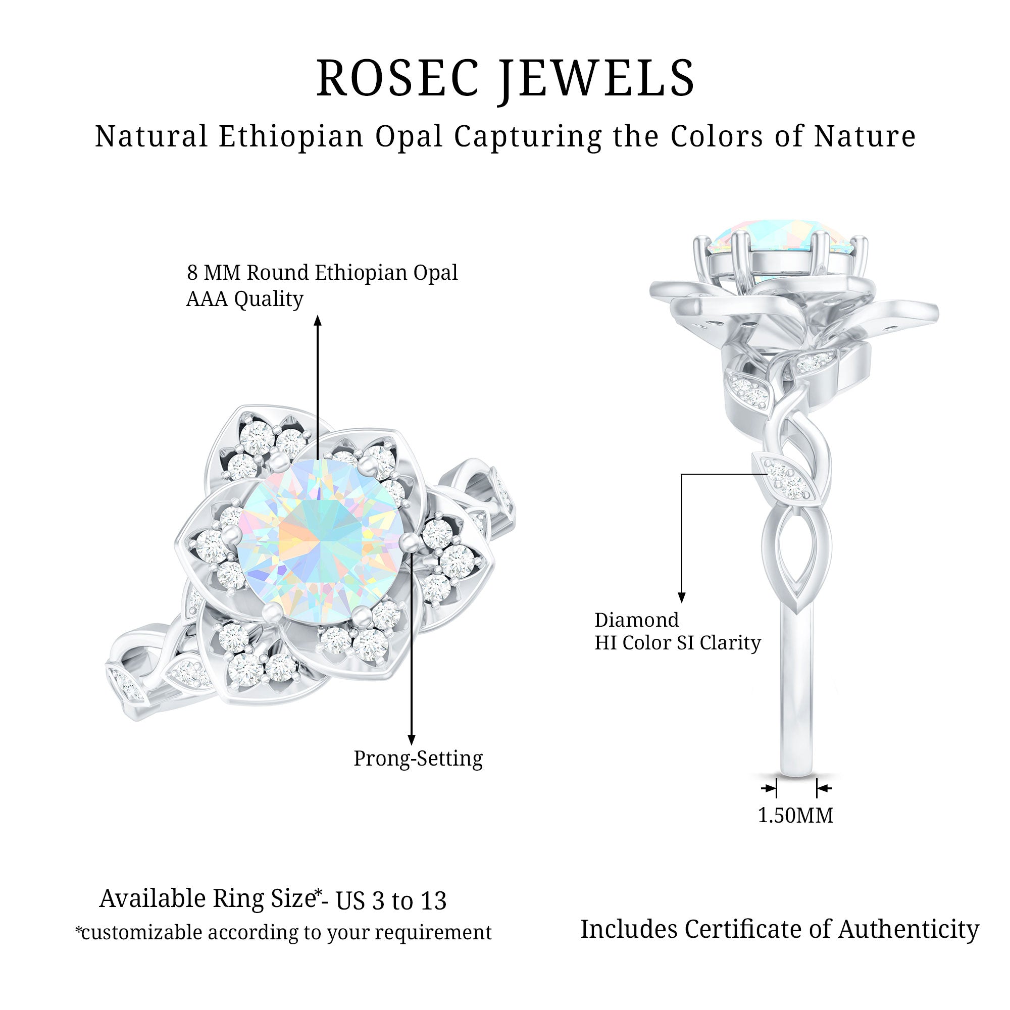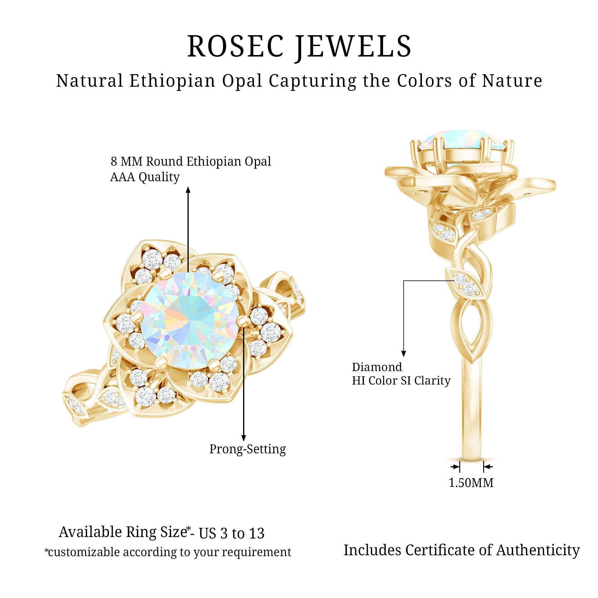 Natural 8mm Ethiopian Opal Flower Engagement Ring with Diamond