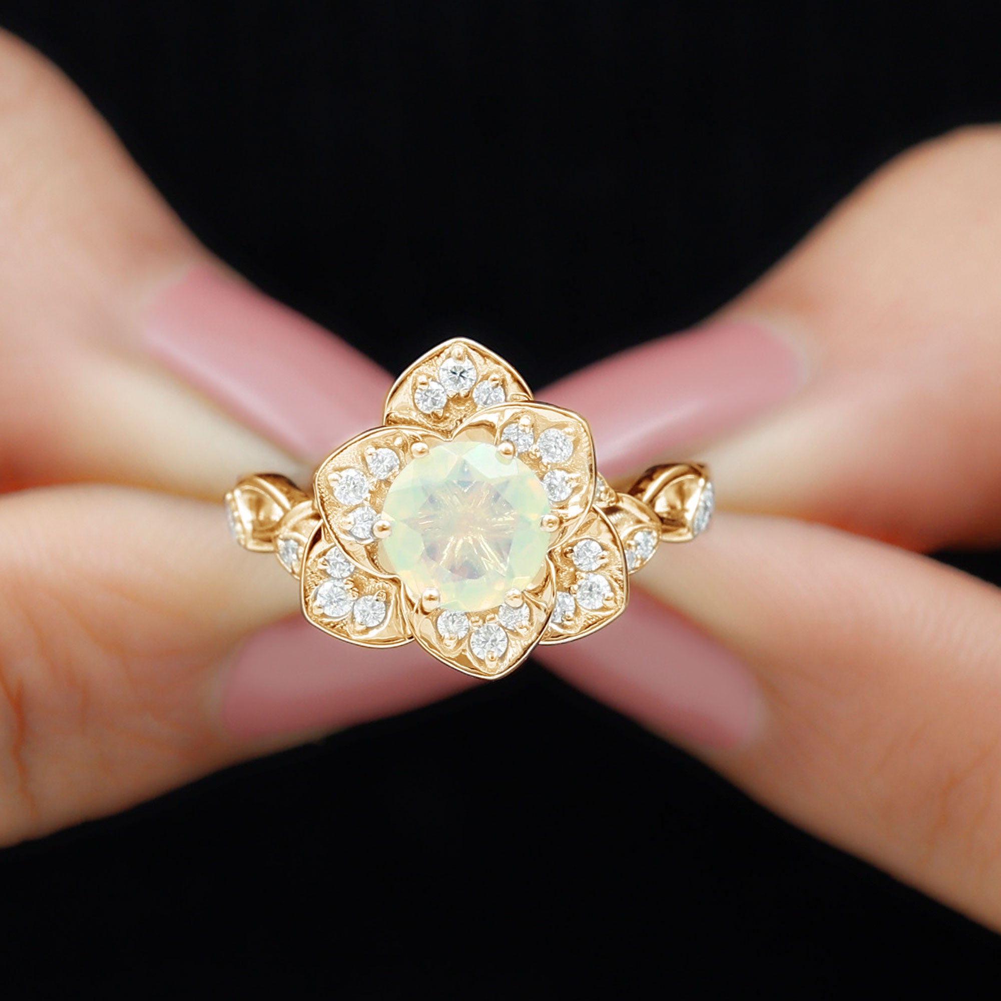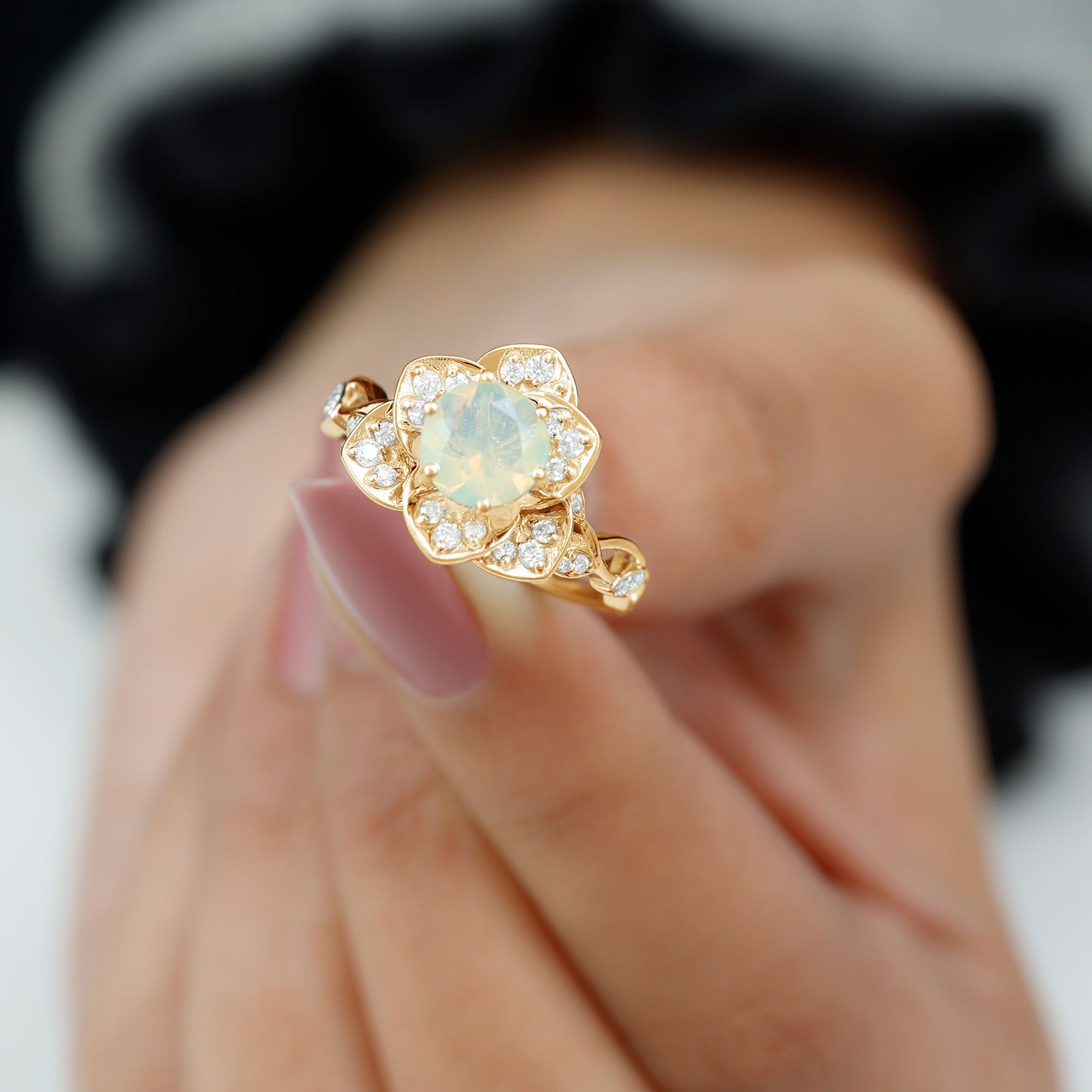 Steal hearts with this enchanting Flower Engagement Ring, a dreamy blend of nature inspired elegance and timeless sparkle. At the center blooms a radiant 8 mm Round Shape Ethiopian Opal, glowing with ethereal flashes of color that shift like magic in the light. Encircled by sparkling Diamond stones in a delicate flower motif, this centerpiece captures the beauty of a love that is forever blossoming. The band tells its own story too, crafted with dainty Leaf details, each adorned with tiny Diamond stones that glimmer like morning dew on petals. This Opal Flower Ring feels straight out of a fairytale, made for the one who lives with heart and soul wide open. Whether you are proposing, renewing vows or celebrating a milestone, this Opal and Diamond Engagement Ring speaks of deep devotion and natural beauty. Packaged in a signature jewelry box and available in a range of ring sizes, this Ethiopian Opal Ring is ready to gift and cherish for a lifetime. Say yes to a ring that is as bold, graceful and unforgettable as your love.
