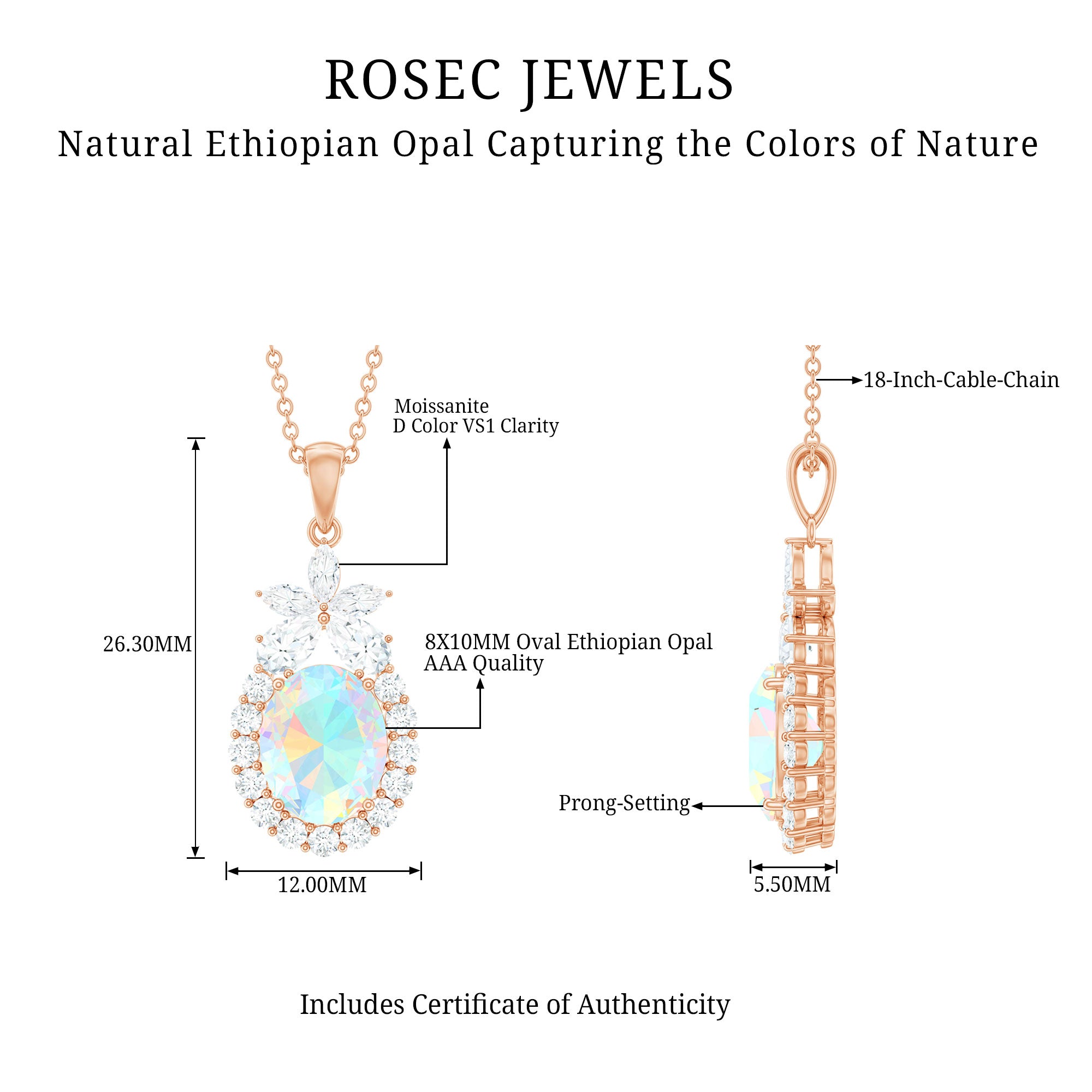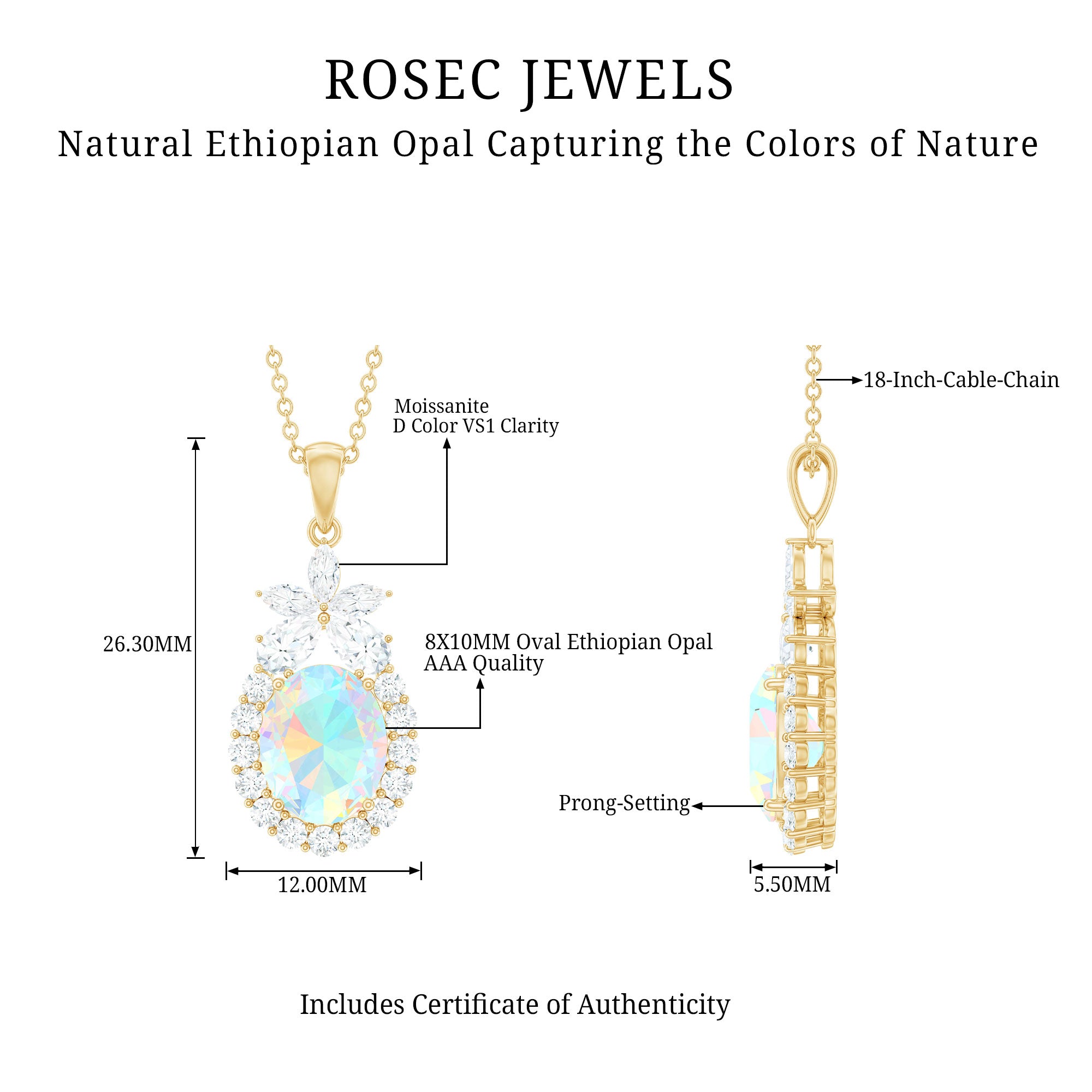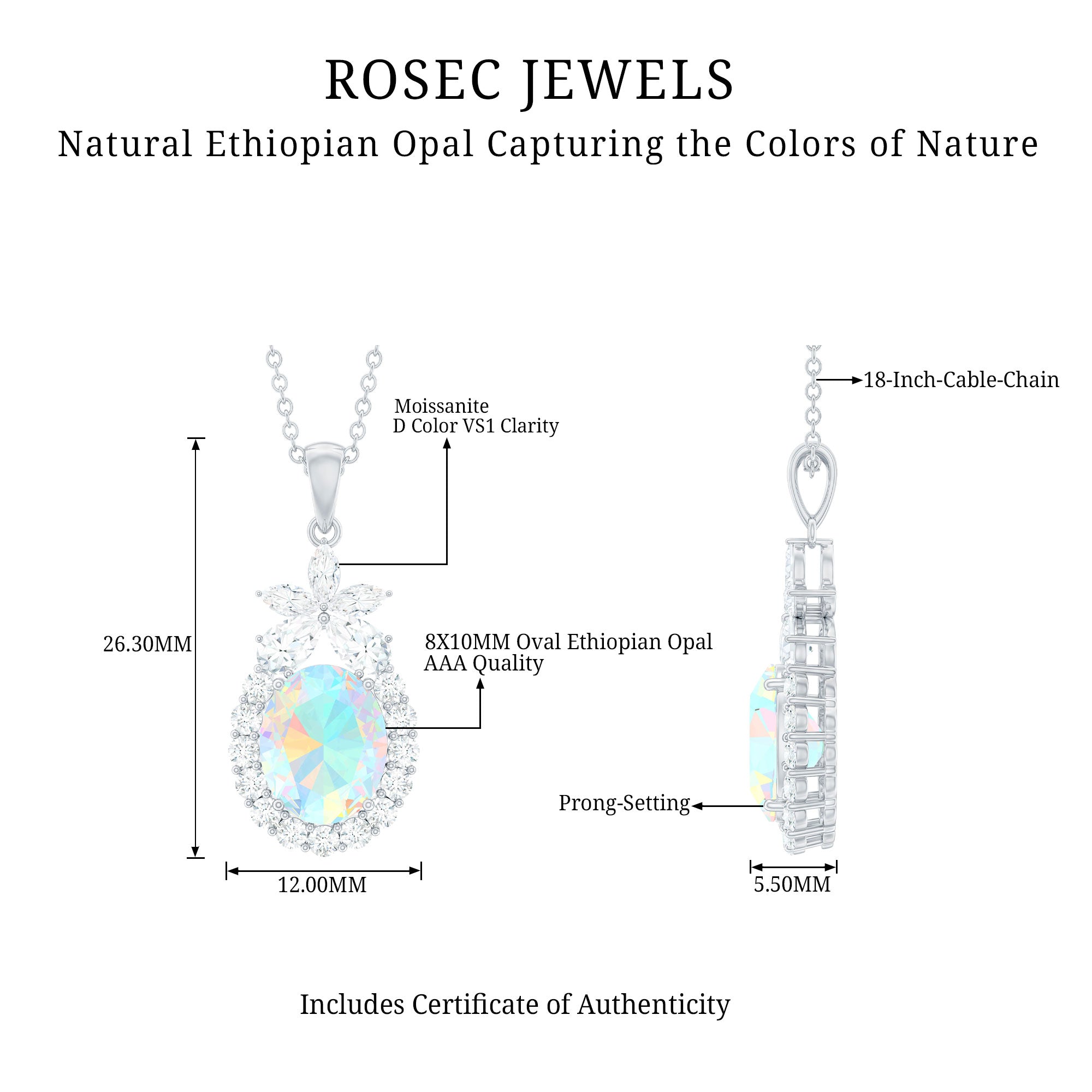 Make everyone a fan of your style when you wear this Ethiopian Opal Pendant Necklace. Featuring with the Oval Shape Ethiopian Opal in Prong Setting with Moissanite Halo on this Statement Pendant Necklace. Add sparkle to your outfit with this mesmerizing Opal Necklace with a flower on the top that adds glam to your outfit. Be it your wedding or birthday this Opal Statement Pendant is sure to make the statements. This Opal Necklace also makes a stunning October Birthday jewelry for you or the one whom you adore the most.