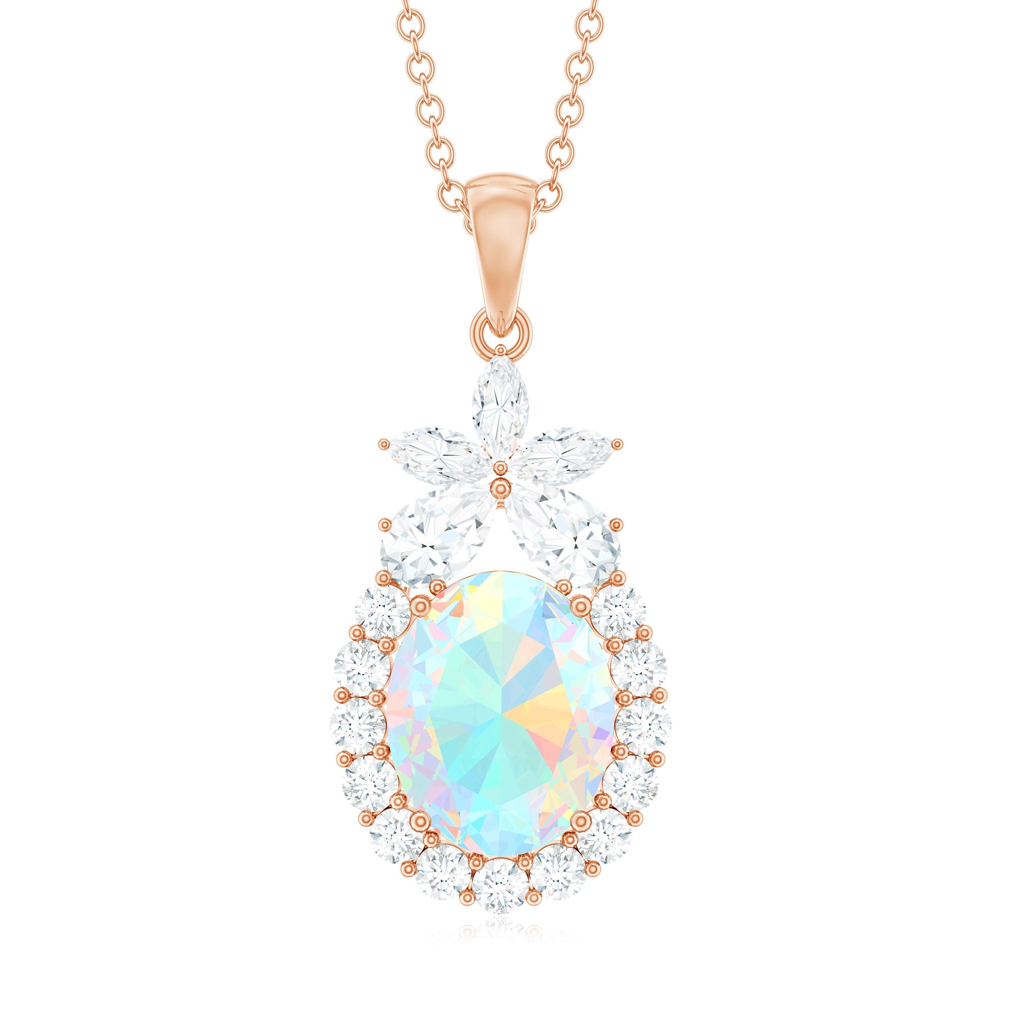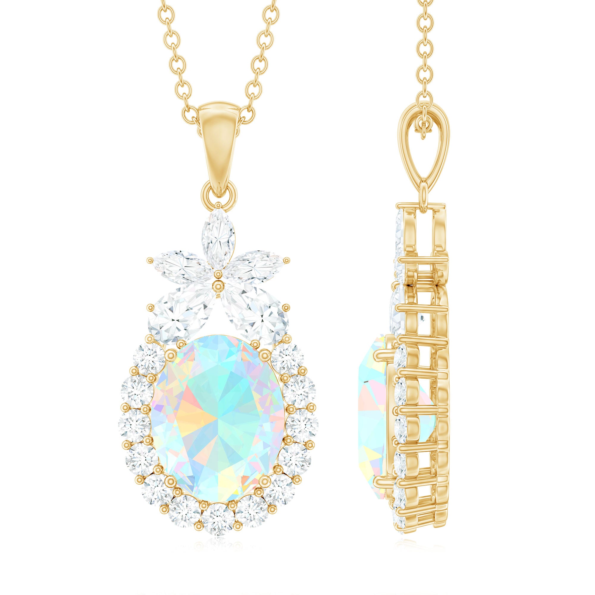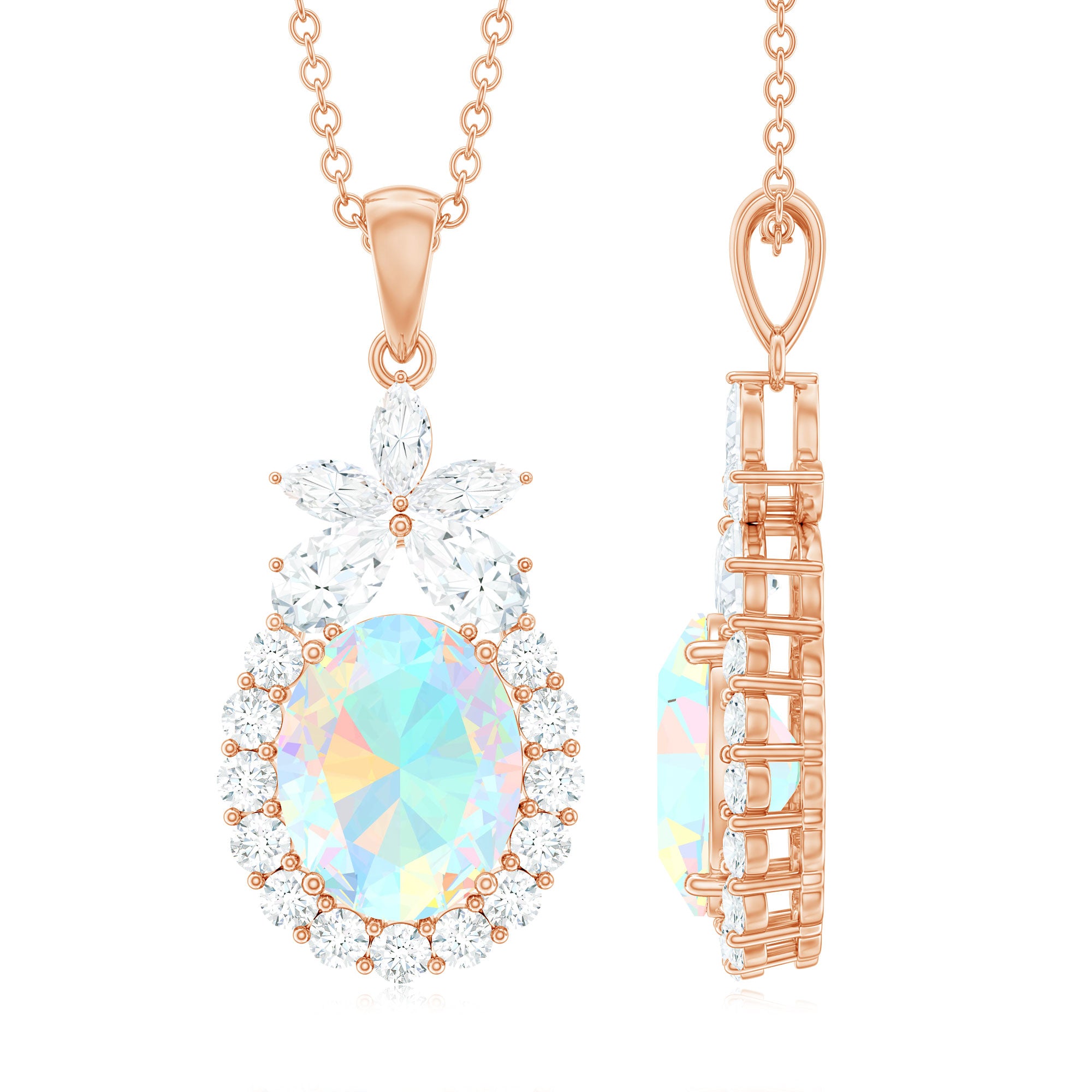 Make everyone a fan of your style when you wear this Ethiopian Opal Pendant Necklace. Featuring with the Oval Shape Ethiopian Opal in Prong Setting with Moissanite Halo on this Statement Pendant Necklace. Add sparkle to your outfit with this mesmerizing Opal Necklace with a flower on the top that adds glam to your outfit. Be it your wedding or birthday this Opal Statement Pendant is sure to make the statements. This Opal Necklace also makes a stunning October Birthday jewelry for you or the one whom you adore the most.