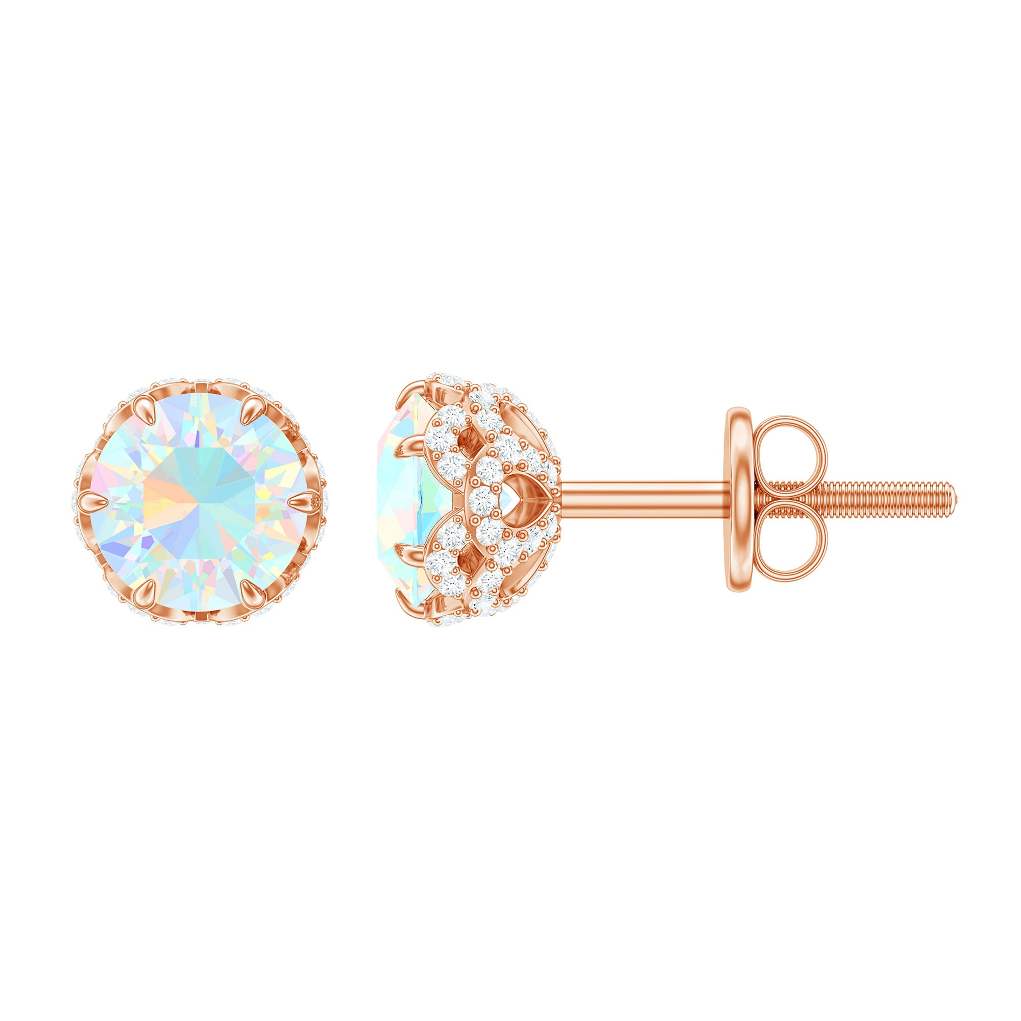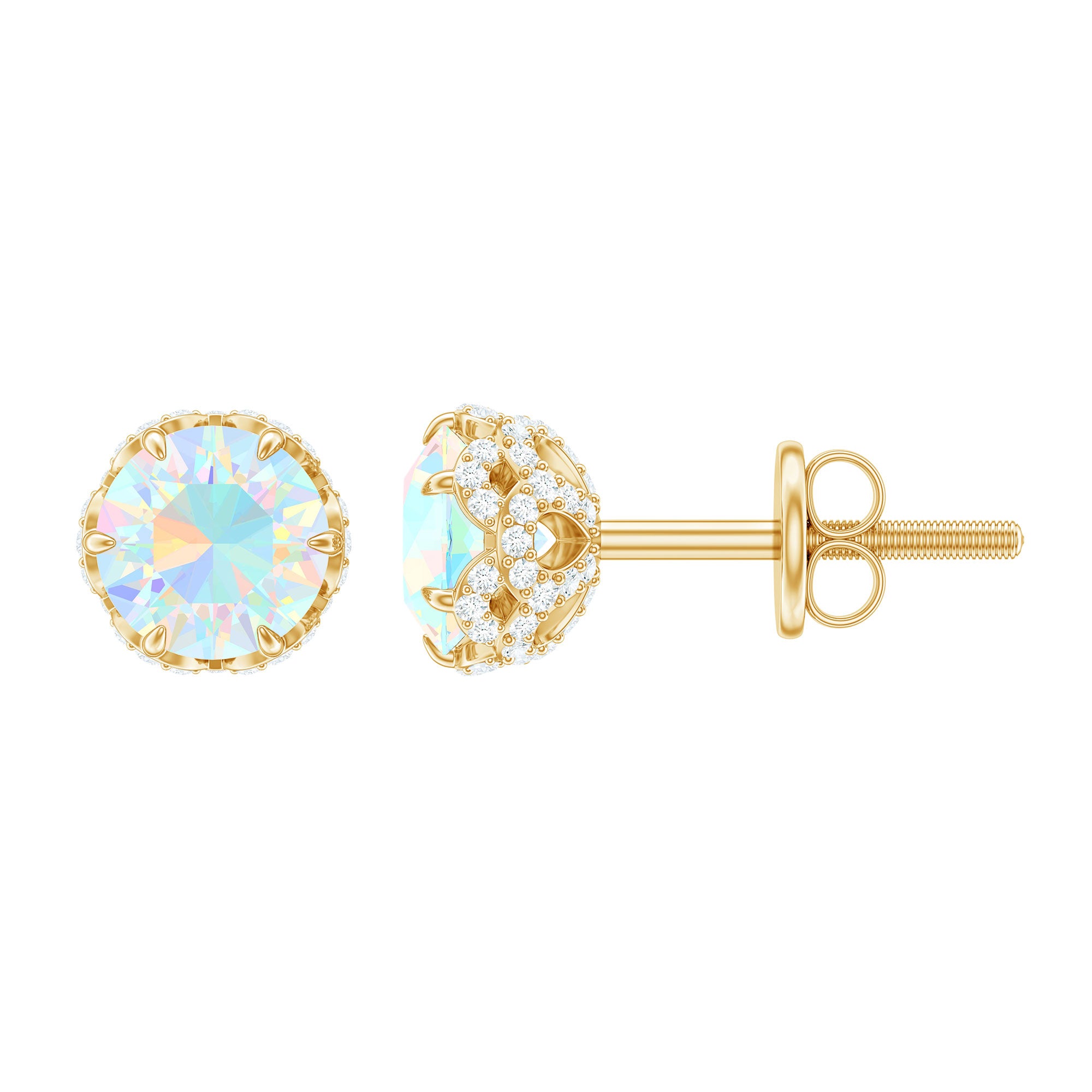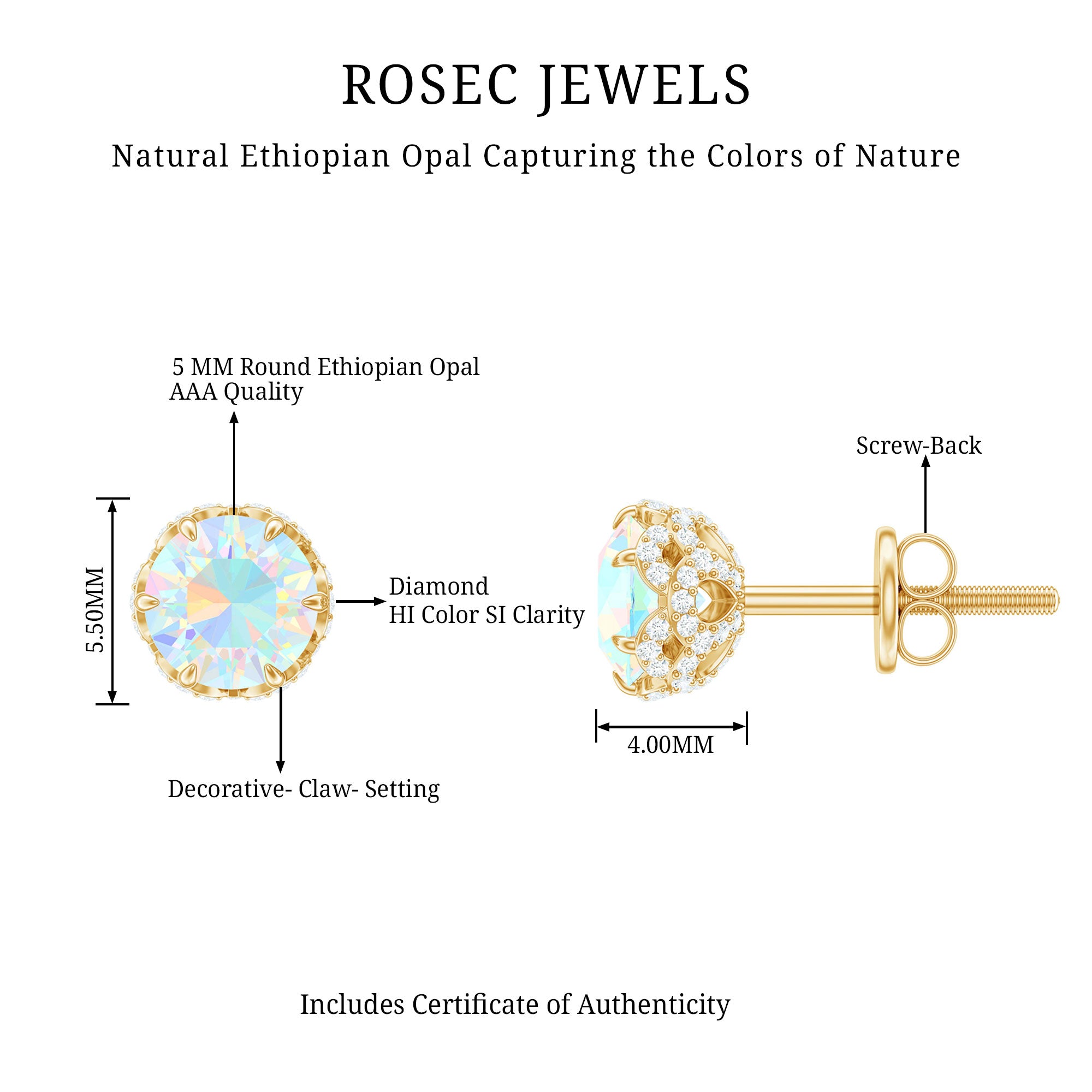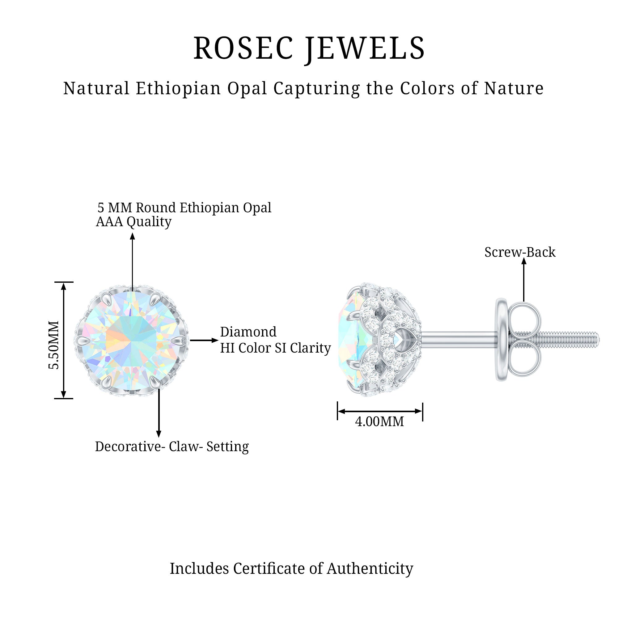 This Classic Stud Earring is embellished with Round Shape Ethiopian Opal set as Solitaire and Diamond in Decorative Pattern.