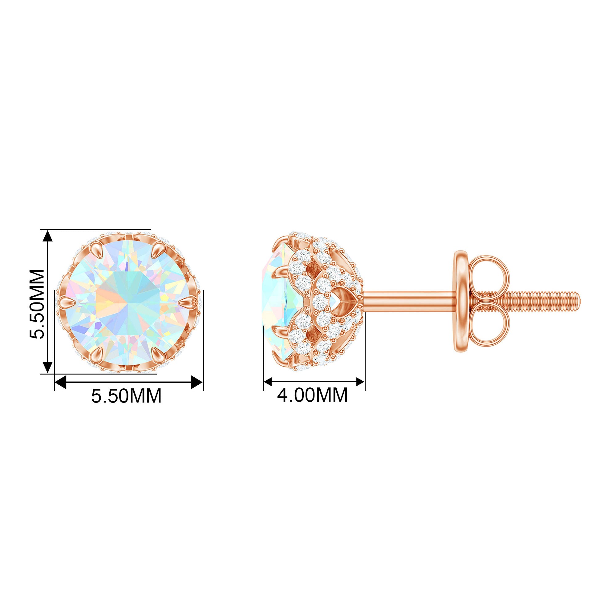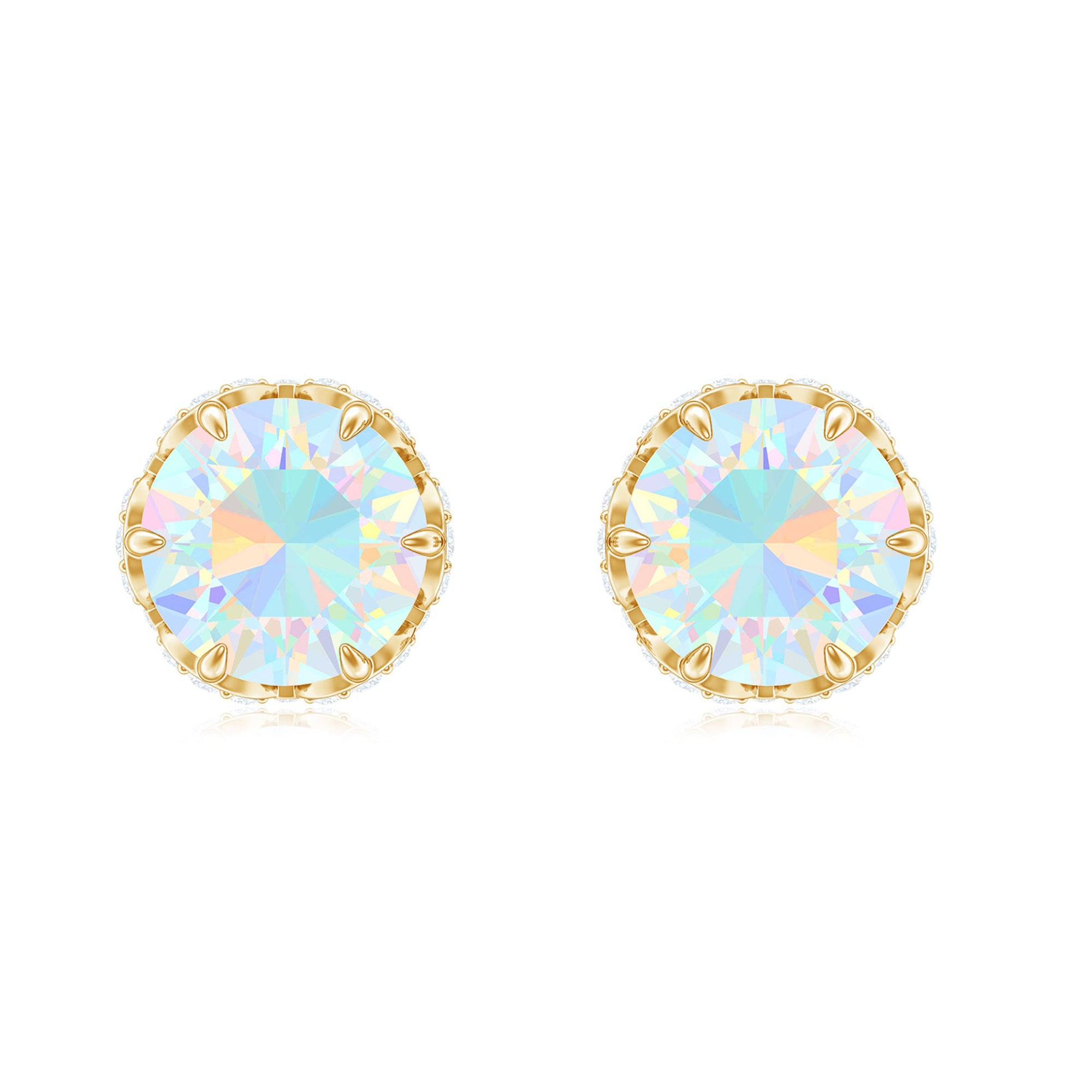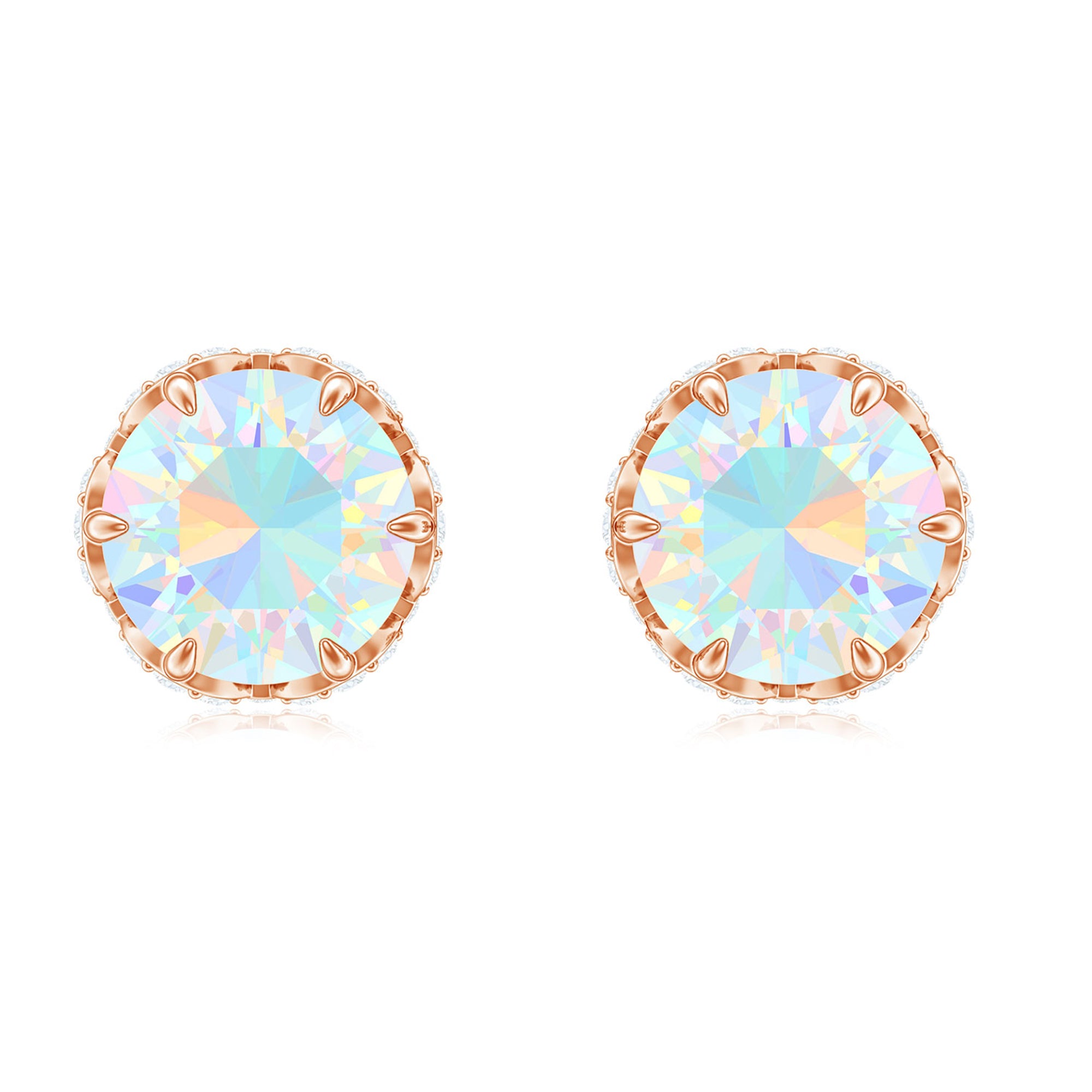 This Classic Stud Earring is embellished with Round Shape Ethiopian Opal set as Solitaire and Diamond in Decorative Pattern.