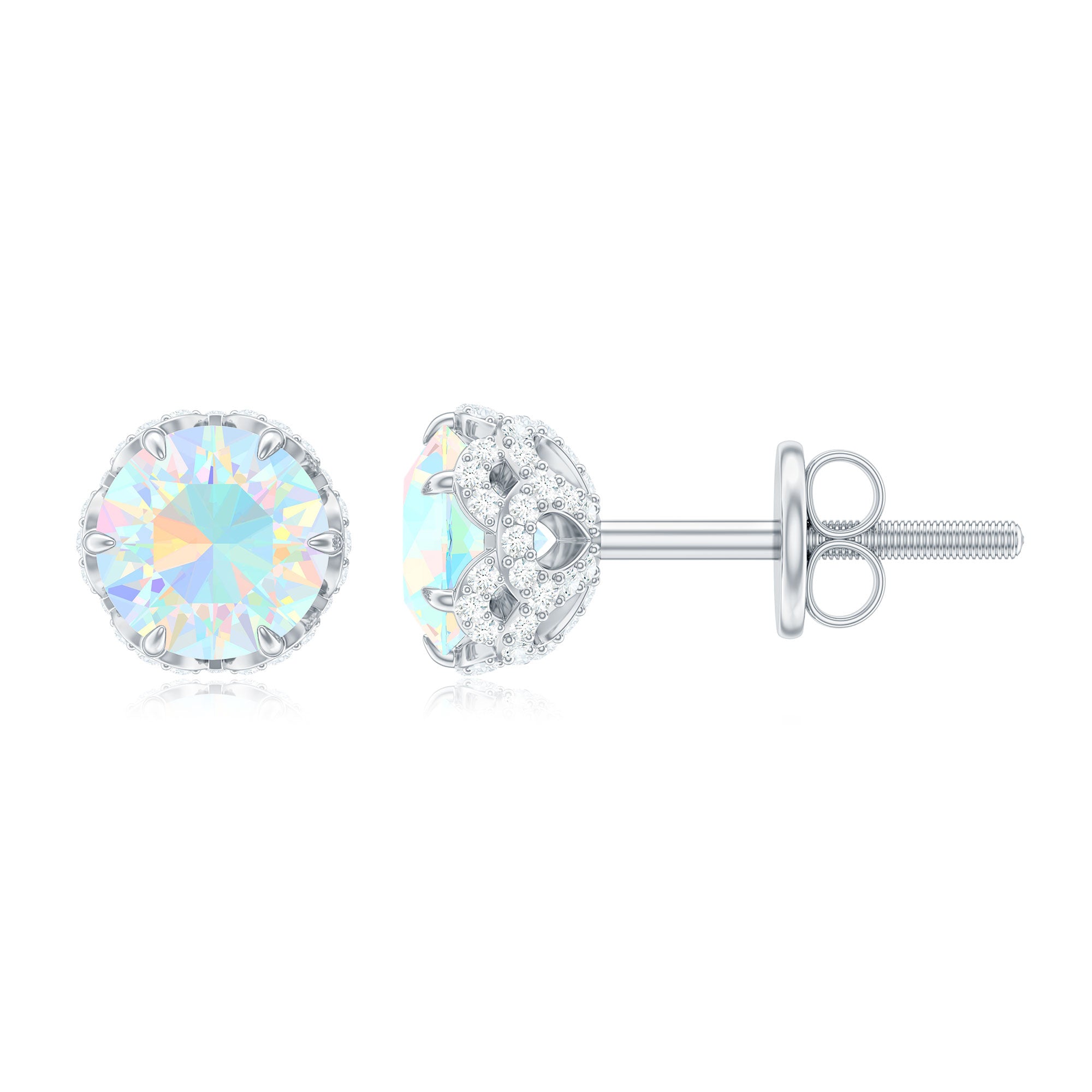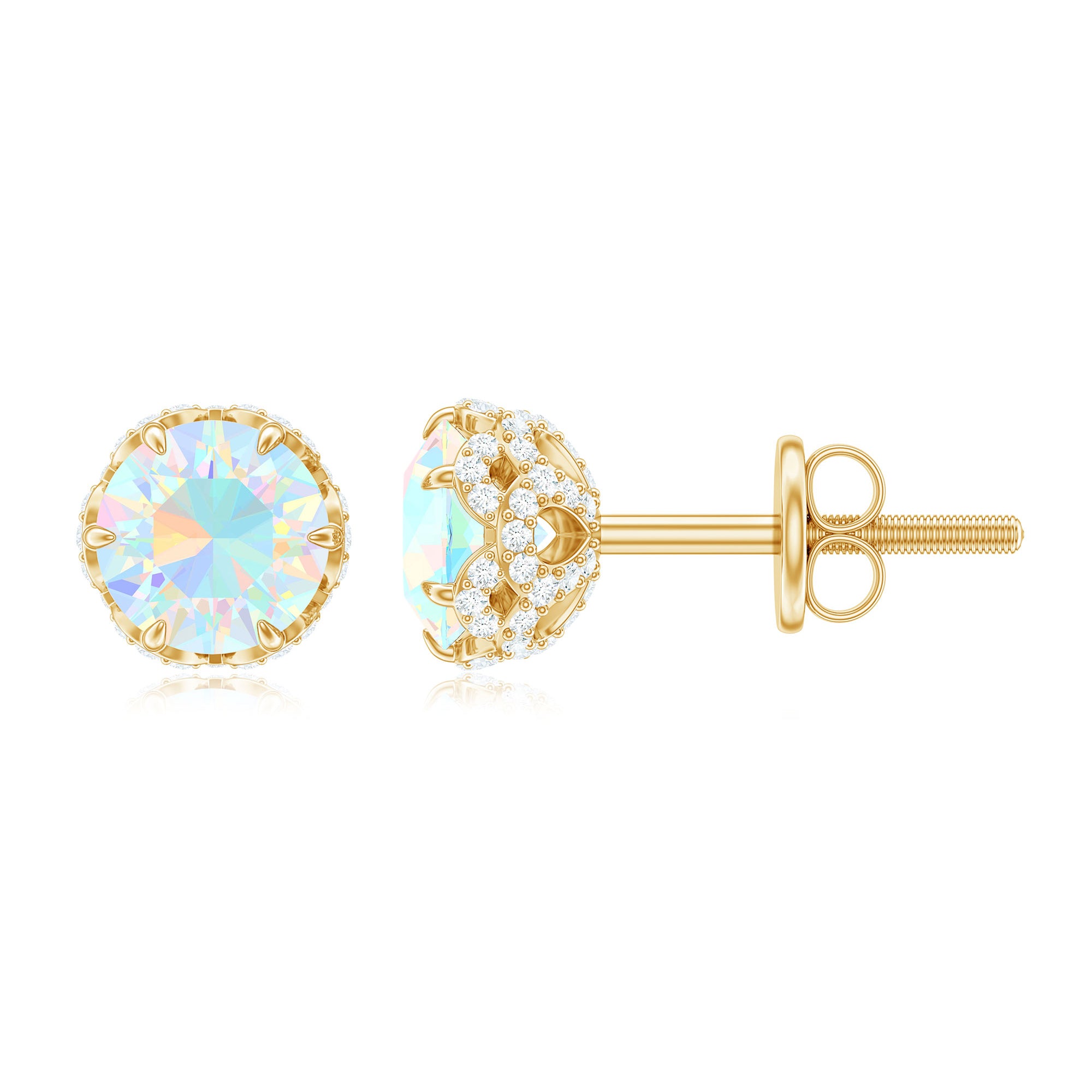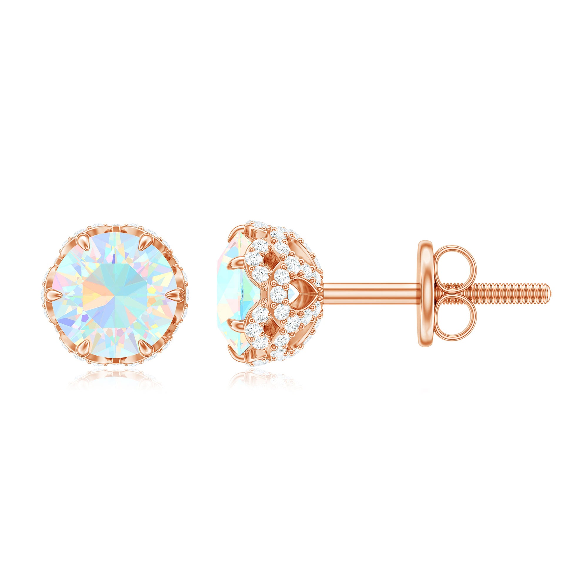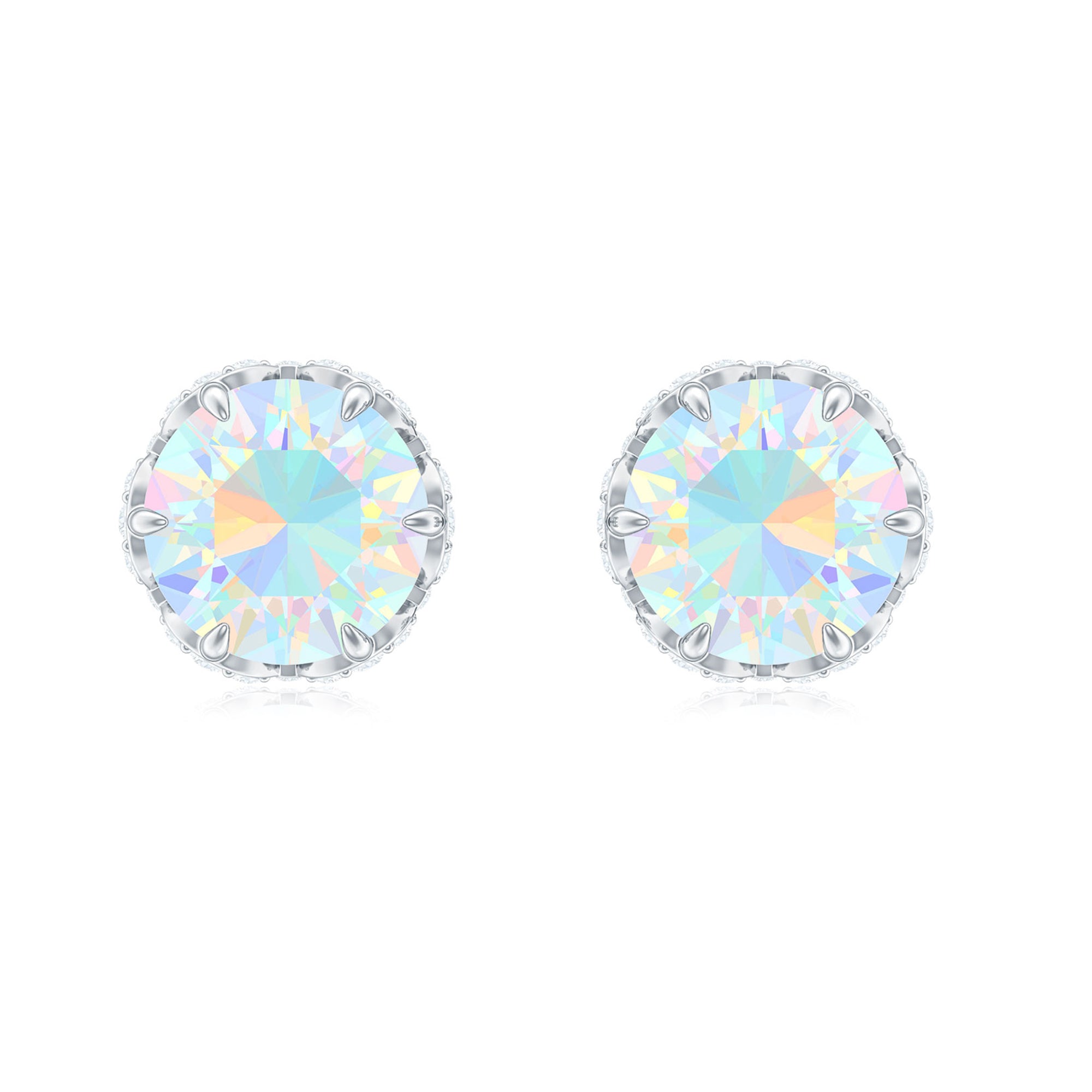 This Classic Stud Earring is embellished with Round Shape Ethiopian Opal set as Solitaire and Diamond in Decorative Pattern.