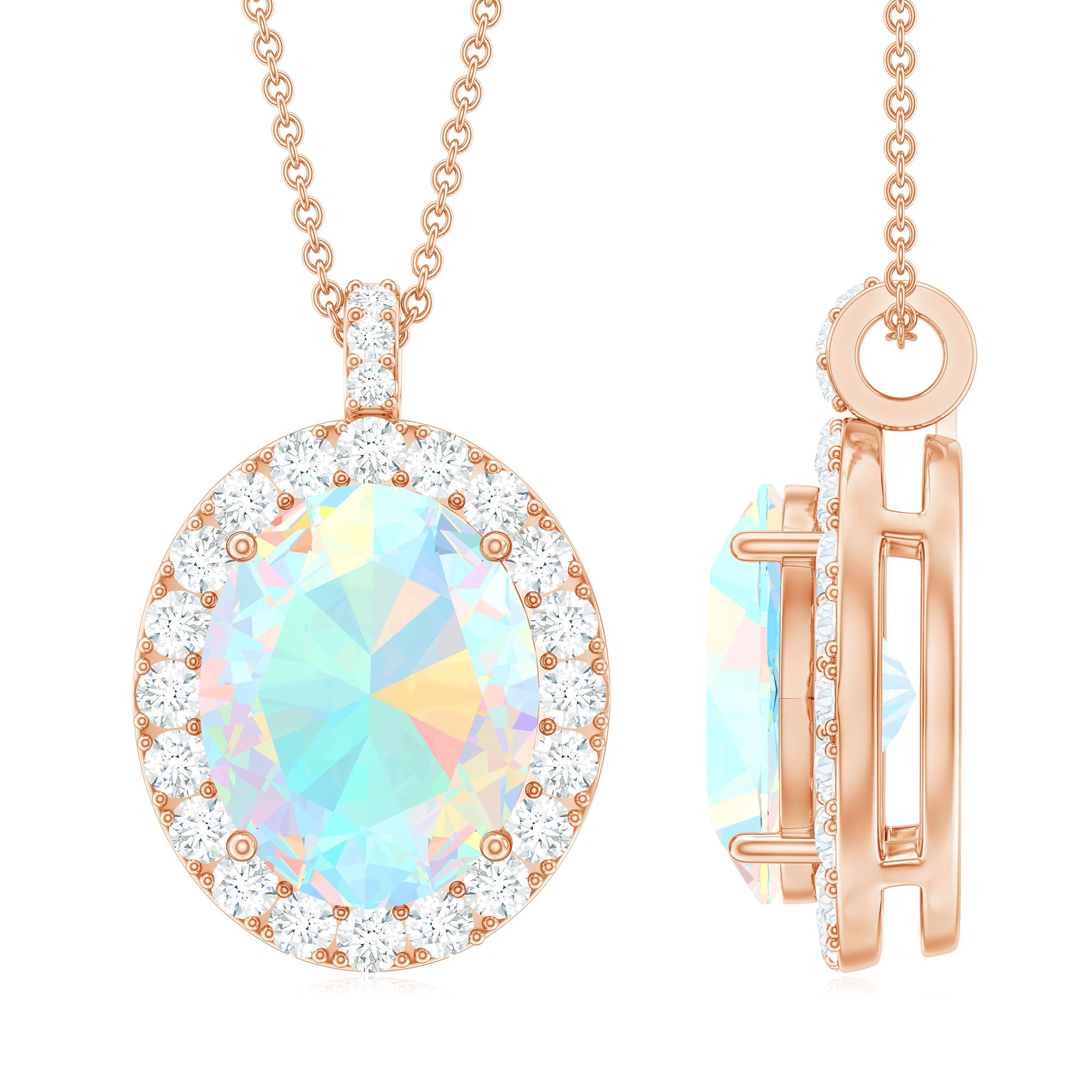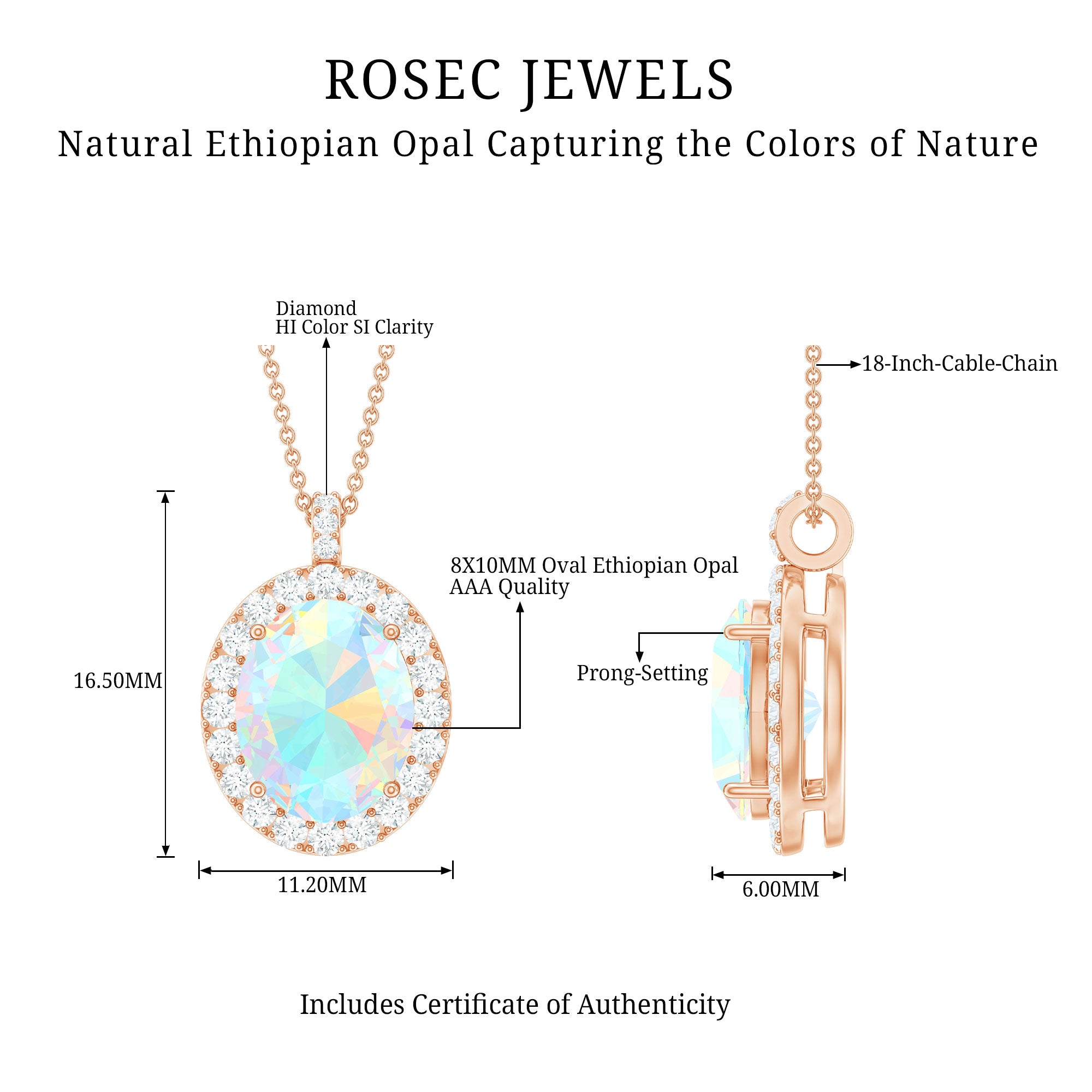 If you are looking for a way to enhance your appearance and showcase your style, this Opal Pendant Necklace is a great choice. It features an Oval Shape Ethiopian Opal in Prong Setting with a Halo of Diamond creating a stunning and unique design. The Opal gemstones are of exceptional quality and flash and glow in the light, making them perfect for daily wear. Having a AAA Quality, of the Opal it ensures its preciousness. Hanging just above your heart, this piece is sure to catch your eyes and make a lasting impression on anyone who sees it.