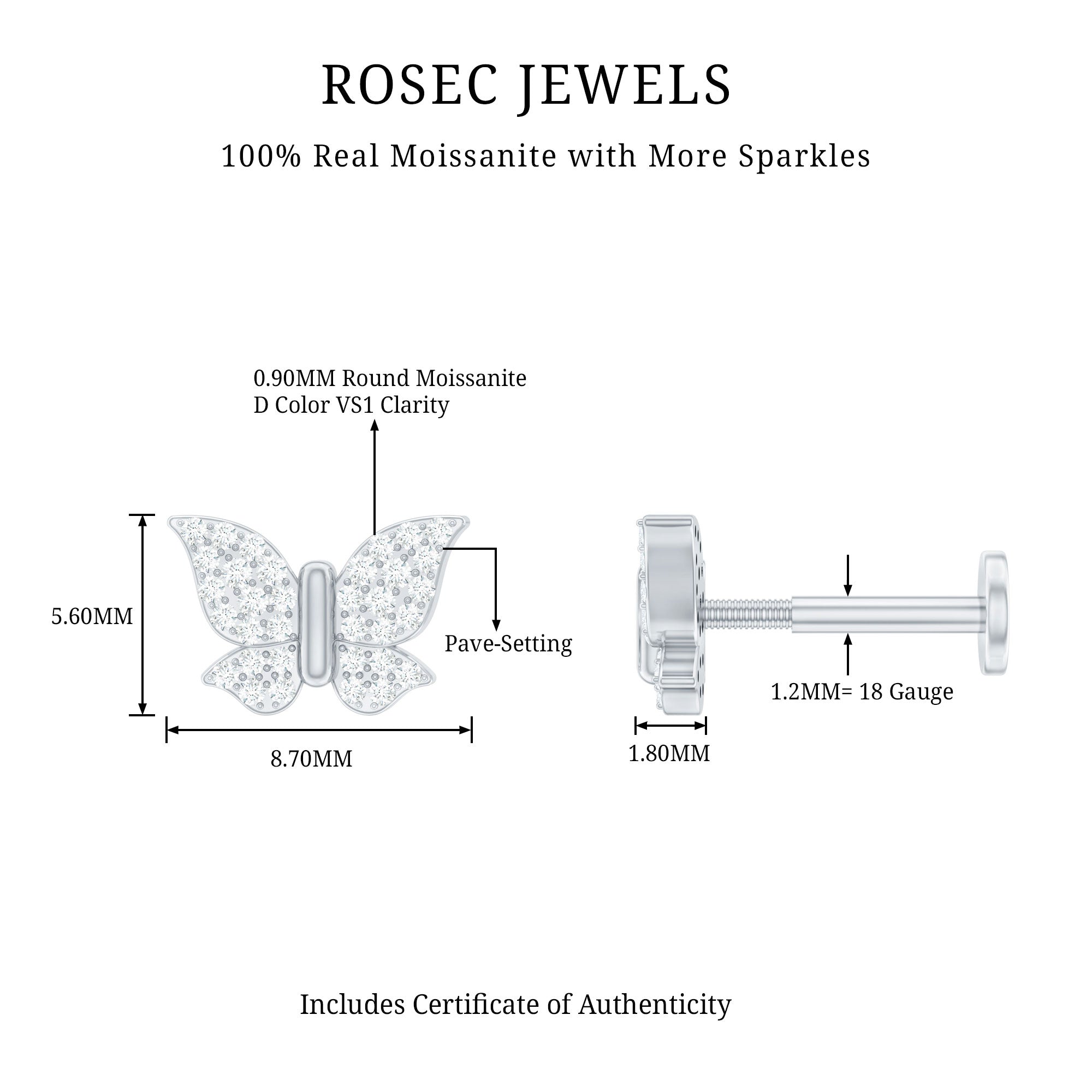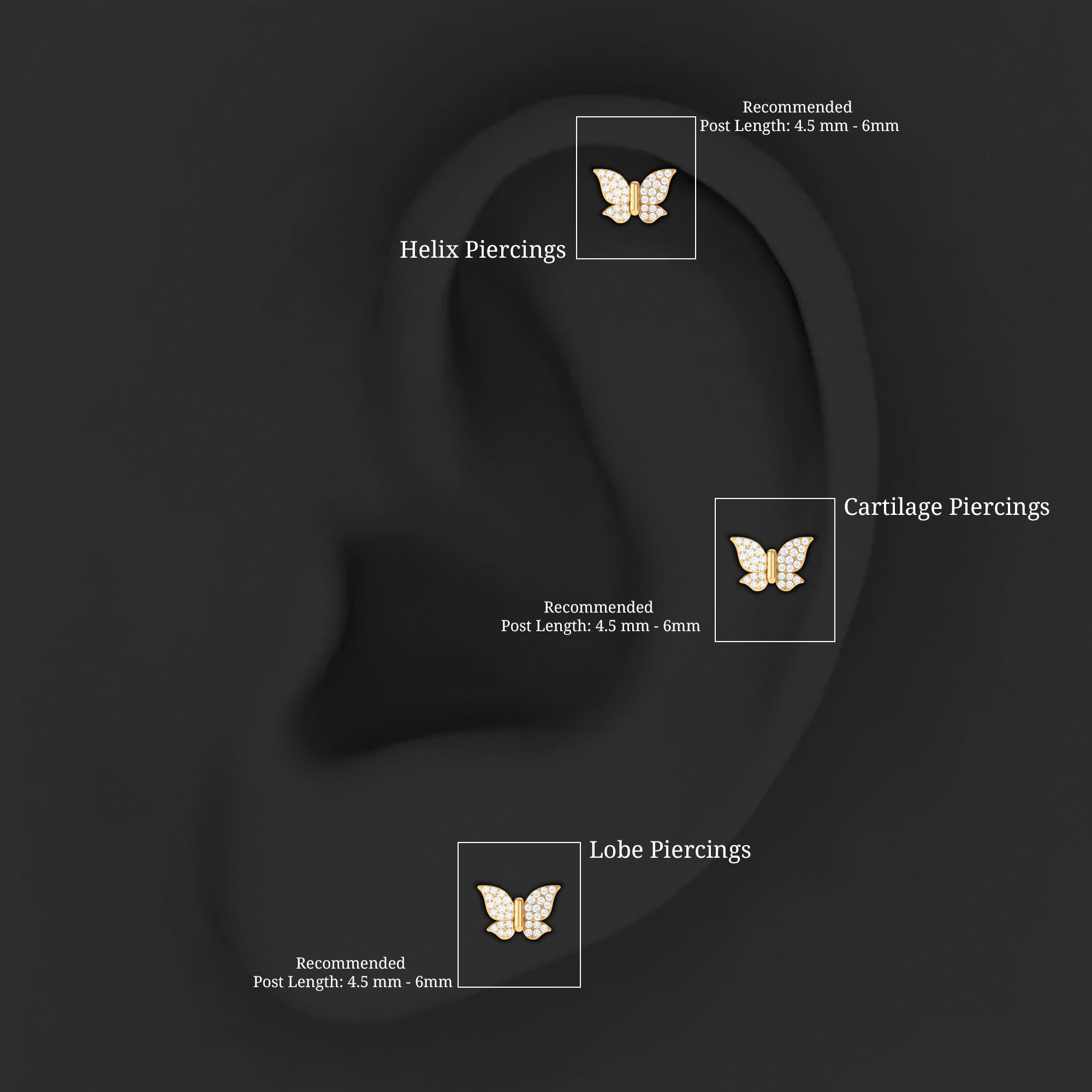 Add a little flutter to your style with a charming Butterfly Earring that sparkles with delicate beauty. Round cut moissanites are set in secure pave setting, forming a tiny butterfly that glows from every angle. Perfect for a forward helix piercing, the Moissanite Ear Piercing Earring sits comfortably and securely, making it ideal for everyday wear or special occasions. A flat back closure keeps it in place while preventing irritation, so you can wear it all day without worry. Lightweight and dainty, the design is perfect for anyone who loves cute and meaningful jewelry pieces. Worn alone or paired with other earrings, the sparkling moissanites add a graceful glow that catches the eye. Every detail is carefully crafted to highlight the butterfly’s elegance while keeping the style simple and wearable. Presented in a beautiful box, the Butterfly Cartilage Earring makes a sweet gift for birthdays, anniversaries, or just to treat someone special.