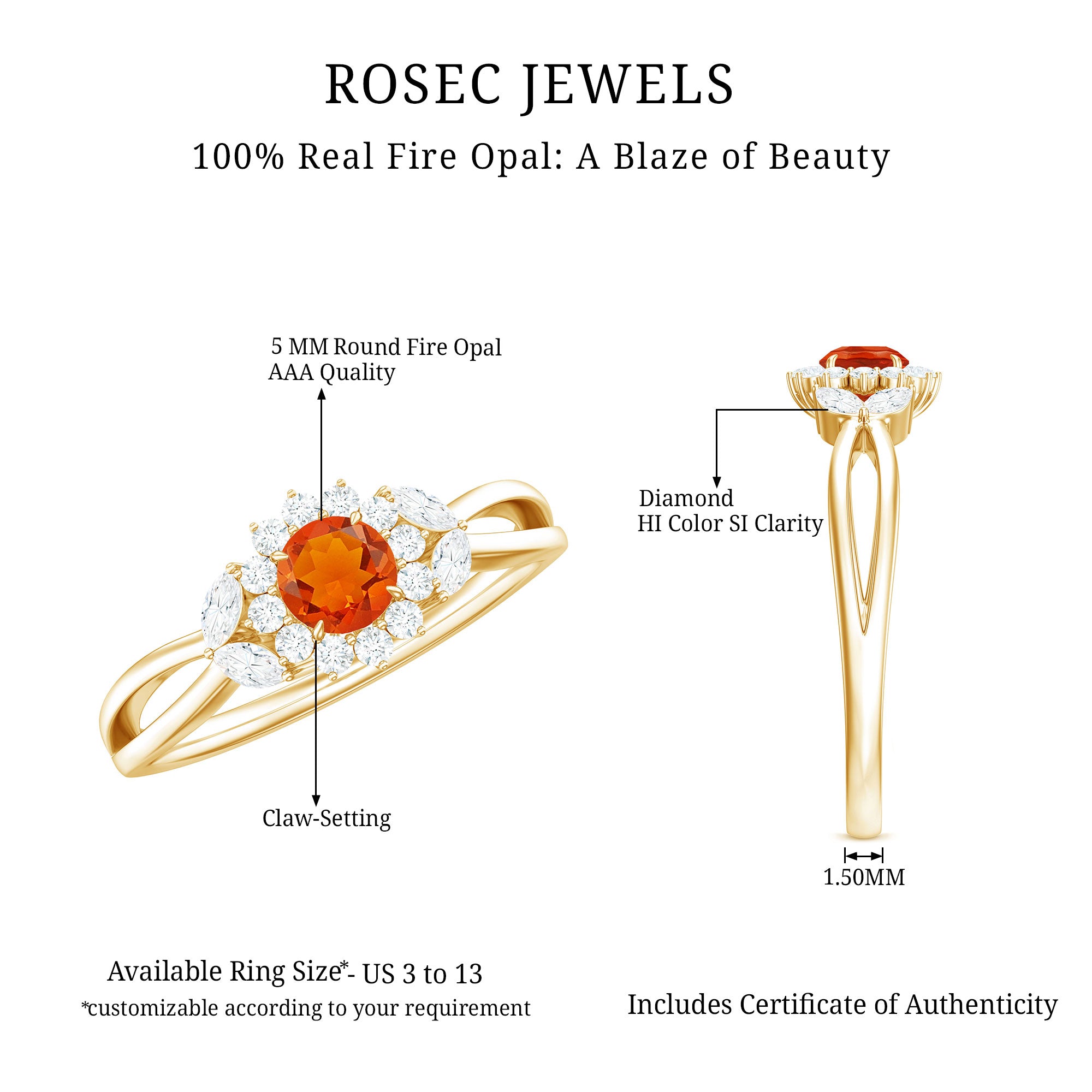 This breathtaking Flower Ring, designed by a skilled artisan and crafted from solid gold metal, is a true masterpiece. The centerpiece of this ring is a stunning Round Shape Fire Opal, meticulously set in a secure claw setting. The opal is surrounded by a beautiful flower design, which adds to the rings elegance and charm. The addition of Diamond accents further enhances the overall beauty of this piece of jewelry. This Opal Flower Ring is the perfect gift for someone special on their special day and is sure to leave a lasting impression.