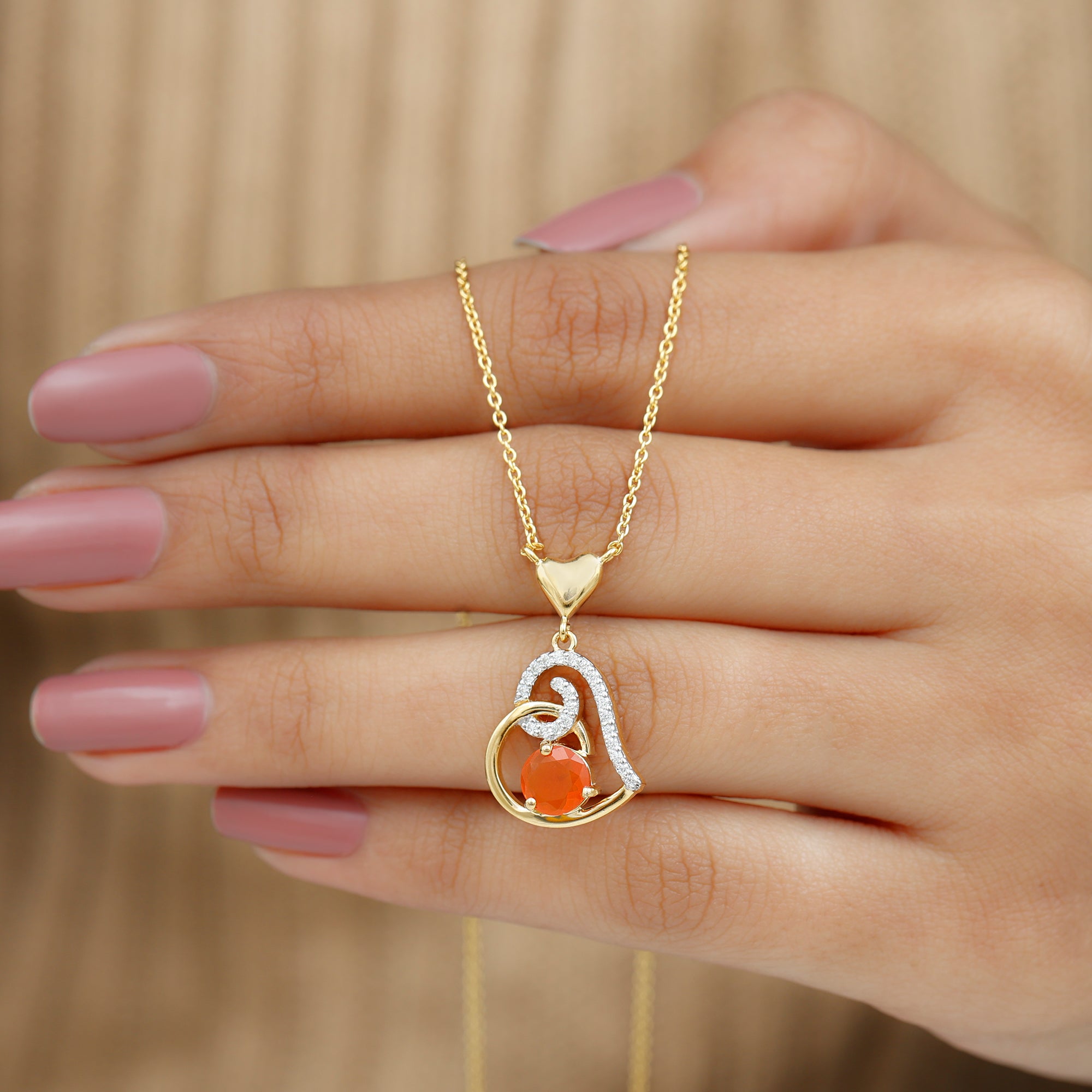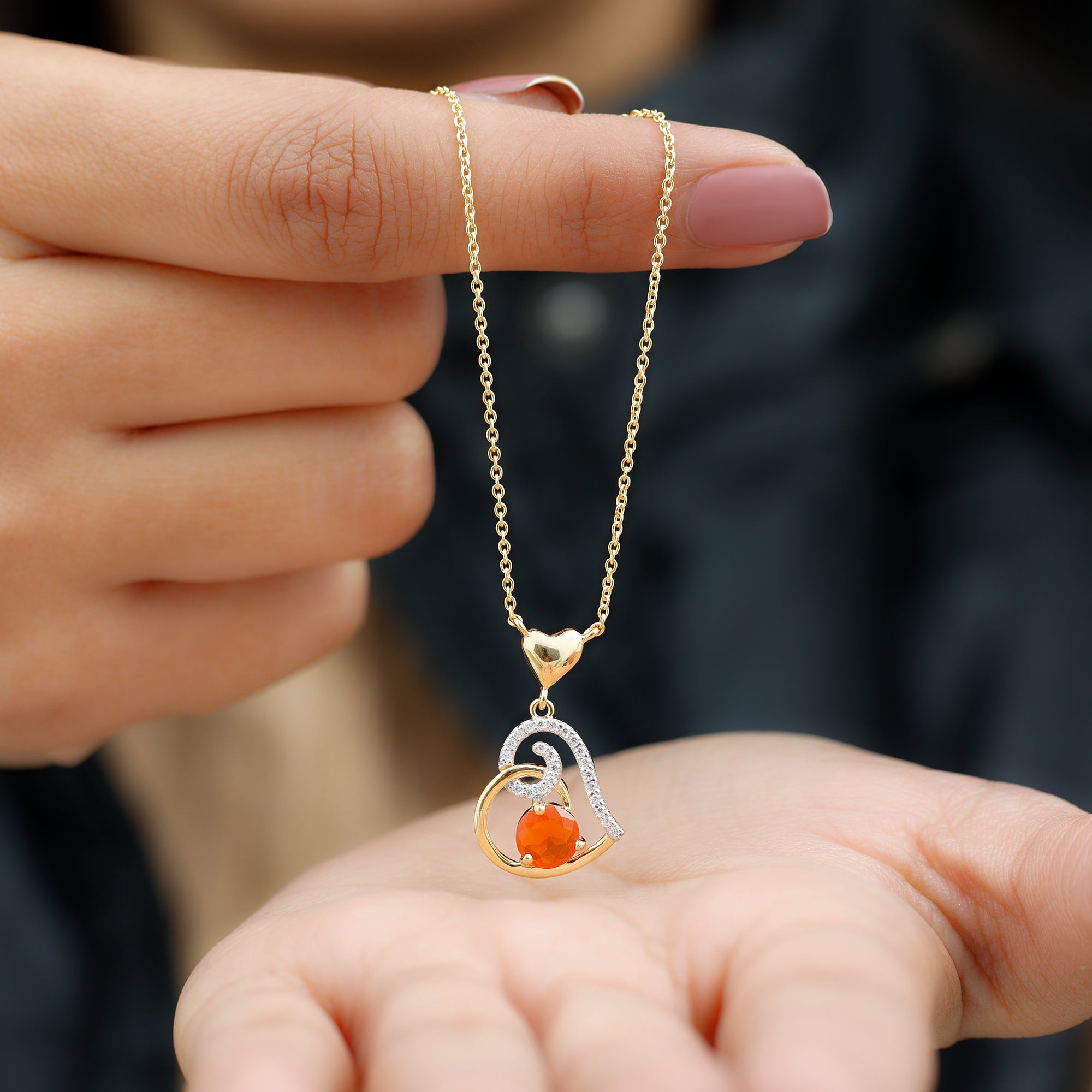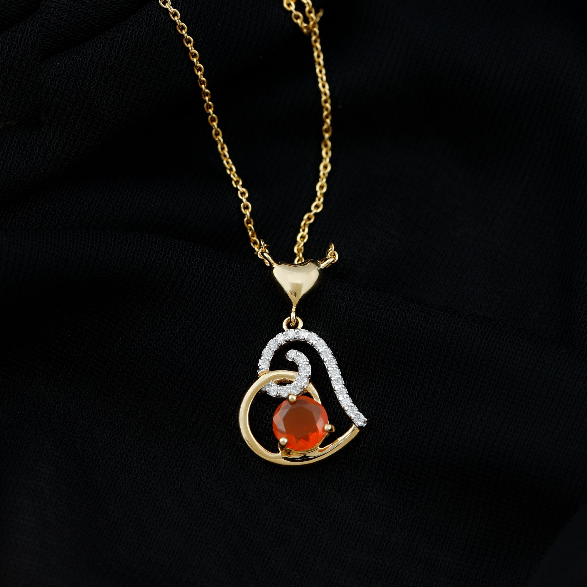Be Dazzle with these beautiful Heart Drop Pendant embellished with Round Shape Fire Opal as Solitaire in 3 Prong Setting and Round Shape Diamond in Prong Setting, Crafted in Solid Gold.