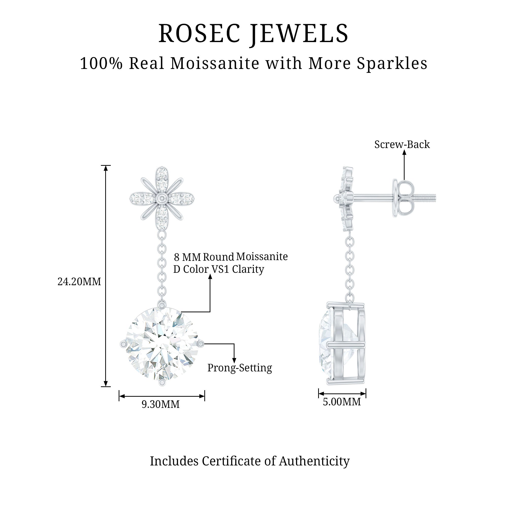 Adorn with these Moissanite Dangling Earrings that perfectly complement your look for the special day. These sparkling earrings feature an 8 MM Round Shape Moissanite of D-VS1 Quality securely placed in Prong Setting, dangling from the flower-like metallic motif with a cable chain. These Drop Earrings have a screw back closure which keeps them on place throughout the day. These Flower Dangling Earrings can be worn as a statement earring on the wedding day or can complete your look as a wedding guest. You can also present these Chain Earrings to someone special as a token of affection or love.