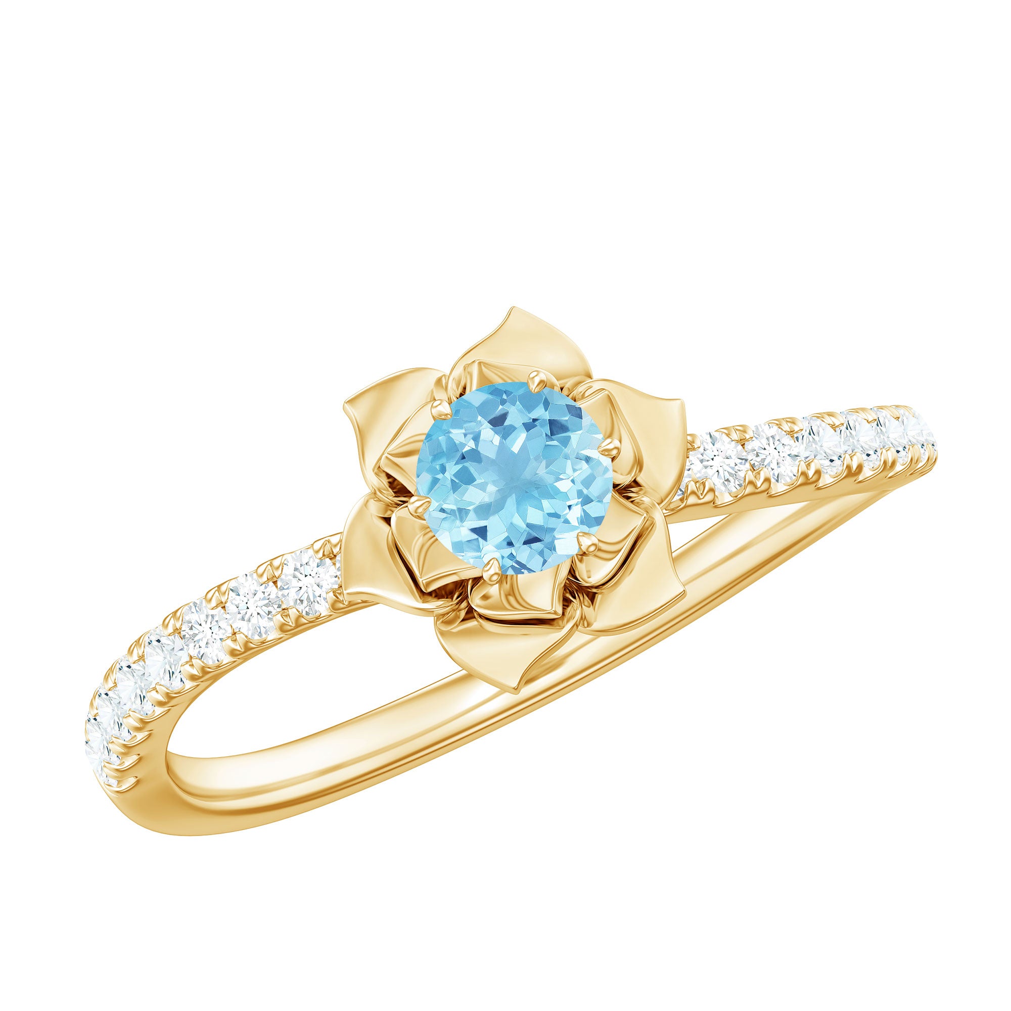The Perfect Combination of Aquamarine and Diamond in this Rose Flower Ring is mesmerizing. The Round Natural Aquamarine is set in Centre of a Gold Petals of Rose Flower in the curved shank. Get this Floral Inspired Engagement Ring for your Blooming Lady Love, this Aquamarine and Diamond Engagement Ring is a stunning jewelry, which she will cherish her whole life.