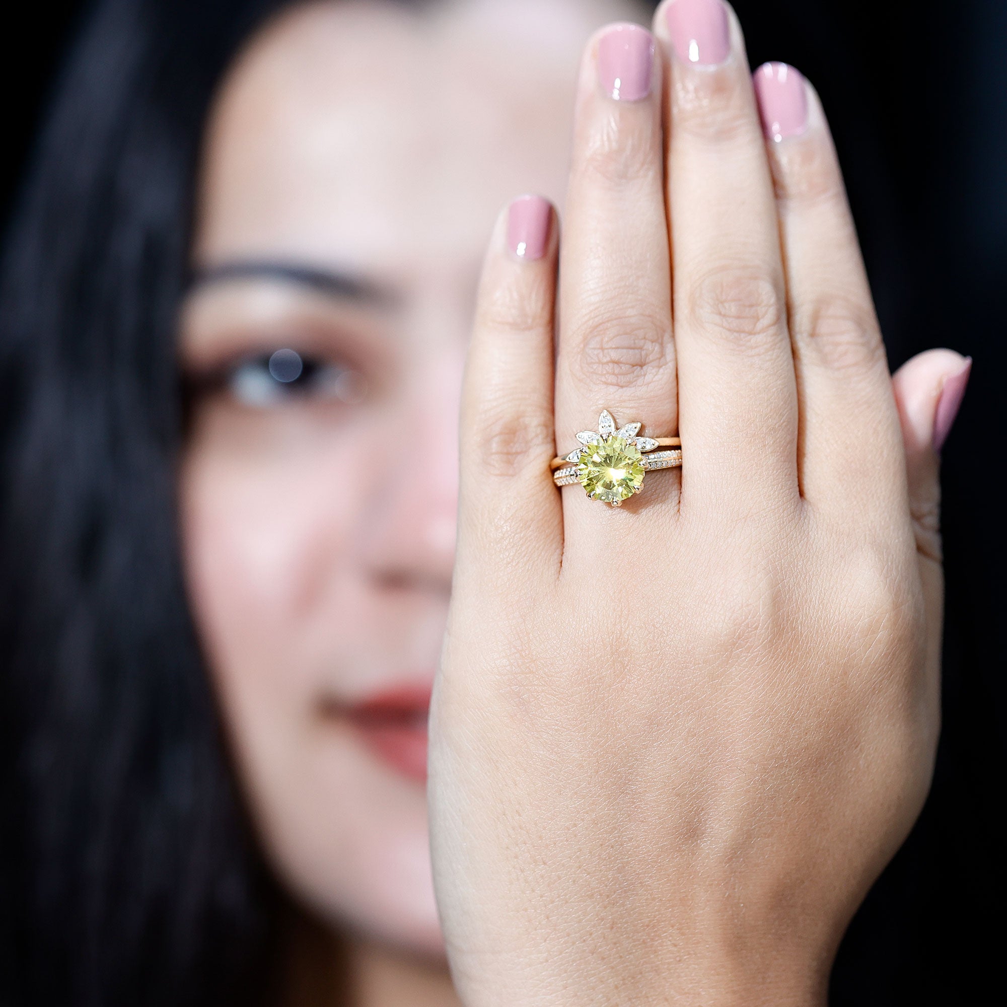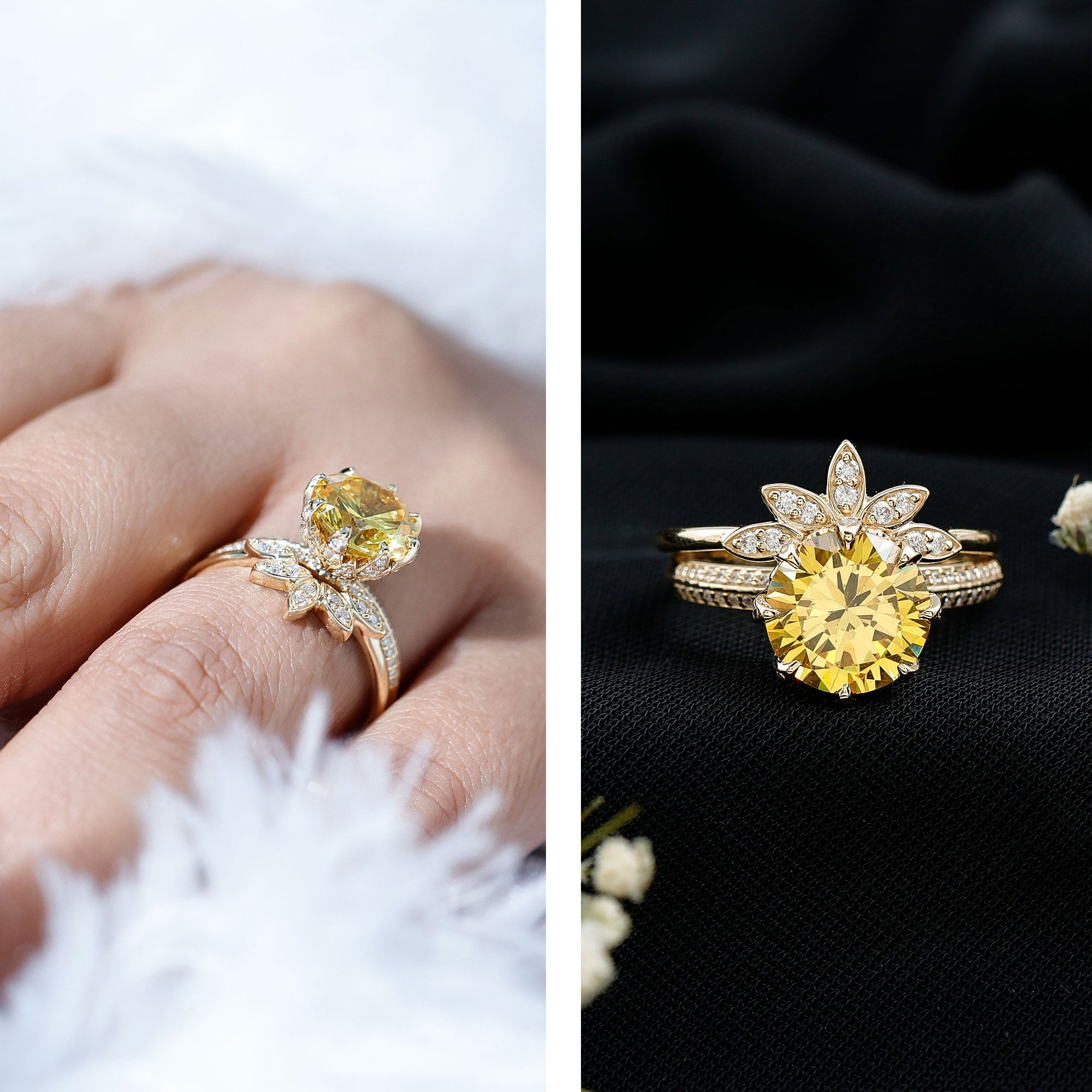 This exquisite Lab Yellow Sapphire Ring Set is truly a one-of-a-kind piece that is sure to capture your heart. This ring set features a stunning 10mm Round Shape Lab Created Yellow Sapphire at the center, nestled within a flower design accented with Moissanite pave petals. The sides of the ring are adorned with brilliant cut Moissanite, making it a perfect Wedding Ring Set for the modern bride. Behold the beauty of the Lab Yellow Sapphire Engagement Ring Set, a truly exceptional piece that she will never want to take off. This Floral Engagement Ring Set will add a touch of beauty and elegance to your special day. Sapphire is also associated with the September birthstone.
