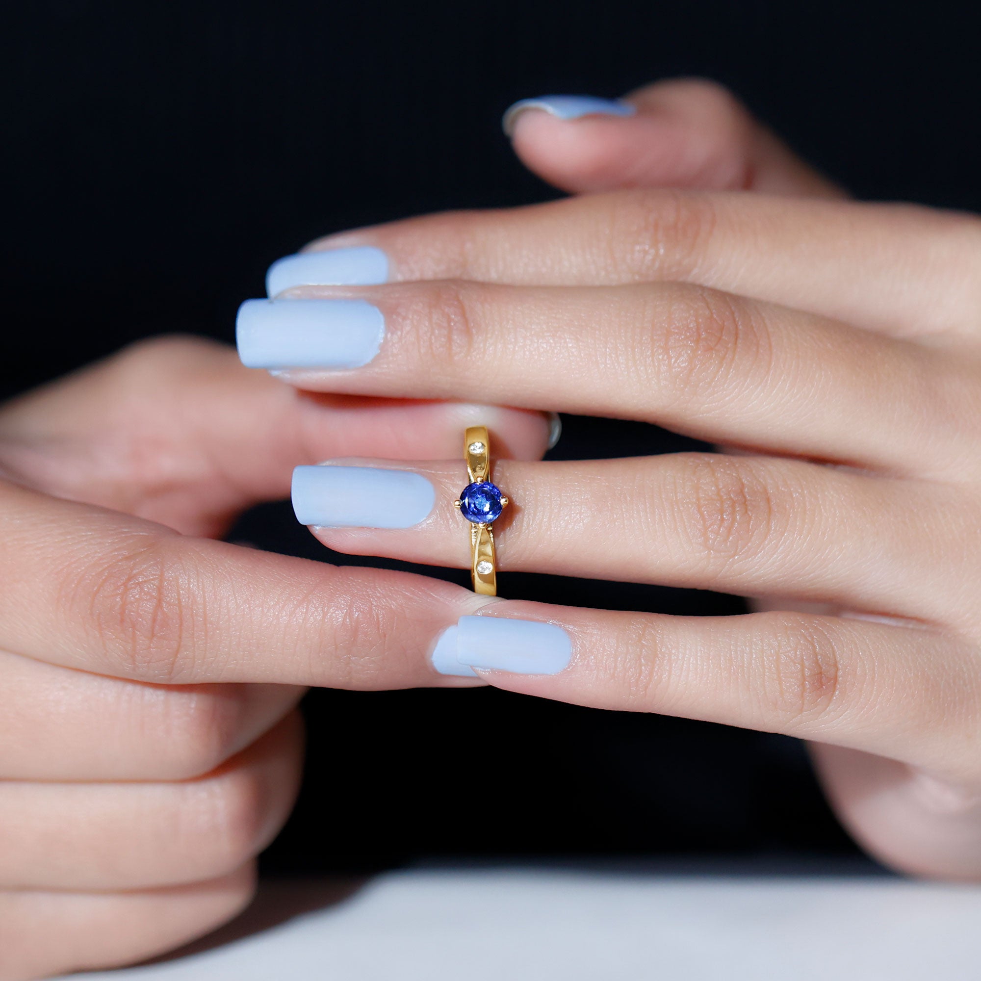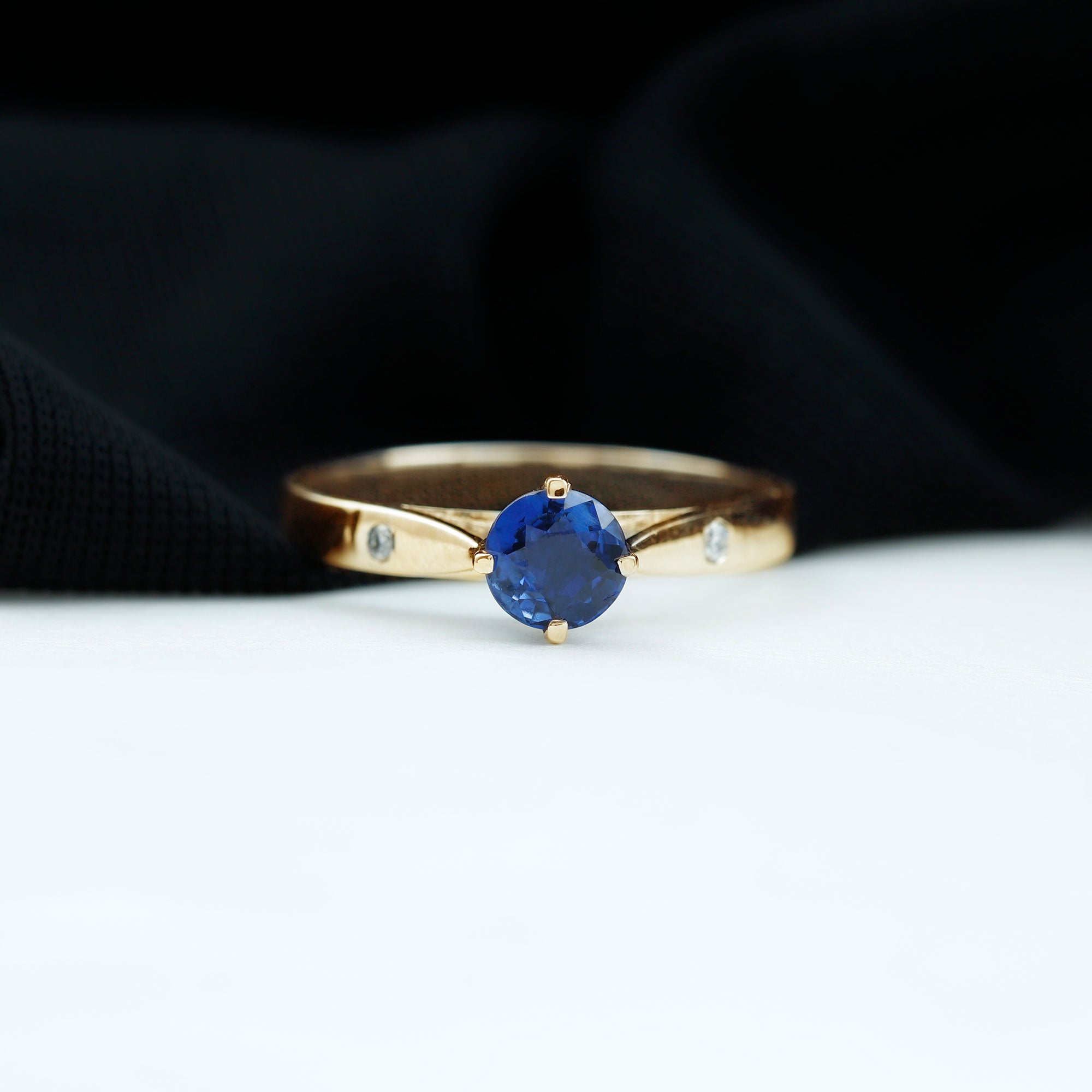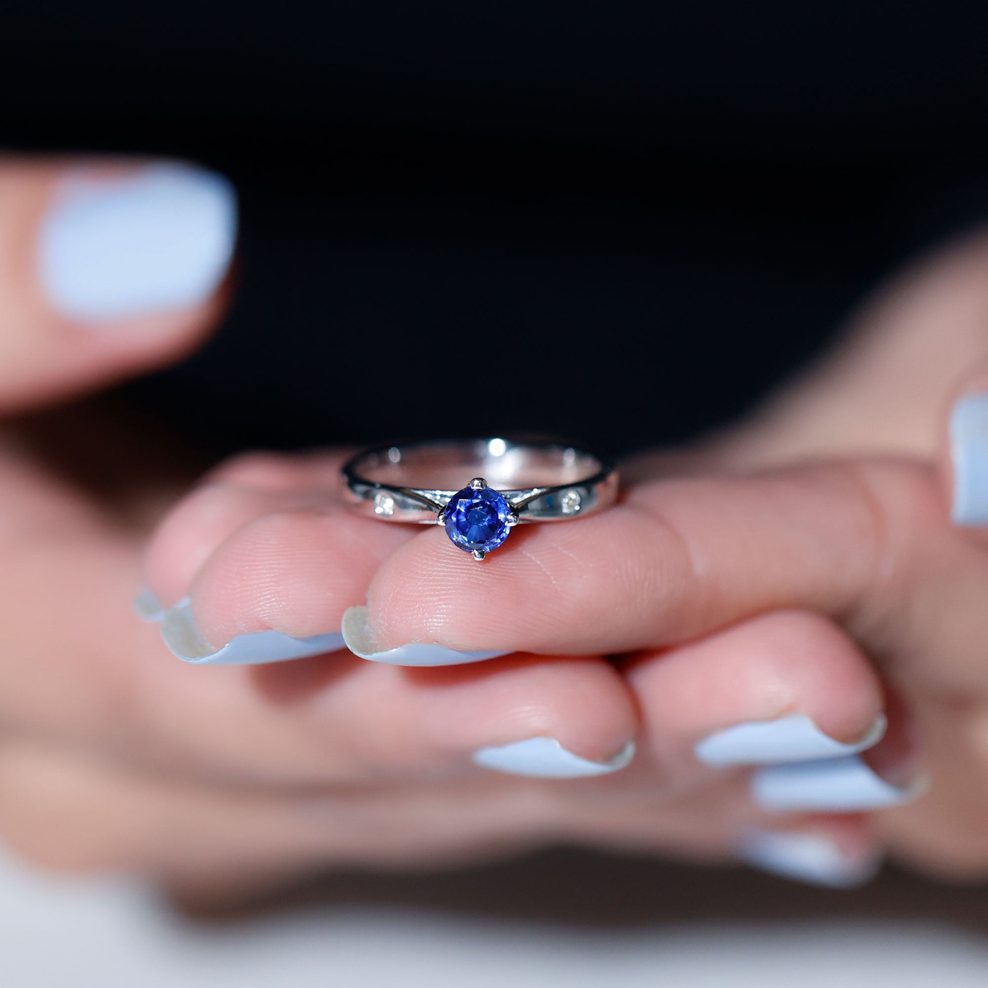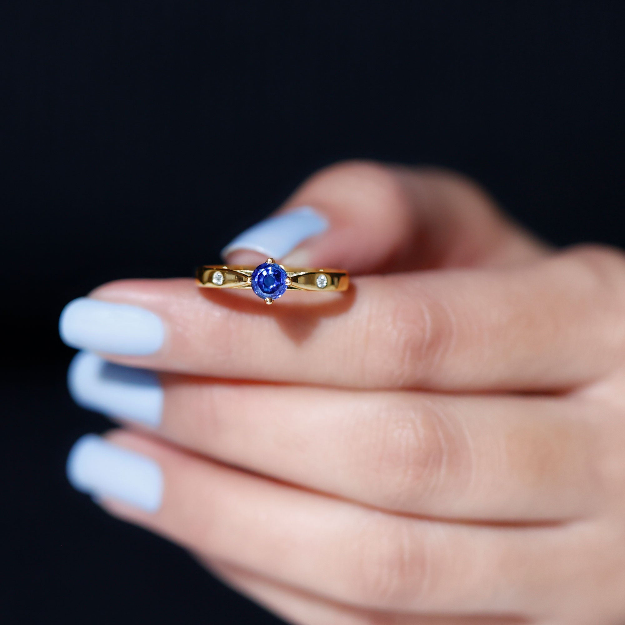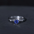 Embrace a subtle yet regal touch with this exquisite Created Blue Sapphire Ring. Featuring a round-cut created blue sapphire delicately set in a beautiful floral arrangement and round Diamond on either side, this solitaire ring exudes timeless elegance. Its understated charm makes it a perfect choice for celebrating birthdays or expressing your love on Valentines Day. Embrace the enchanting allure of this ring as you convey your heartfelt sentiments with grace and sophistication.