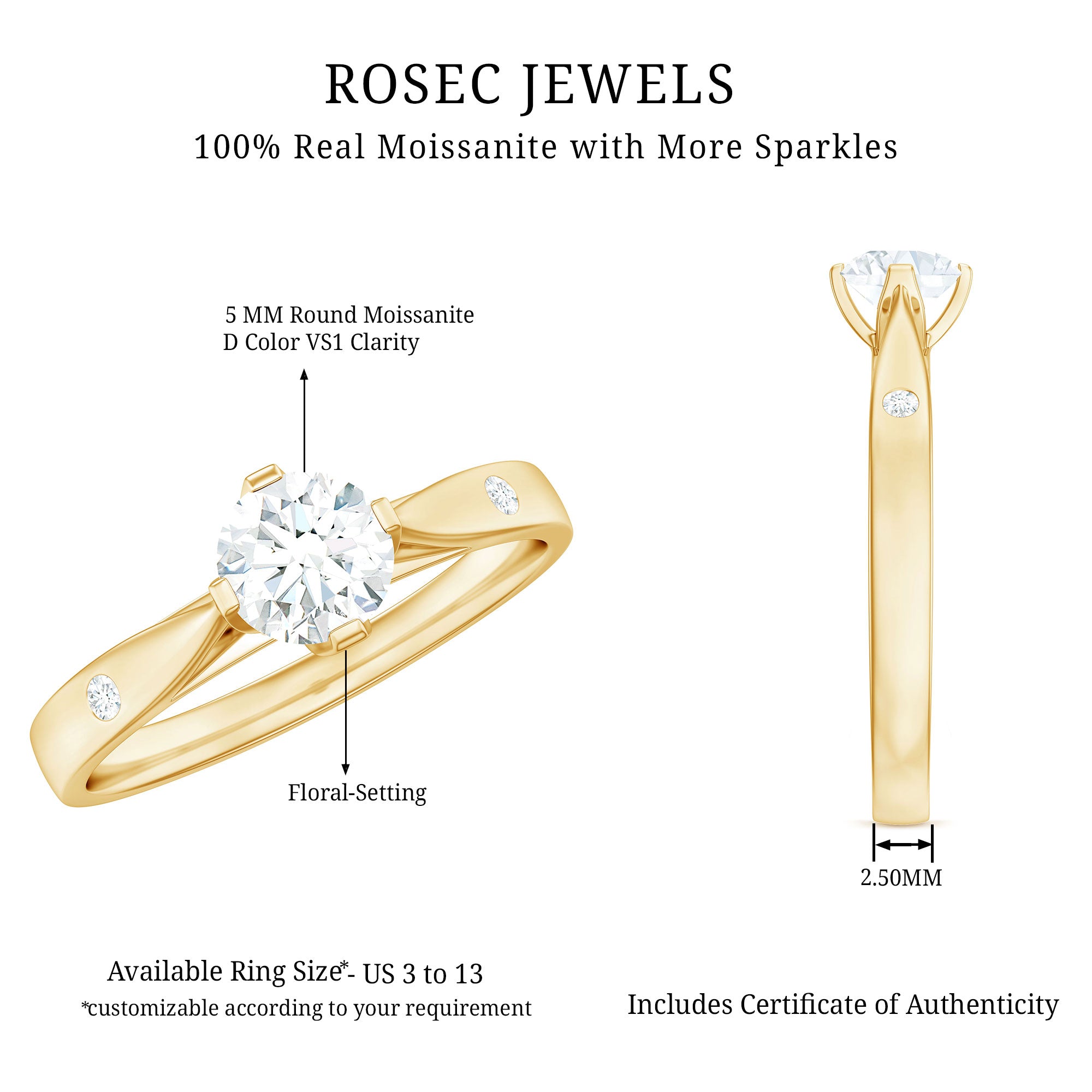 Who says a ring can not capture attention and hearts? This Solitaire Moissanite Ring proves it can, with just the right mix of charm and sparkle. At the center sits a 5 MM round moissanite of D color and VS1 clarity, set in floral setting that brings out its natural brilliance. The polished pinched band adds to its modern and elegant look. On each side of the center stone, a small moissanite is flush set into the band, adding a touch of sparkle without overwhelming the design. It is a simple but thoughtful detail that makes the Moissanite Promise Ring for Her feel more personal and refined. Perfect for a promise ring, a proposal, or even as a daily reminder of love, this design speaks to those who enjoy classic style with just enough shine. It is a beautiful way to show commitment, love, and a connection that feels true. Giving a Pre Engagement Ring is a memory, a moment, and a promise for the future. This Commitment Ring makes that moment feel even more special. Made for women who love timeless beauty with a modern touch, the design is both graceful and full of meaning.