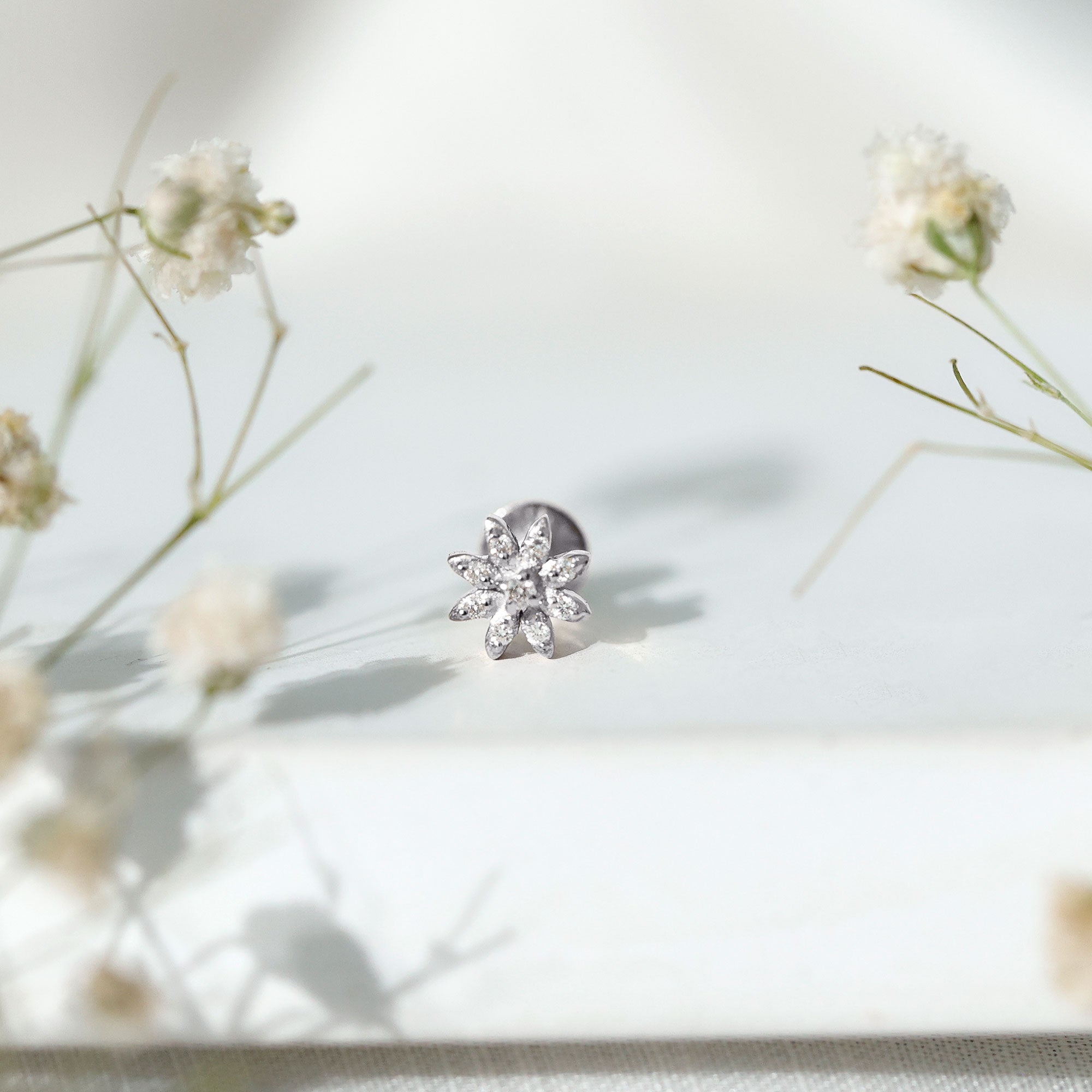 Make a statement with your unique style by wearing this exquisite Flower Nose Stud and receive endless compliments. Meticulously crafted from high-quality metal, this stunning Diamond Nose Stud showcases a beautiful floral design adorned with Round Cut Diamonds set in prong setting. Its intricate details and impeccable craftsmanship make it the perfect accessory to wear every day as a stunning piece of Body Jewelry. Flaunt your individuality and elevate your look with this exquisite Nature Inspired Jewelry that is sure to turn heads. Apart from wearing it on the nose this dainty stud can be styled on ear piercings also such as Helix Piercing, Cartilage Piercing, and Lobe Piercing. This classic stud beholds the shine of HI-SI quality Diamonds which gives an enchanting appearance to the entire look.
