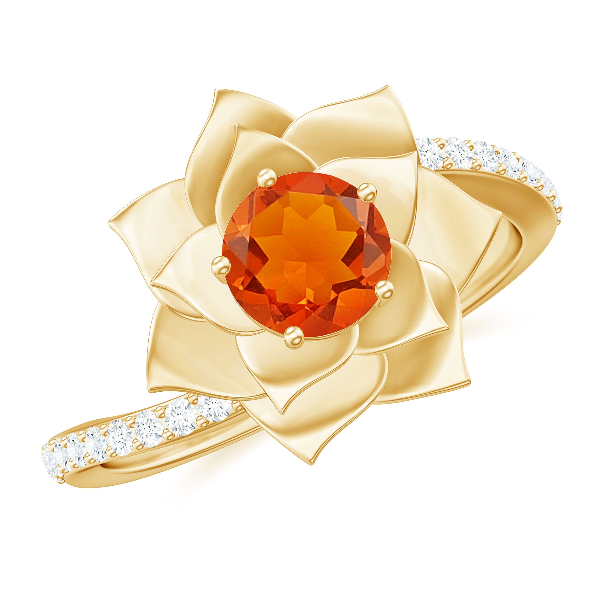 The Perfect Combination of Fire Opal and Diamond in this Rose Flower Ring is mesmerizing. The Round Natural Fire Opal is set in Centre of a Gold Petals of Rose Flower. Get this Floral Inspired Engagement Ring for your Blooming Lady Love, this Fire Opal and Diamond Engagement Ring is a stunning jewelry, which she will cherish her whole life.