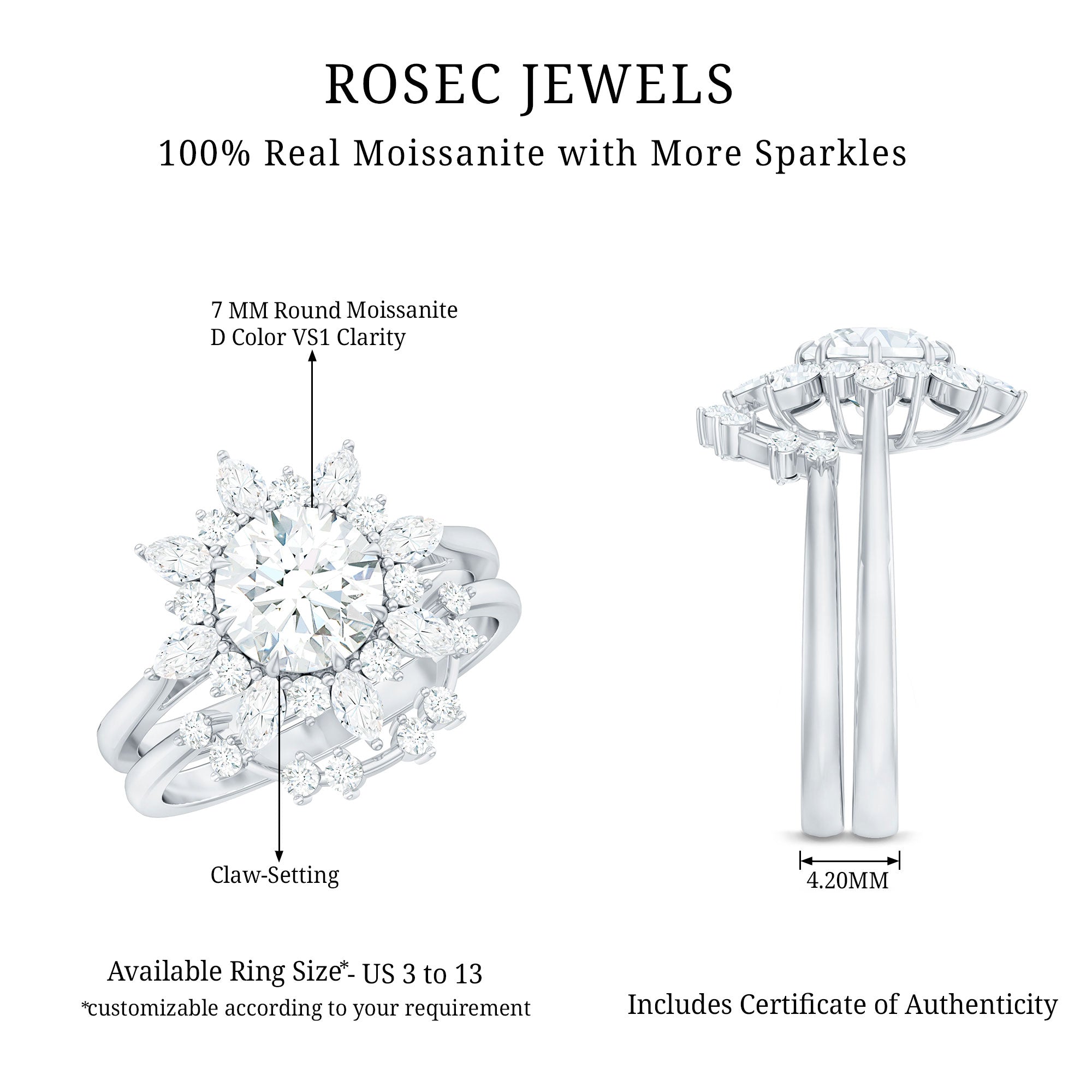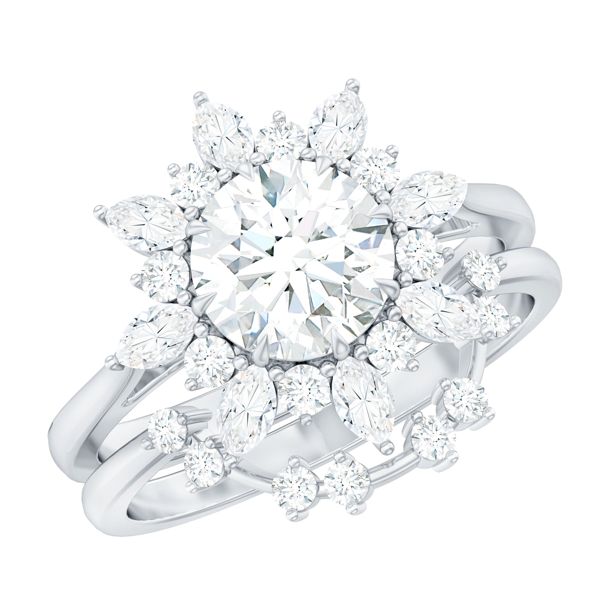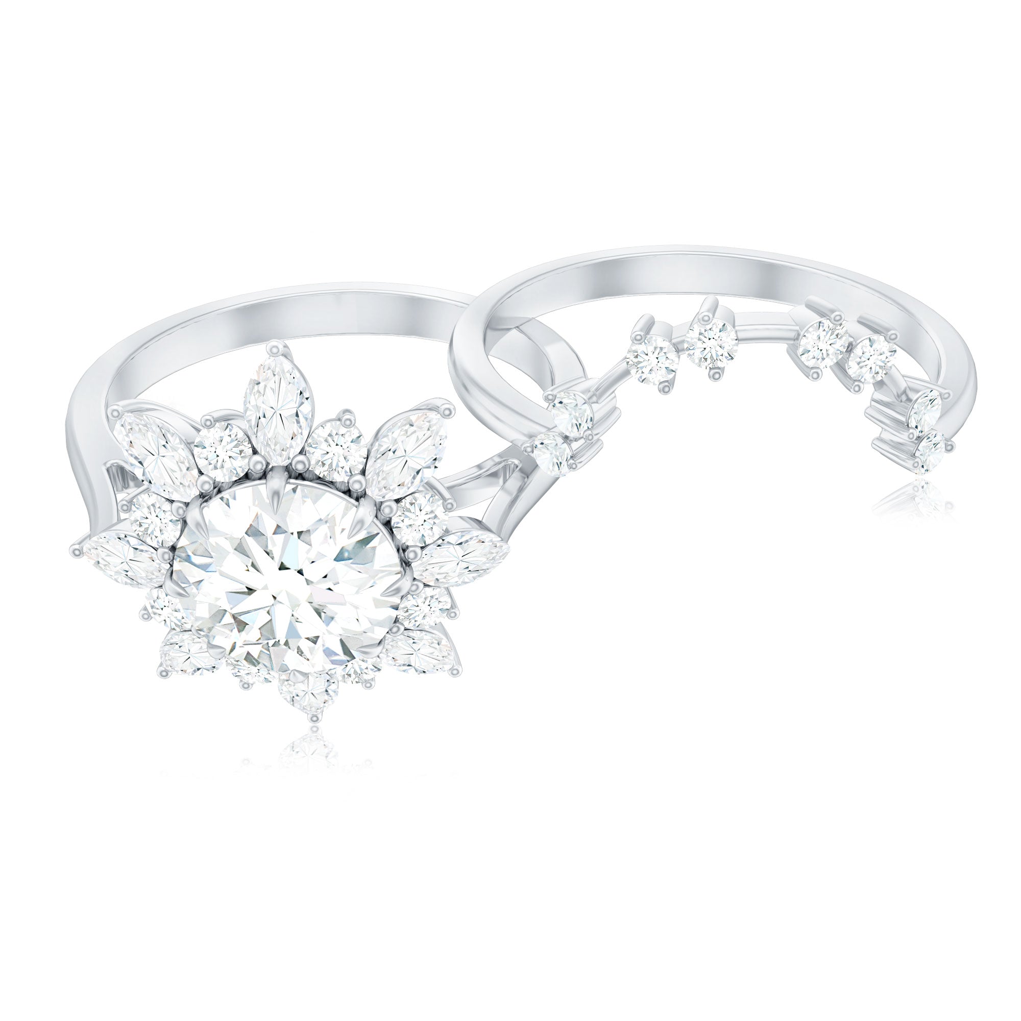 This Flower Wedding Ring Set is curated when sparkle meets elegance in the most graceful way. With a bold 7 MM round D-VS1 quality Moissanite at its center, this engagement ring is designed to bloom just like a flower in full sunlight. Surrounded by a delicate halo of marquise and round Moissanite stones, the floral inspired shape gives off a radiant effect that is both romantic and stunning. Center stone is claw set to give it maximum shine and security, while the thoughtful arrangement creates a soft, nature-inspired look that makes a big statement. The curved enhancer ring adds even more brilliance with round Moissanite stones designed to hug the engagement ring perfectly. This Moissanite Engagement Ring Set is perfect for anyone who wants something meaningful, eye-catching, and full of personality. The moissanite stones shimmer with fire and brilliance, offering an ethical and sustainable alternative to traditional diamonds, without compromising on beauty. Whether it is for an engagement, wedding, or just because love is worth celebrating, this Halo Bridal Set is made to shine, just like your forever.