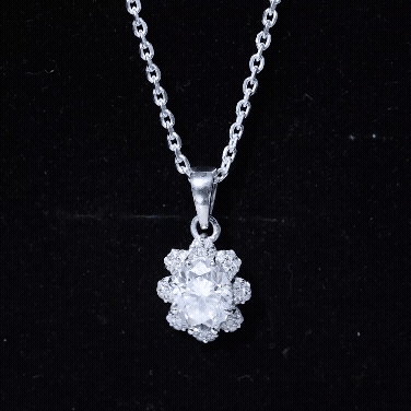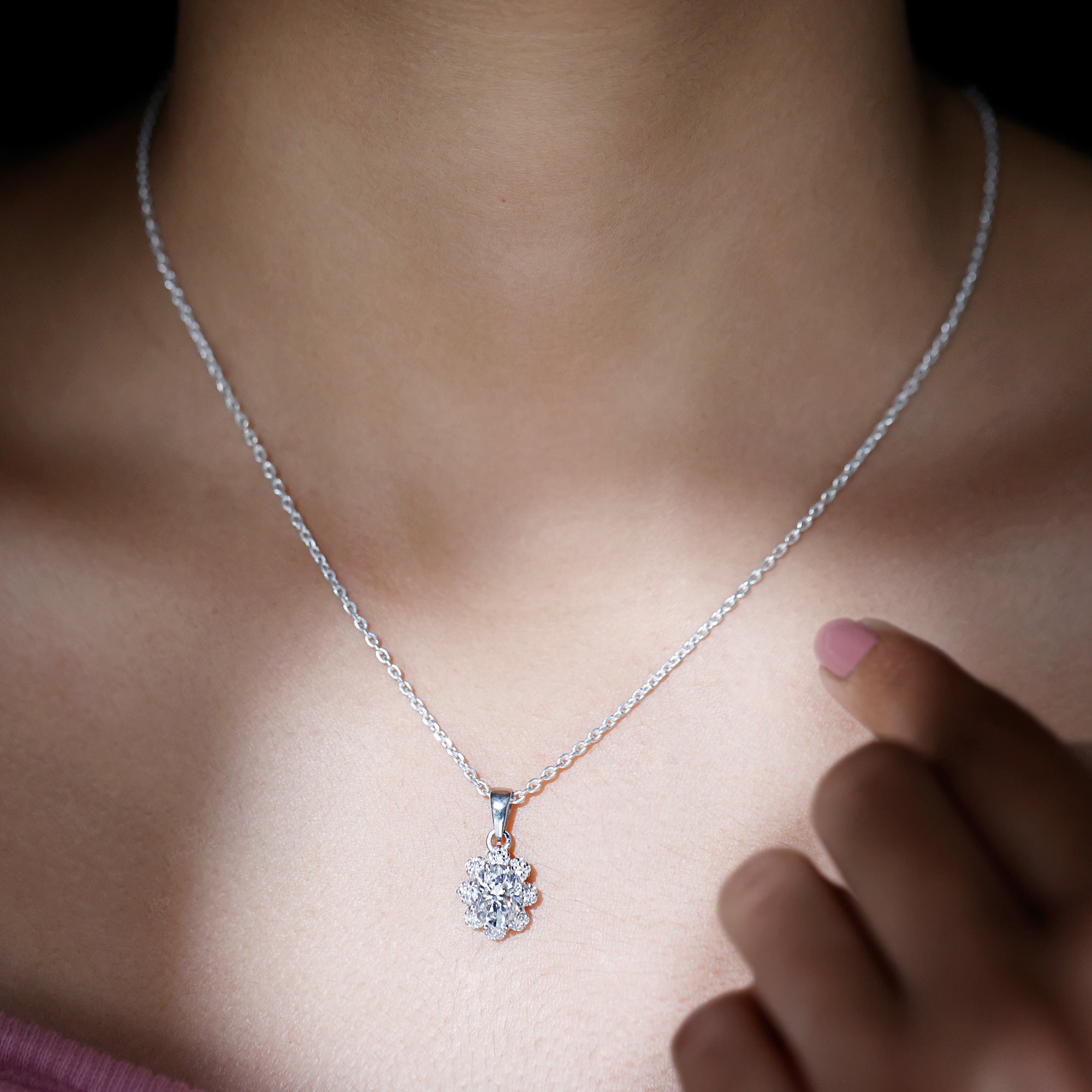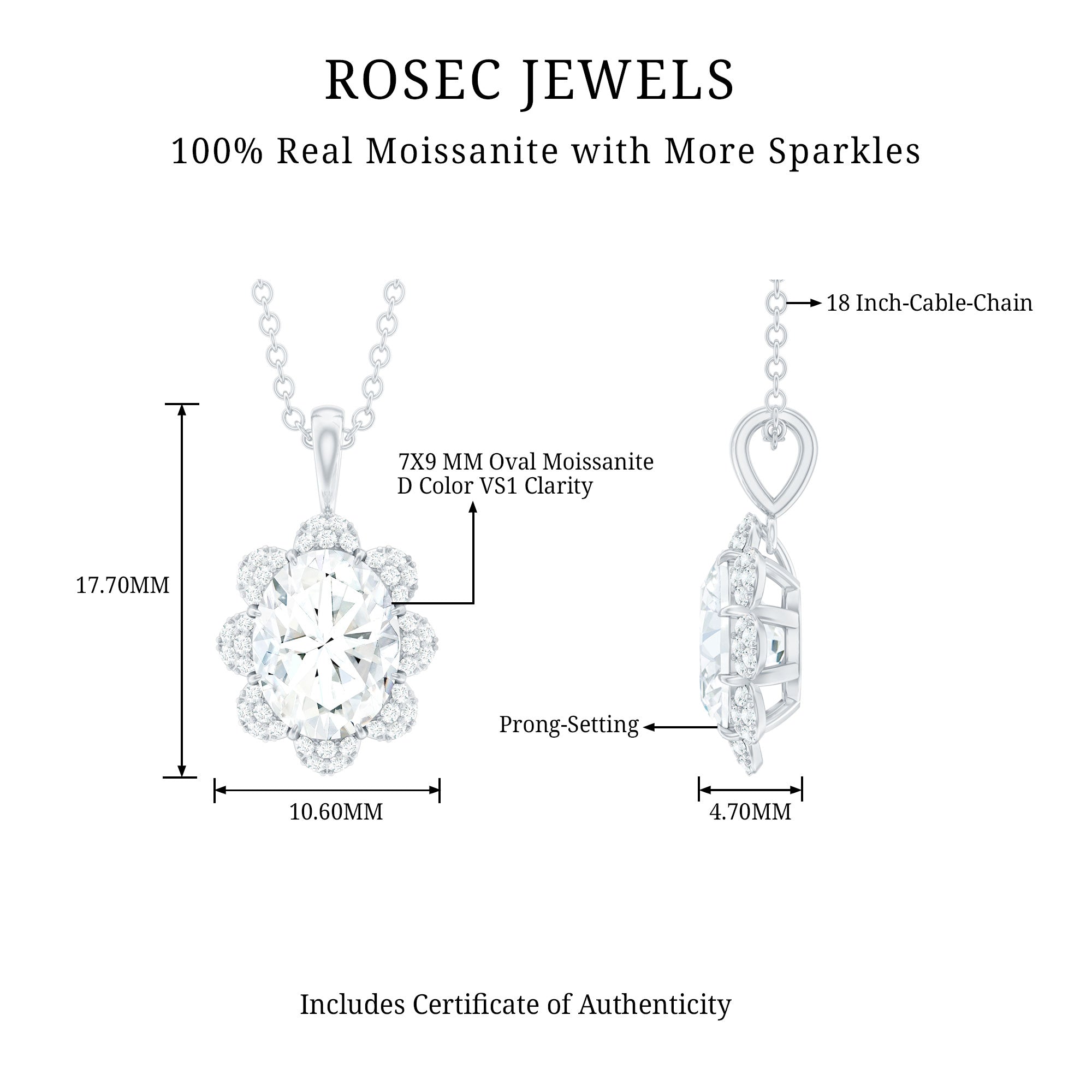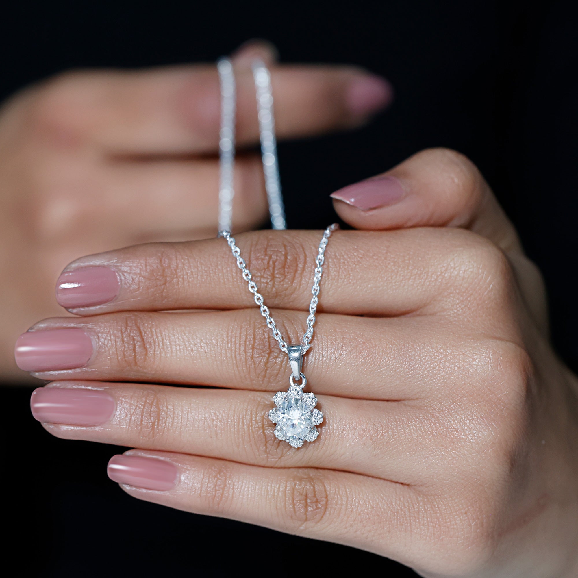 Adorn your neckline with this Moissanite Pendant, beautifully made with 14K White Gold Plated Silver. The pendant features a 7X9 MM Oval Shaped Moissanite of D-VS1 quality and adorned with smaller Moissanite cluster, making the flowers petal all around. This Floral Pendant is dangling with a standard bail through which a cable chain is passing through that has a secured Lobster clasp which also let the wearer adjust the length according to their comfort and makes it beautifully sit on the neckline. This Halo Pendant can be a thoughtful gift for your beloved on the special occasion. The pendant will be delivered to you in a premium quality packaging with a certificate of authenticity.