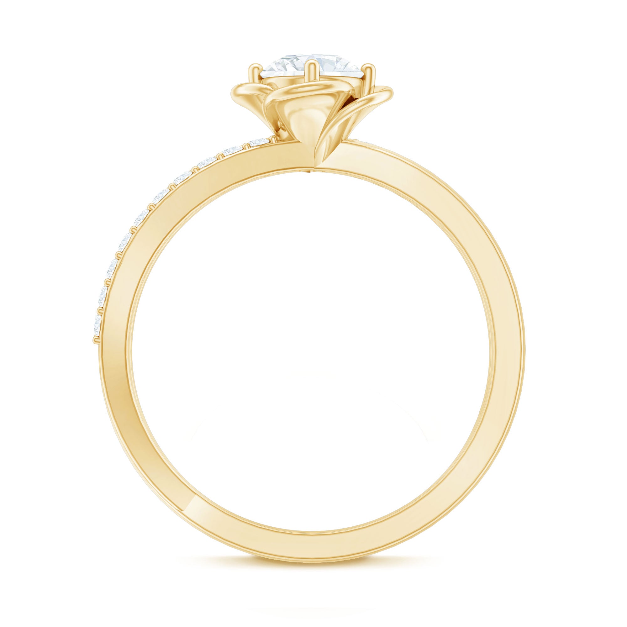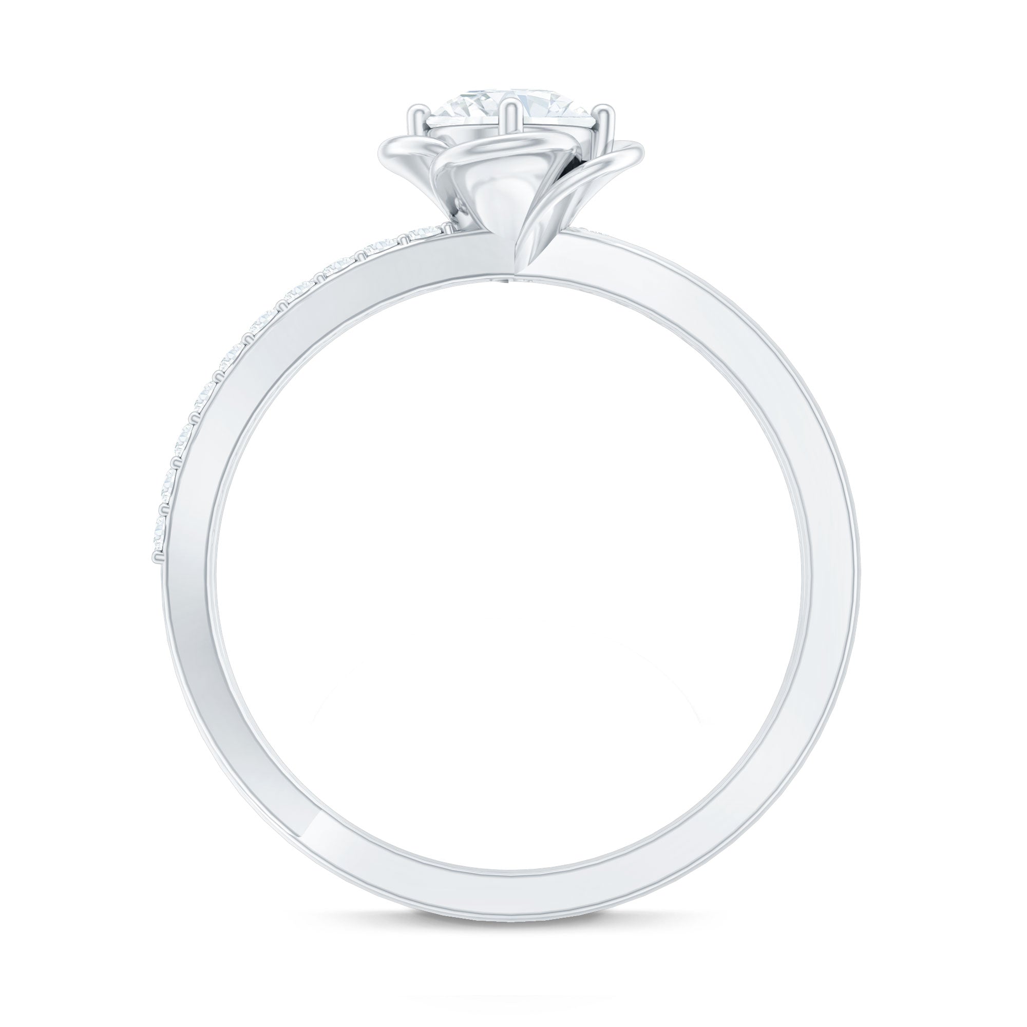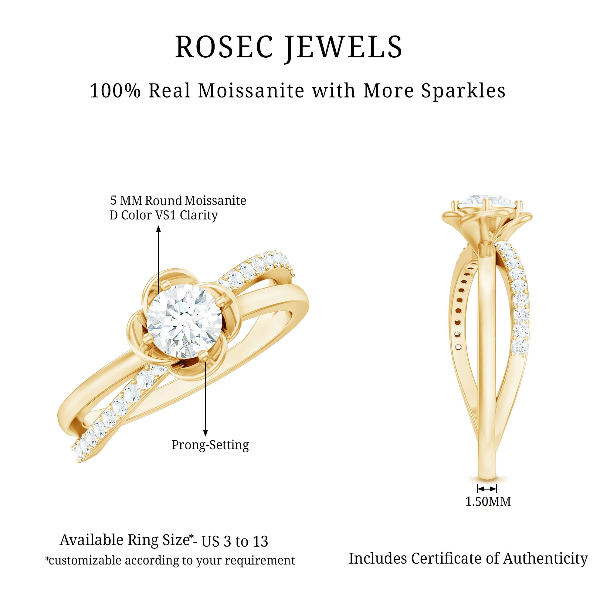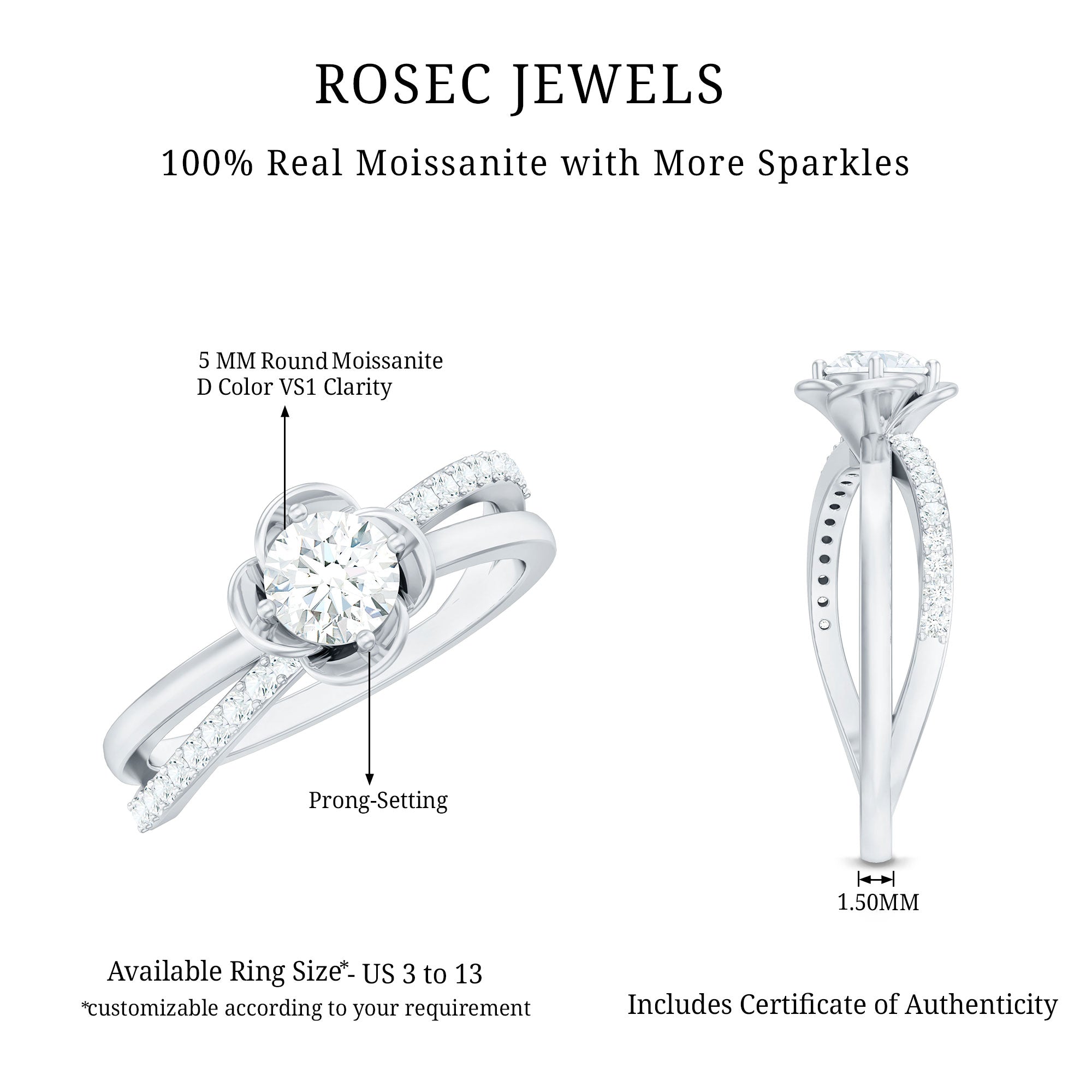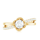 This Moissanite Promise Ring for Her brings together delicate design and meaningful symbolism. At the center, a sparkling 5 MM round moissanite shines with clarity and brilliance, cradled by prongs and surrounded by smooth flower petals. The flower motif adds a romantic, nature-inspired touch, making the Flower Ring feel tender and full of heart. The unique band wraps gently around the finger, creating a graceful flow that draws attention to the center stone, while a line of small round moissanites set in bypass style, that catch the light with every movement. Elegant yet easy to wear, this Moissanite Ring for Women carries a quiet charm that makes it perfect for everyday moments or personal milestones. It is a thoughtful choice for a promise ring, a gift to yourself, or a sweet surprise for someone you love. Designed to feel lightweight and comfortable, this Flower Promise Ring is available in a wide range of sizes. Its timeless floral design and brilliant sparkle make it a beautiful reminder of love that’s blooming, steady, pure, and full of promise.