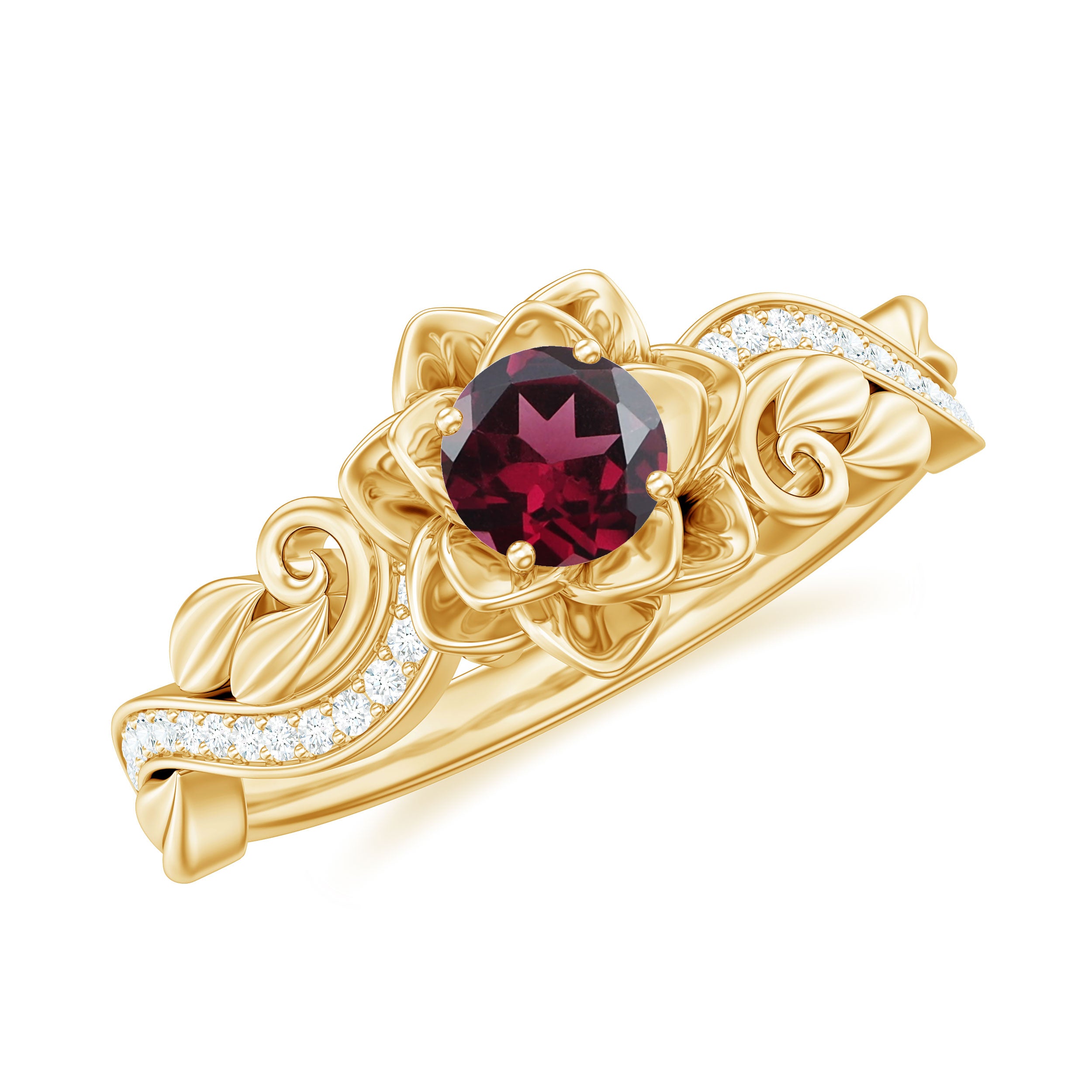 A timeless and elegant 5mm round Rhodolite solitaire ring in a prong setting, accented with a Diamond on a flower design. With a total weight of 3/4 carat, this Rhodolite Flower Ring is made of AAA quality materials and certified for quality. A unique choice for a loved one who has captured your heart.