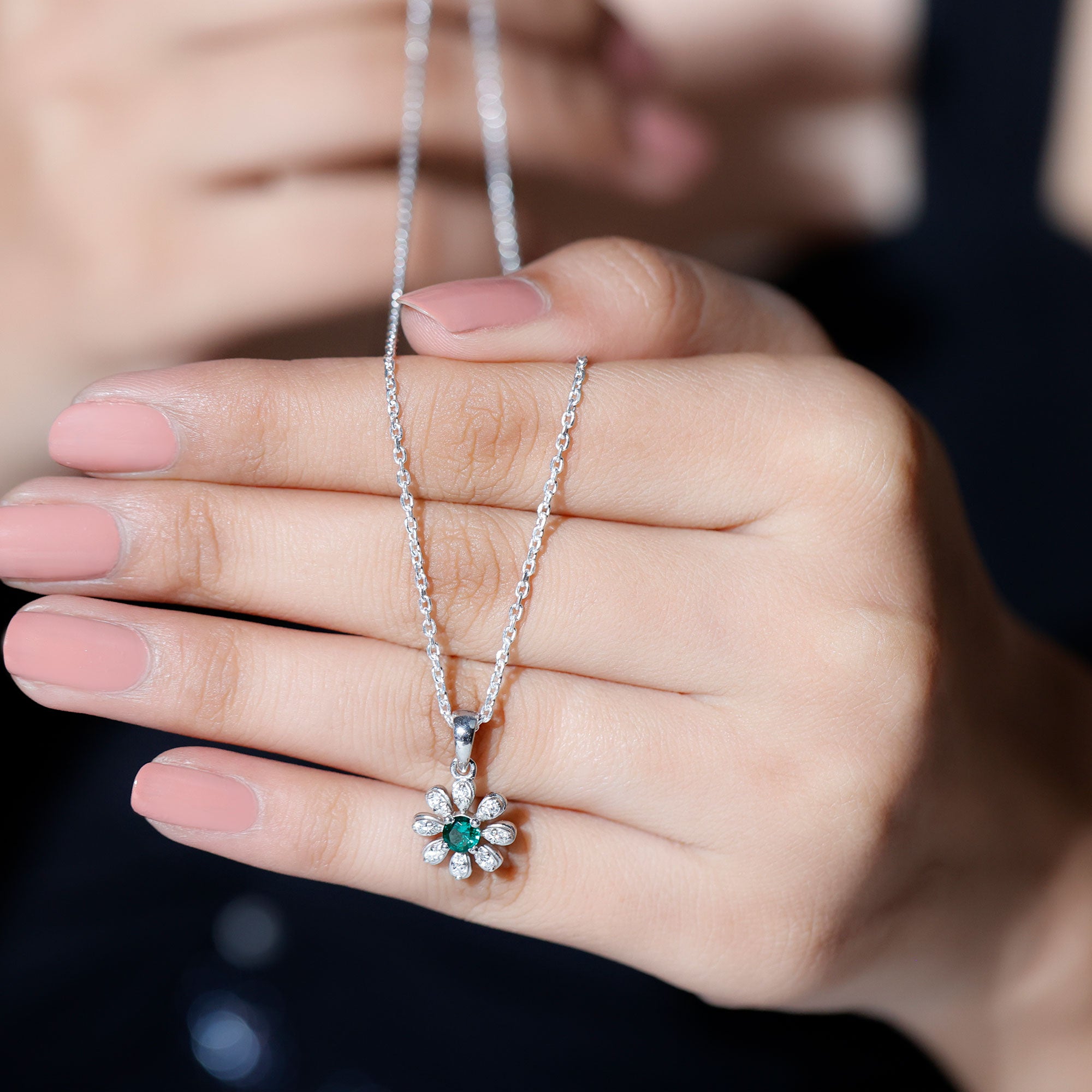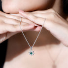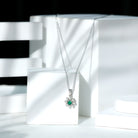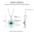 Enhance your jewelry collection with a timeless floral elegance by adding this stunning Flower Pendant Necklace. Inspired by the natural beauty of blooming flower, this Lab Grown Emerald Necklace perfectly blends classic femininity with contemporary craftsmanship. It features a 4 MM round brilliant cut lab-created emerald set in prong setting at the center, encircled by a delicate halo of floral petals adorned with moissanite stones. Expertly handcrafted from 14k white gold plated silver, the Green Emerald Necklace highlights exquisite detailing and smooth finishes that emphasize the artistry of each piece. This Emerald Flower Necklace is perfect for adding a touch of nature to your look for special occasions. It hangs gracefully from a cable chain and is secured with a lobster clasp, allowing you to adjust the length to suit your preference. The premium jewelry pouch packaging ensures that the Designer Pendant remains safe during shipping and delivery.