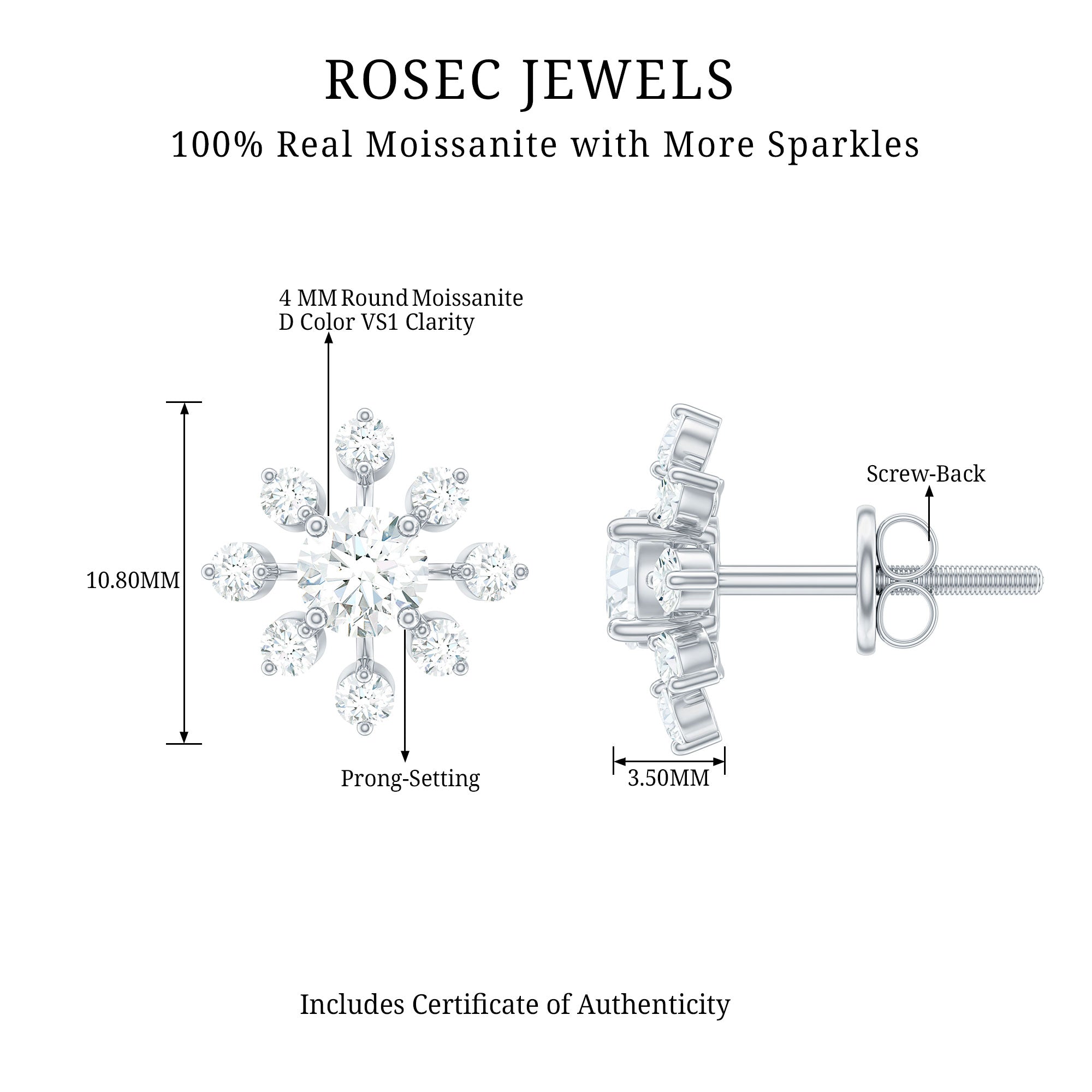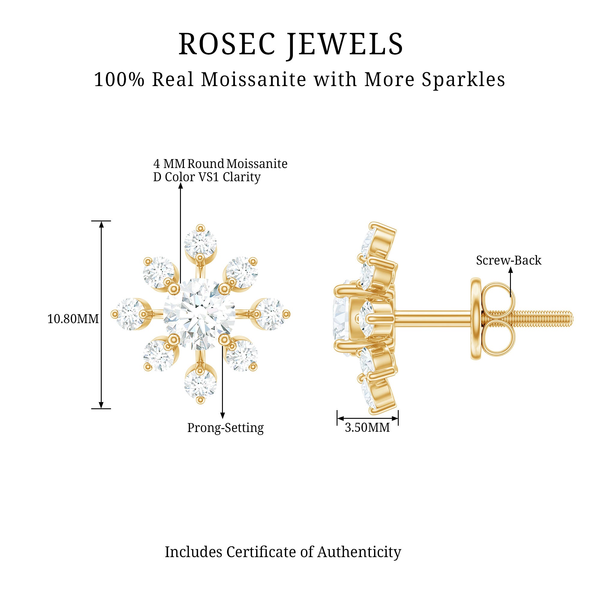 Add a touch of elegance to your special occasion look with these stunning Moissanite Floral Stud Earrings. Made of Gold, they are a beautiful addition to any outfit. These Certified Moissanite earrings feature round cut stones set in a prong setting, making them a perfect gift for your loved one. These Moissanite Gold Stud Earrings are sure to impress.