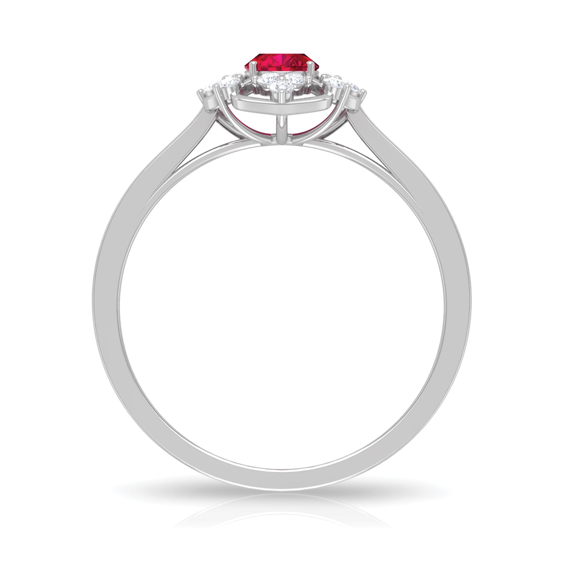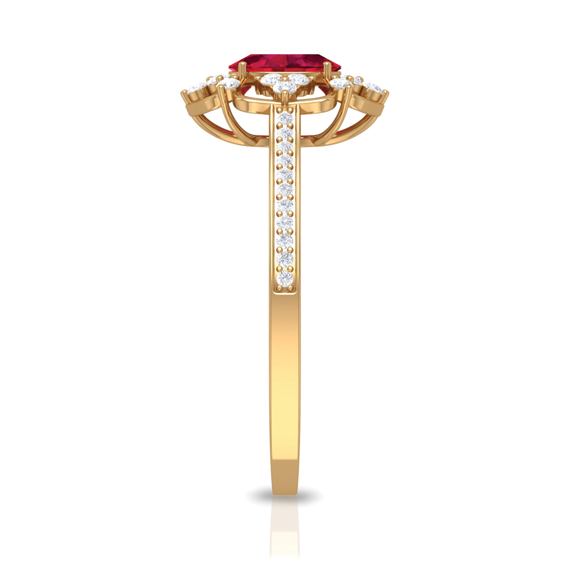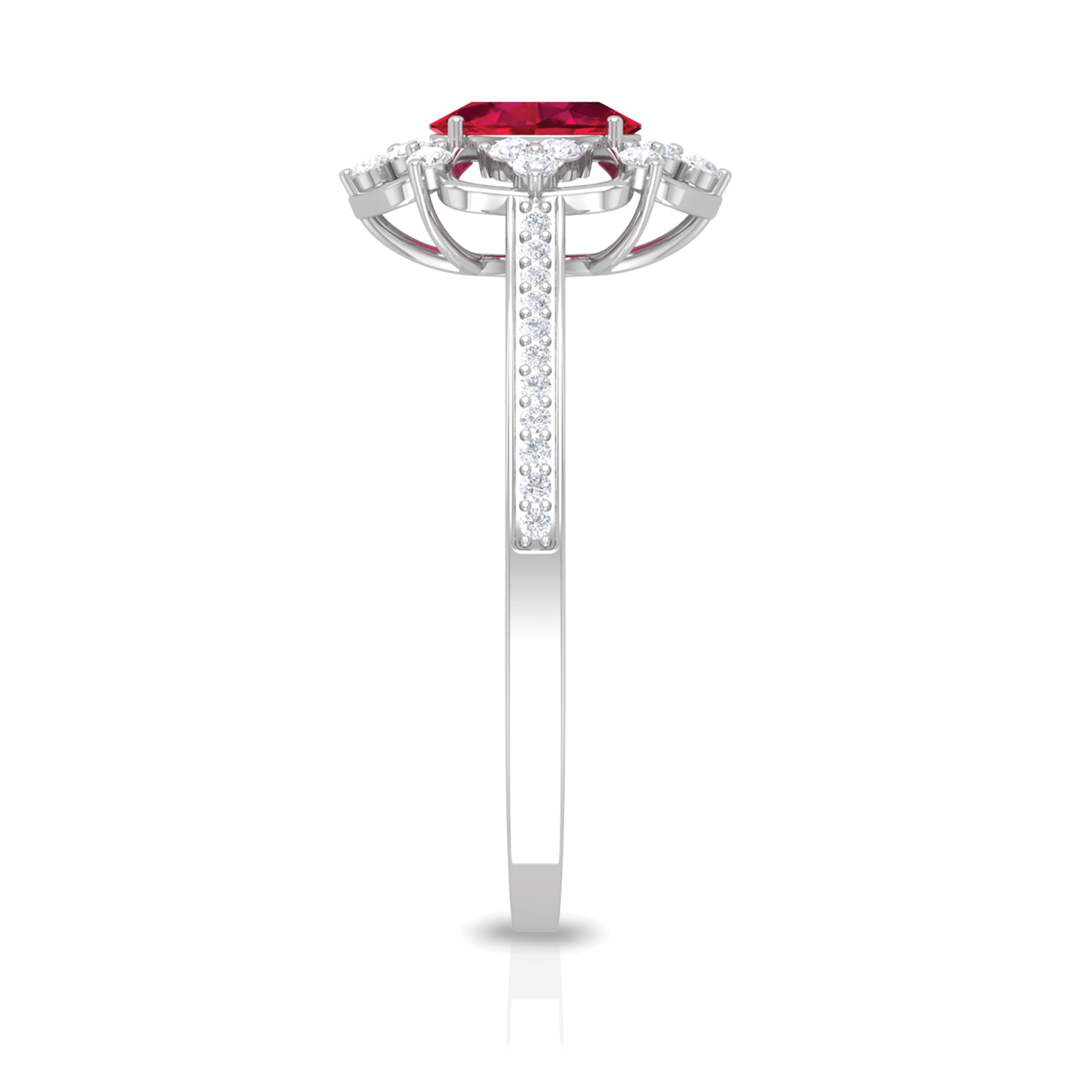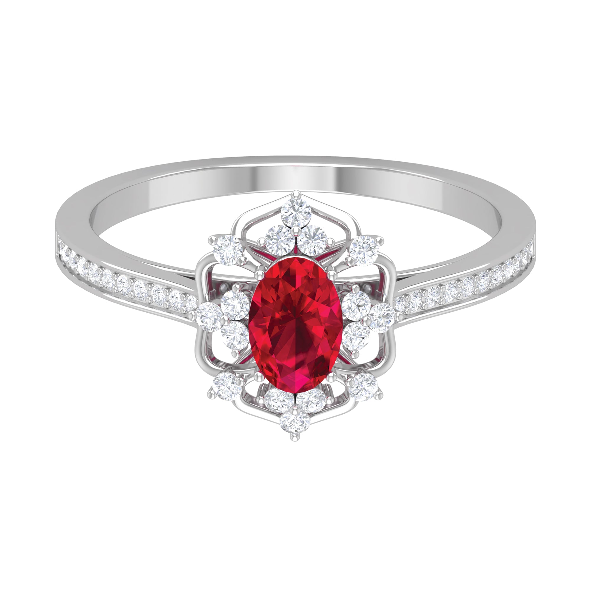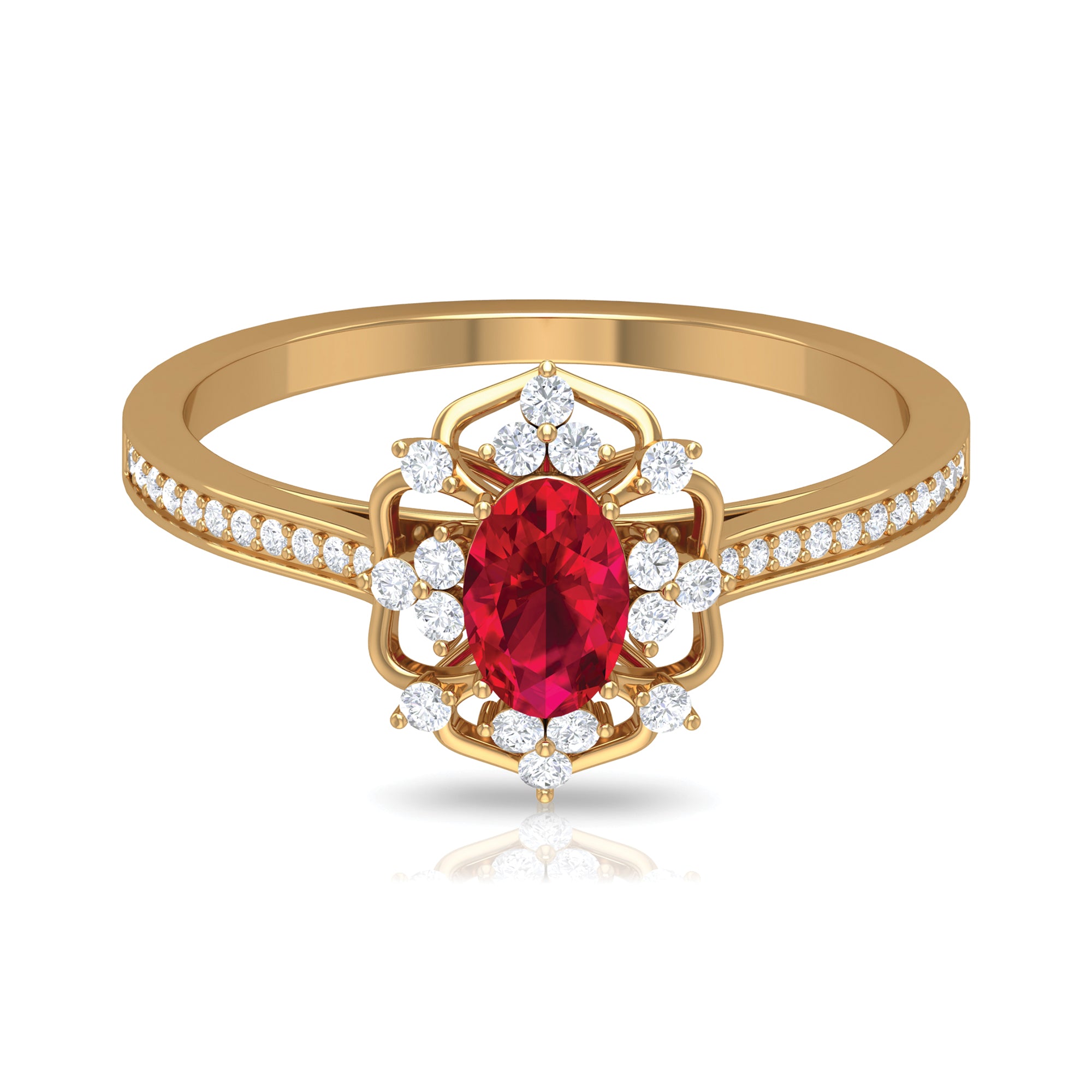 Feel the Vintage Vibes with our Vintage Inspired Ruby Engagement Ring. It is embellished with Oval Cut Ruby as Centre Stone in Four Prong Setting with Diamond Accent. This Ruby and Diamond Engagement Ring is a stunning jewelry, which she will cherish her whole life.