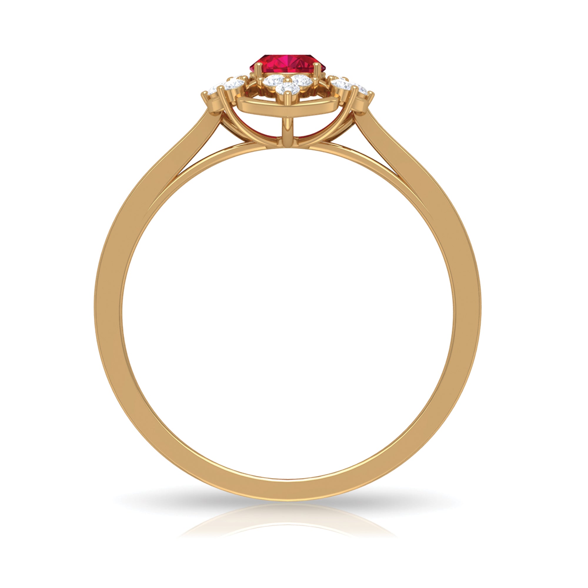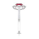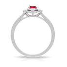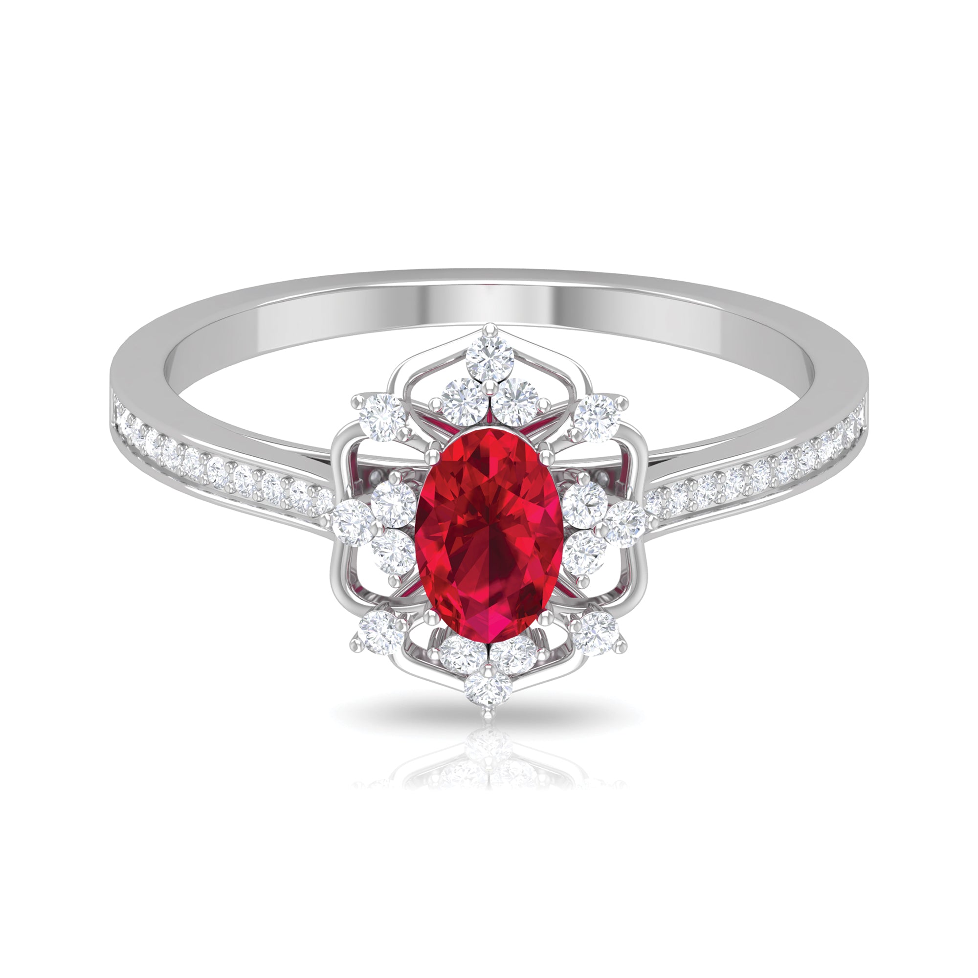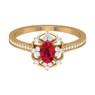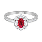 Feel the Vintage Vibes with our Vintage Inspired Ruby Engagement Ring. It is embellished with Oval Cut Ruby as Centre Stone in Four Prong Setting with Diamond Accent. This Ruby and Diamond Engagement Ring is a stunning jewelry, which she will cherish her whole life.
