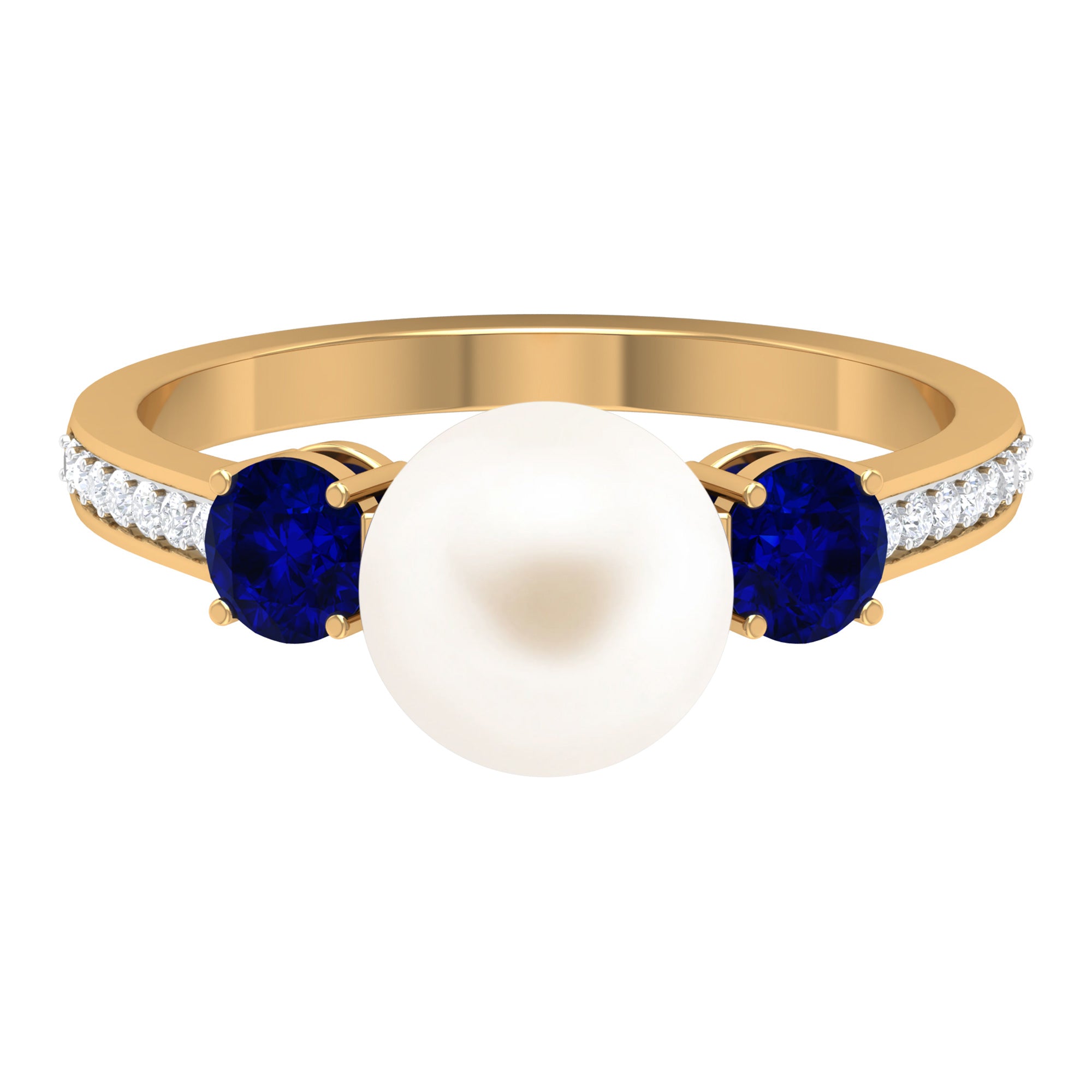 Unique Engagement Ring is embellished with 8 MM Round Shape Freshwater Pearl Solitaire with Round Blue Sapphire and Moissanite are set as Side Stones gives a gorgeous touch to this Ring. This beautiful White Pearl Engagement Ring is crafted in Gold. A perfect present for your Lady Love to gift on her special or big day.