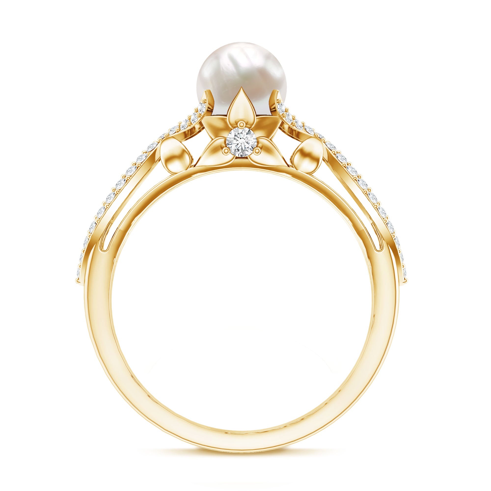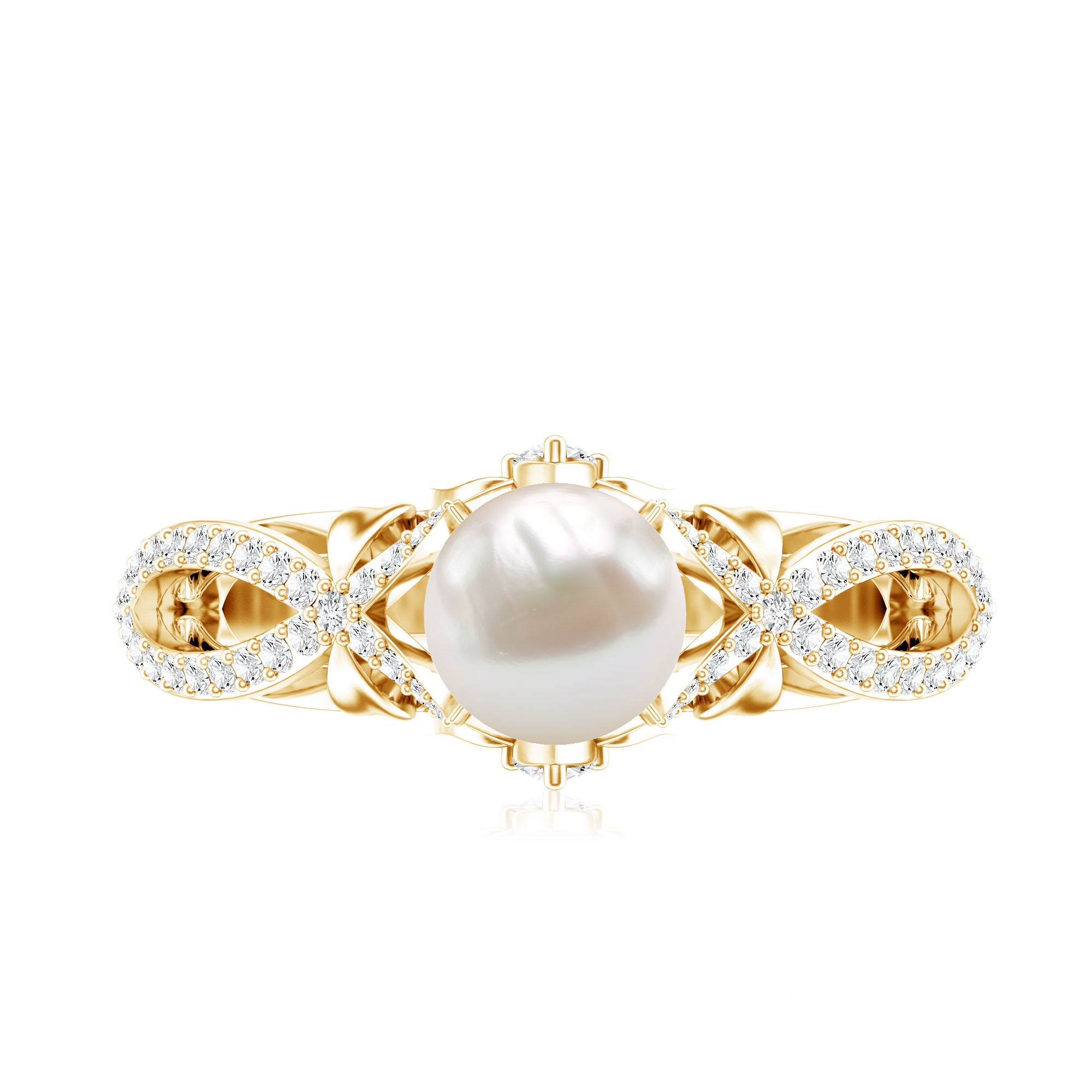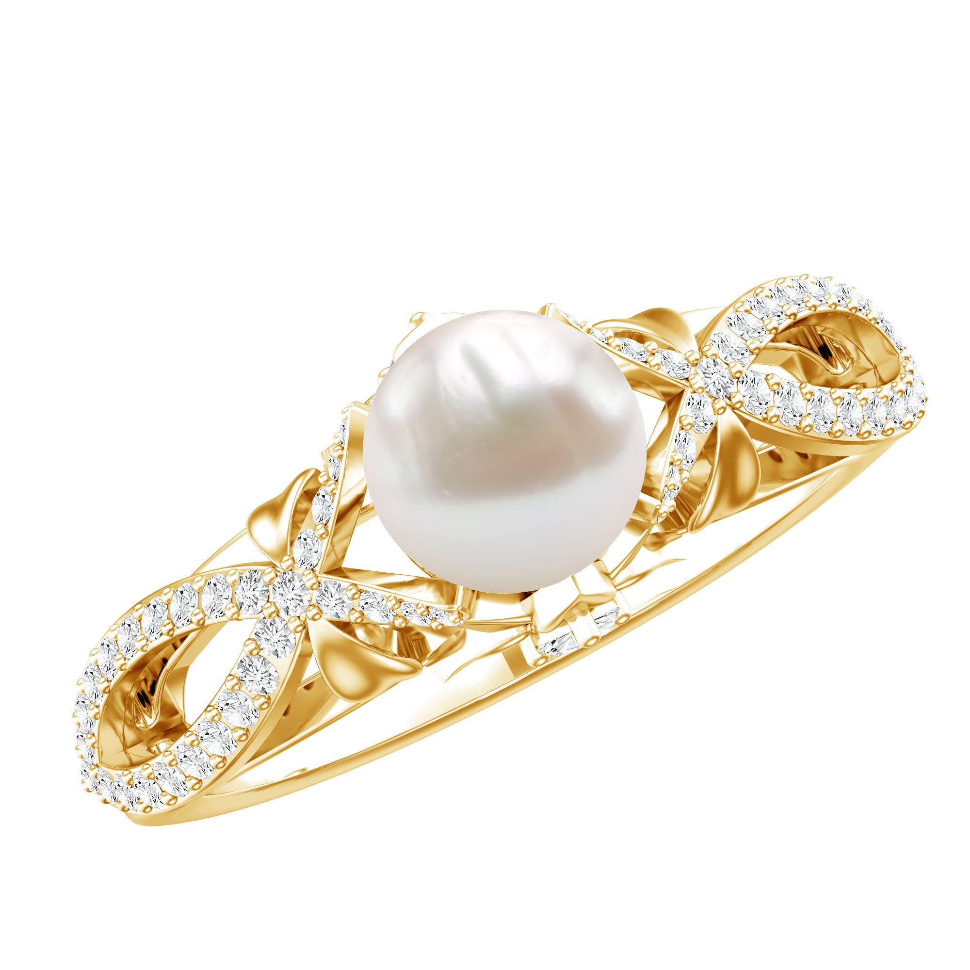 Sparkle effortlessly at every gathering with this Freshwater Pearl and Diamond Ring. It is a Gold Crossover Ring adorned with Round Shape Freshwater White Pearl as main Stone with Surprise Diamond in Gold Petal Design. This Pearl Engagement Ring with Diamond Accent is crafted in Gold.