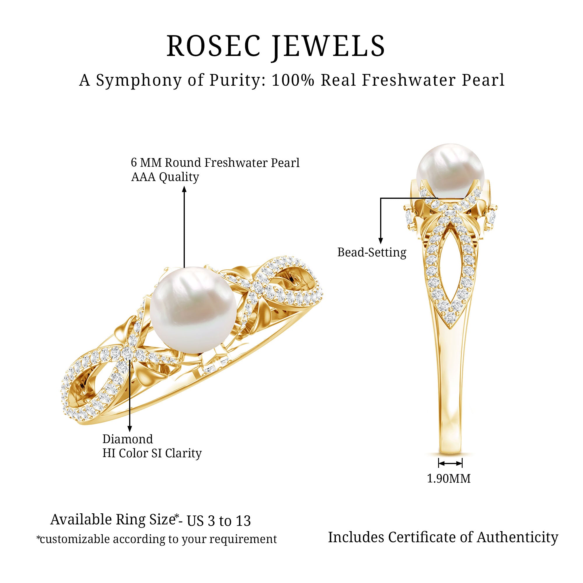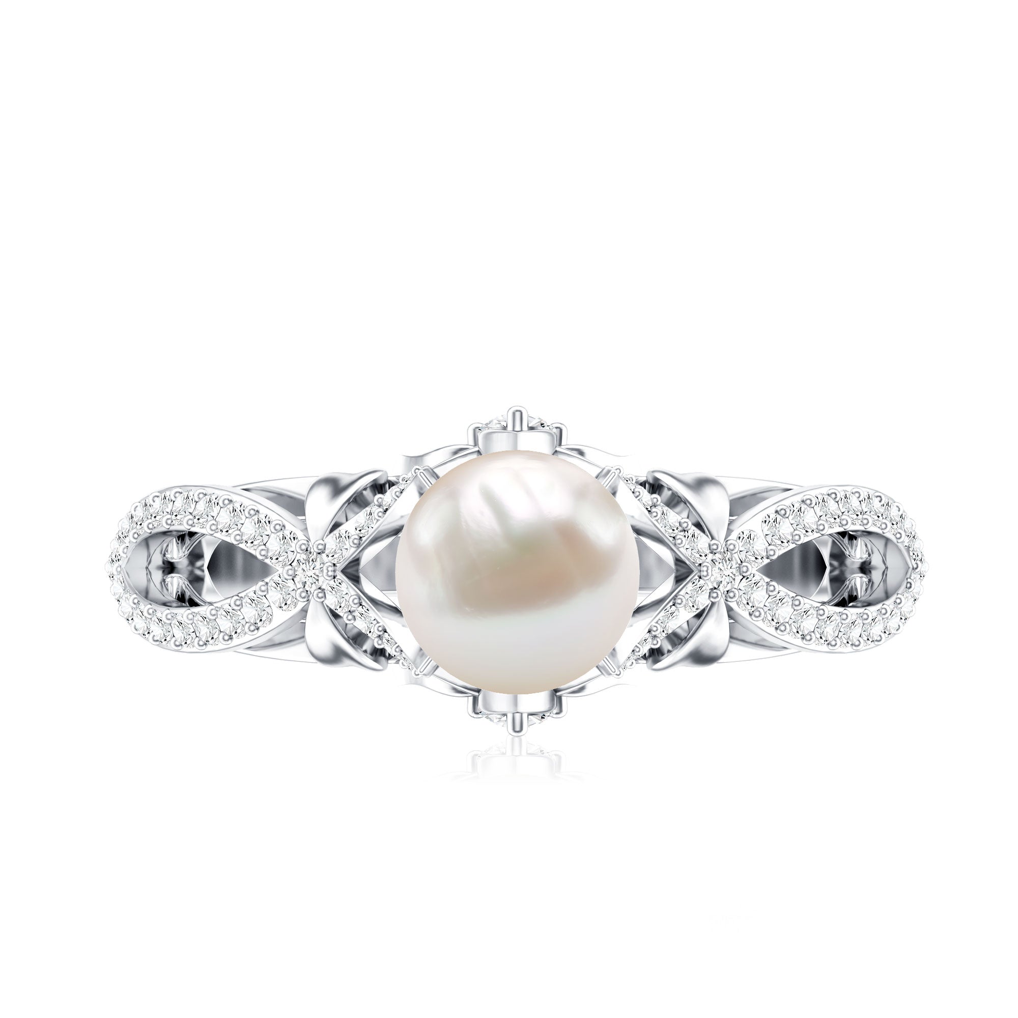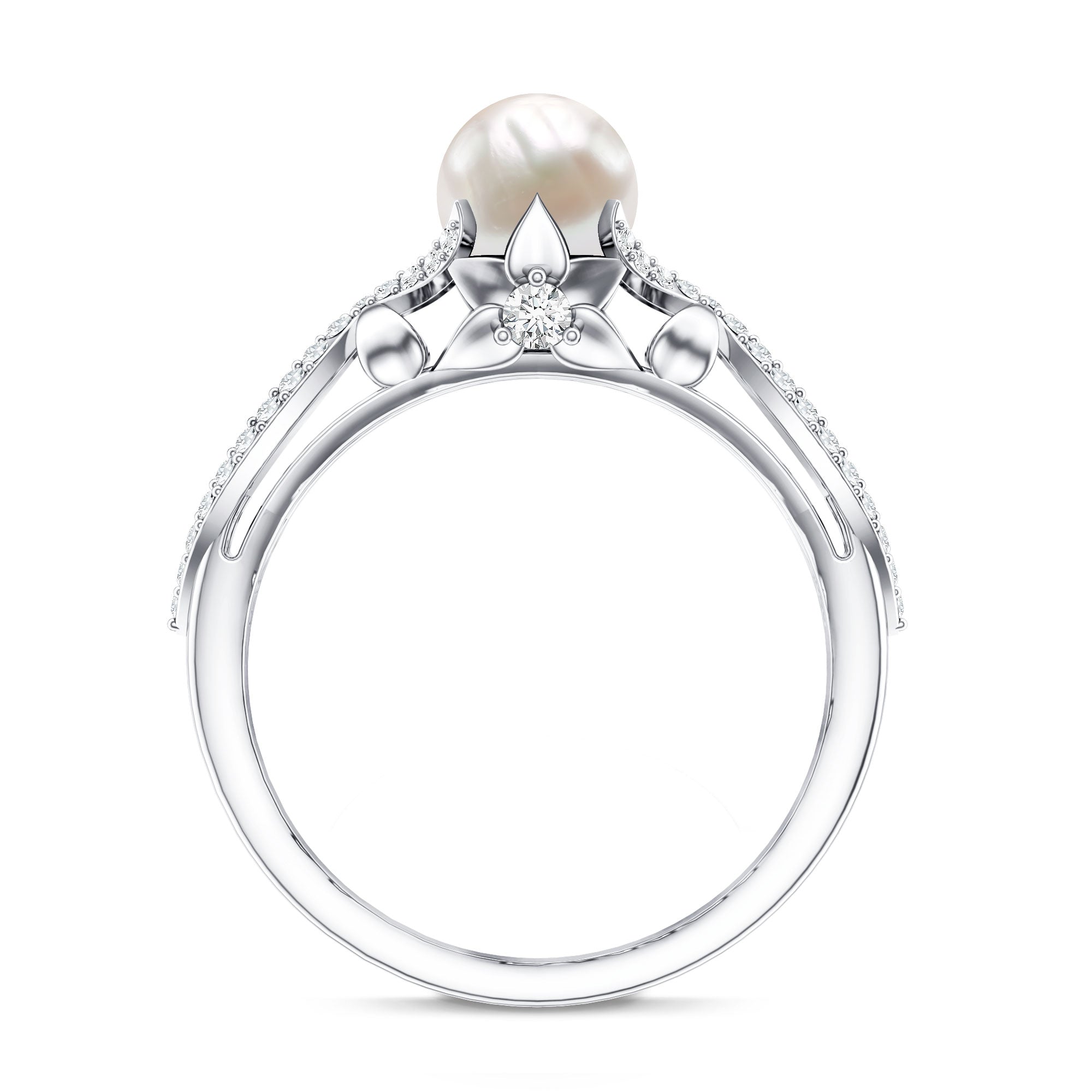Sparkle effortlessly at every gathering with this Freshwater Pearl and Diamond Ring. It is a Gold Crossover Ring adorned with Round Shape Freshwater White Pearl as main Stone with Surprise Diamond in Gold Petal Design. This Pearl Engagement Ring with Diamond Accent is crafted in Gold.
