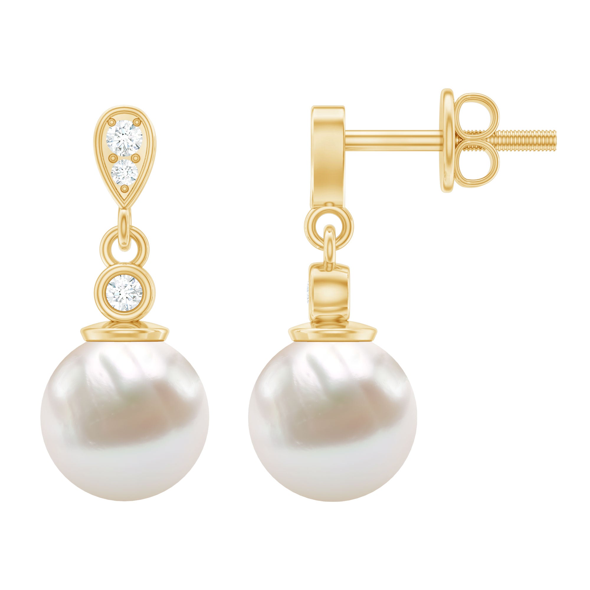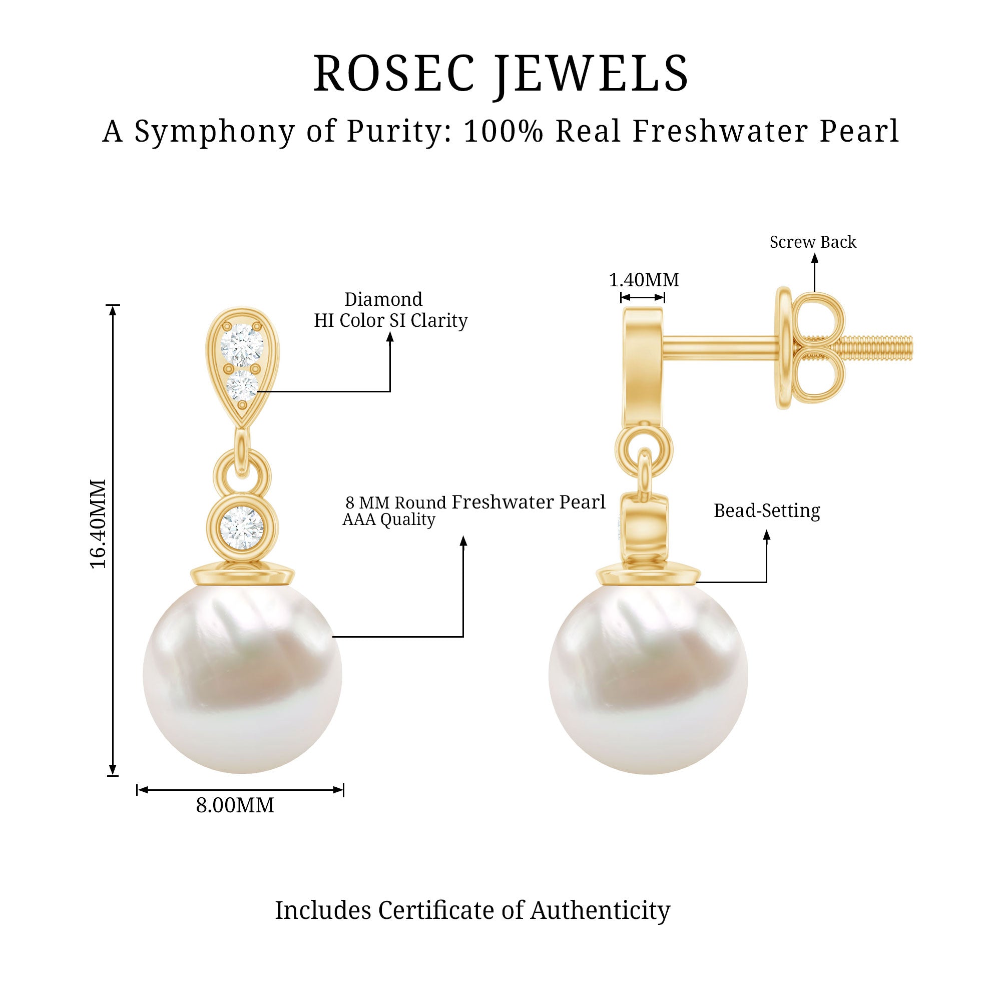 These lovely Drop Earrings are adorned with Freshwater Pearl and Round Shape Diamond stones to make for an elegant gift for your loved one. With the option to choose your preferred metal type, these white pearl earrings can be customized to suit your personal style.