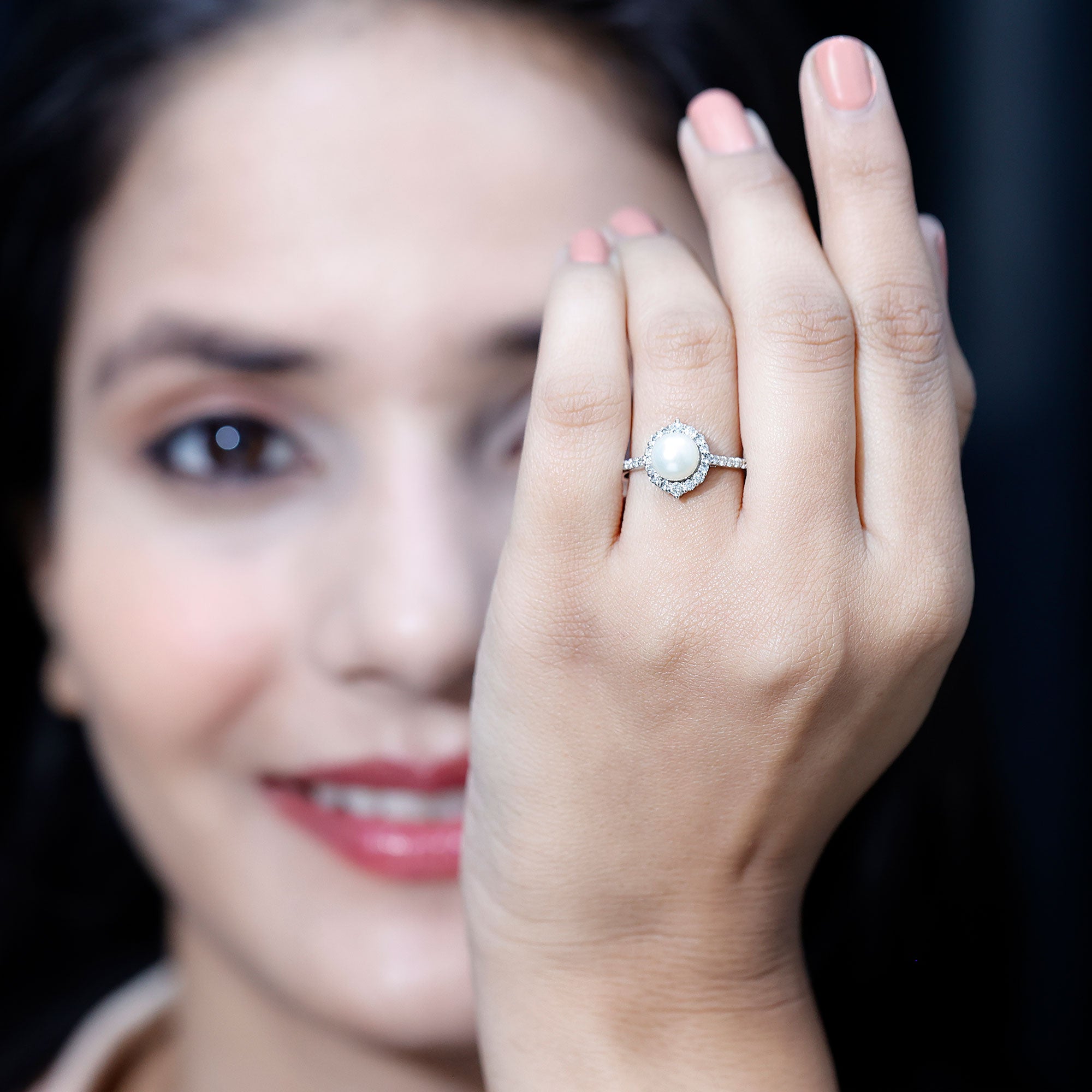 The littering Halo Engagement Ring features delicate Prong Set Diamond Halo that encircle the center Round Shape Freshwater Pearl with side stone on shank. The Classic Design makes this ring light and feminine for a truly special look. Adorn yourself with our perfect Freshwater White Pearl Engagement Ring on your big day.