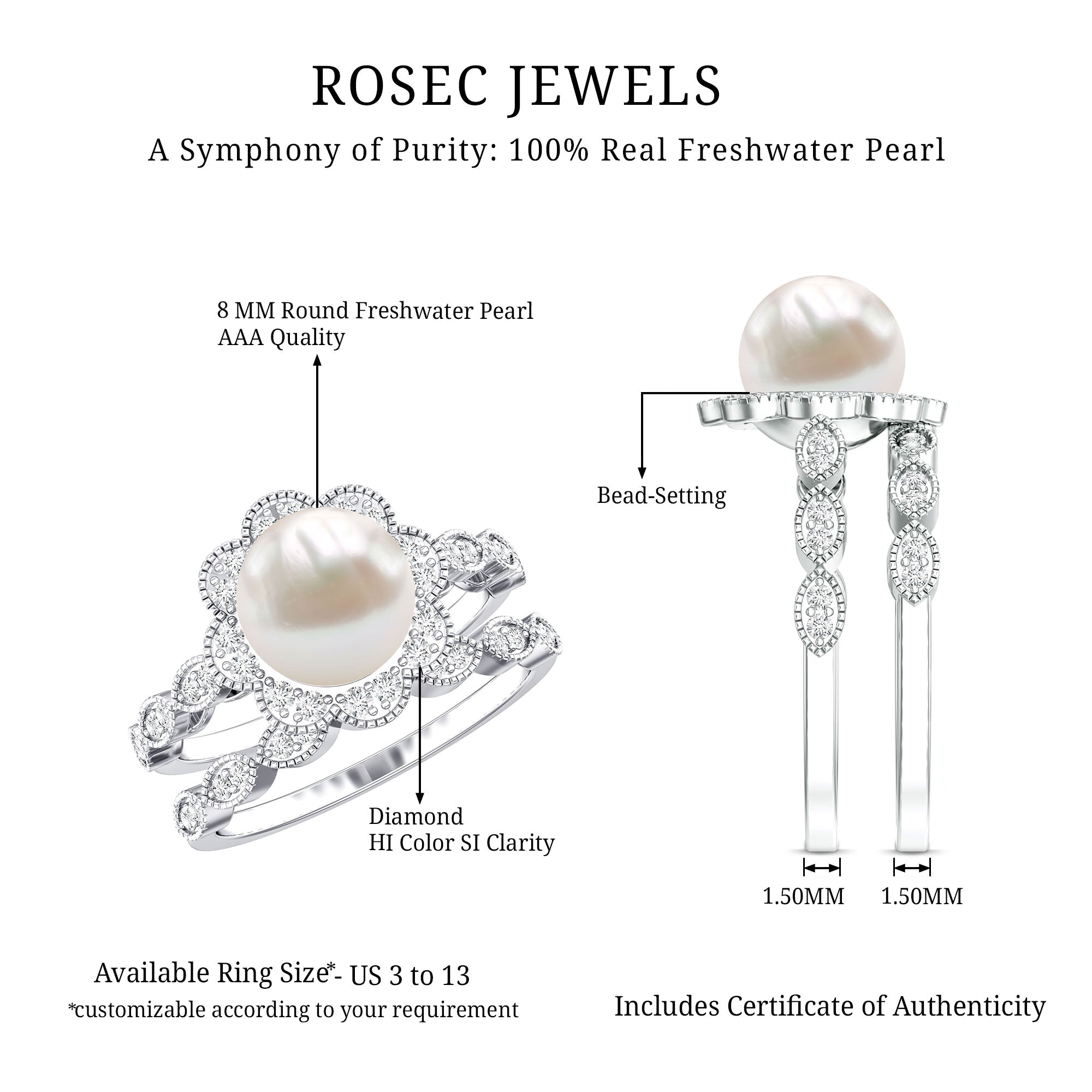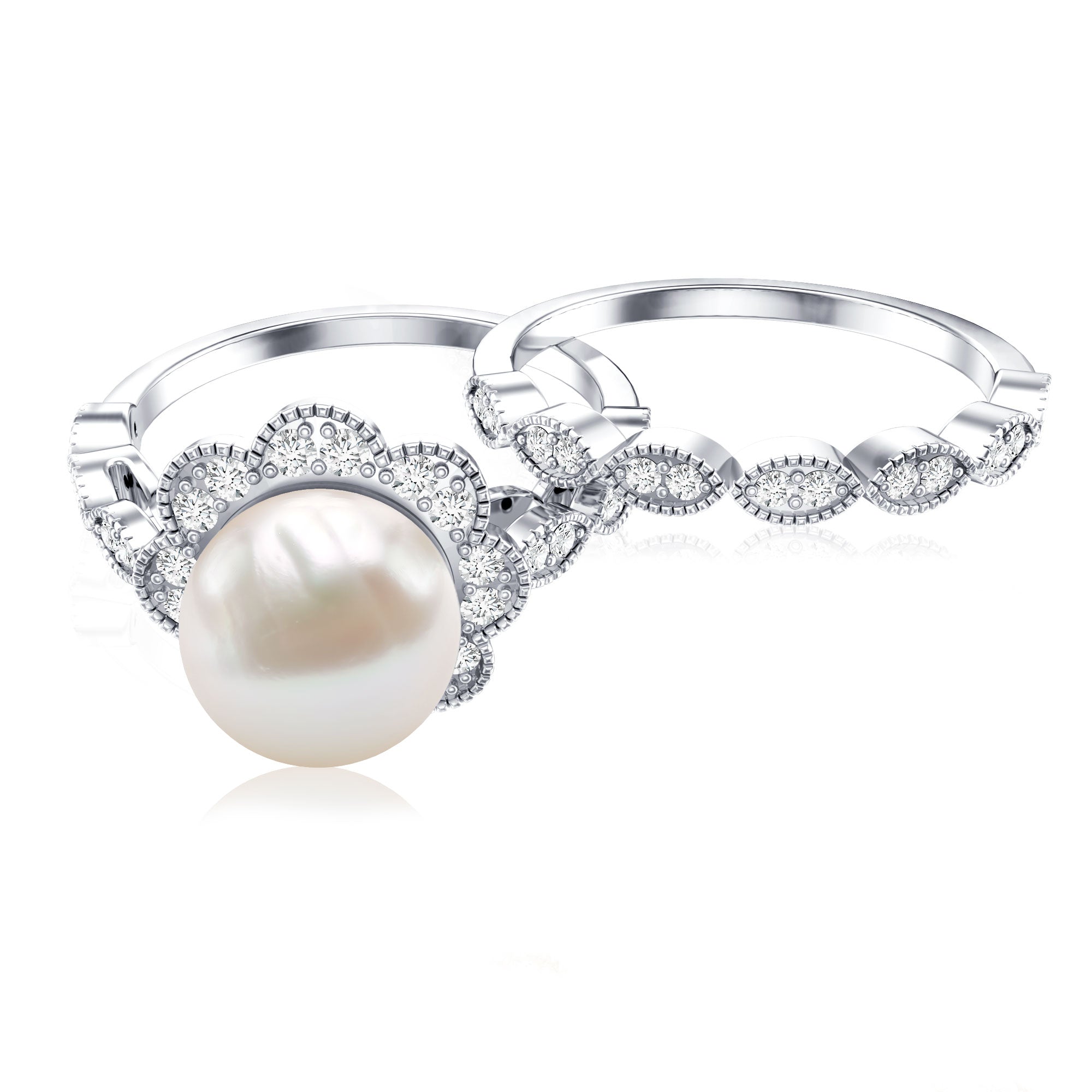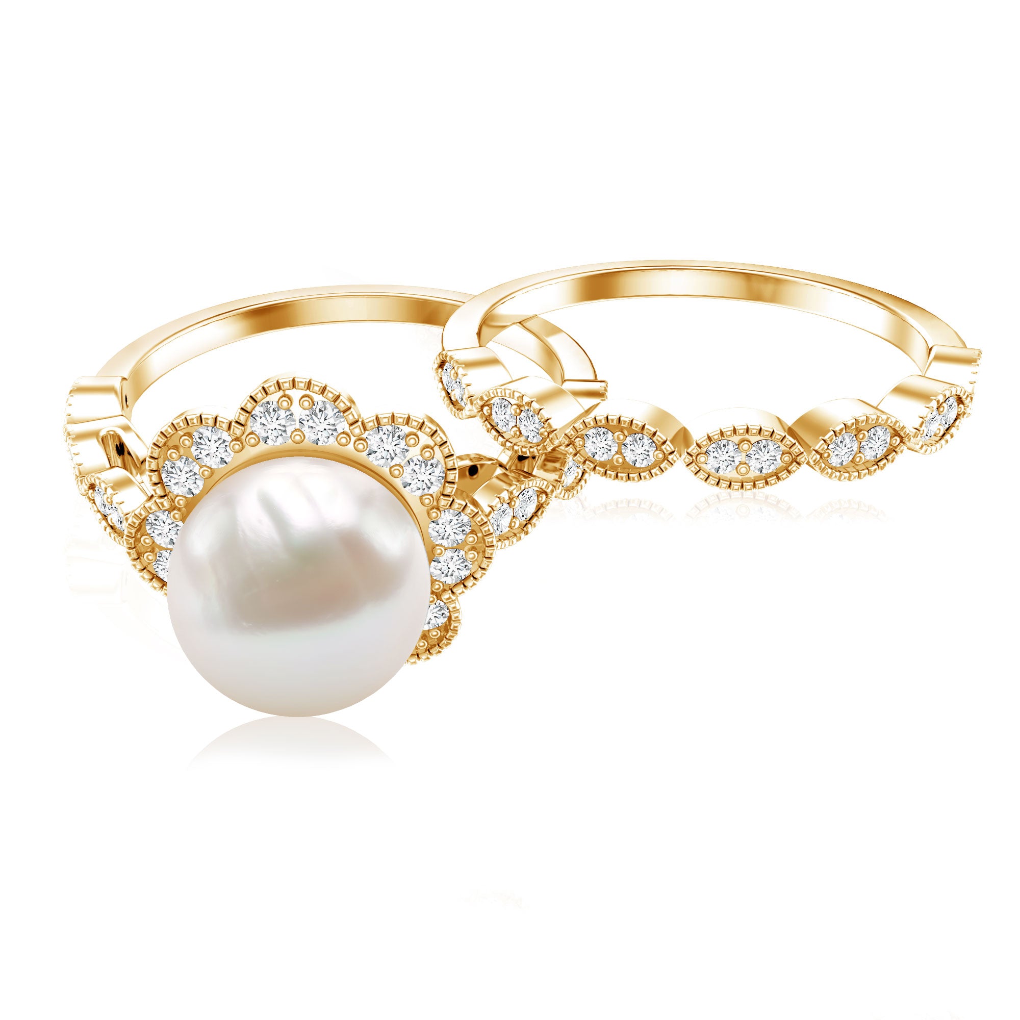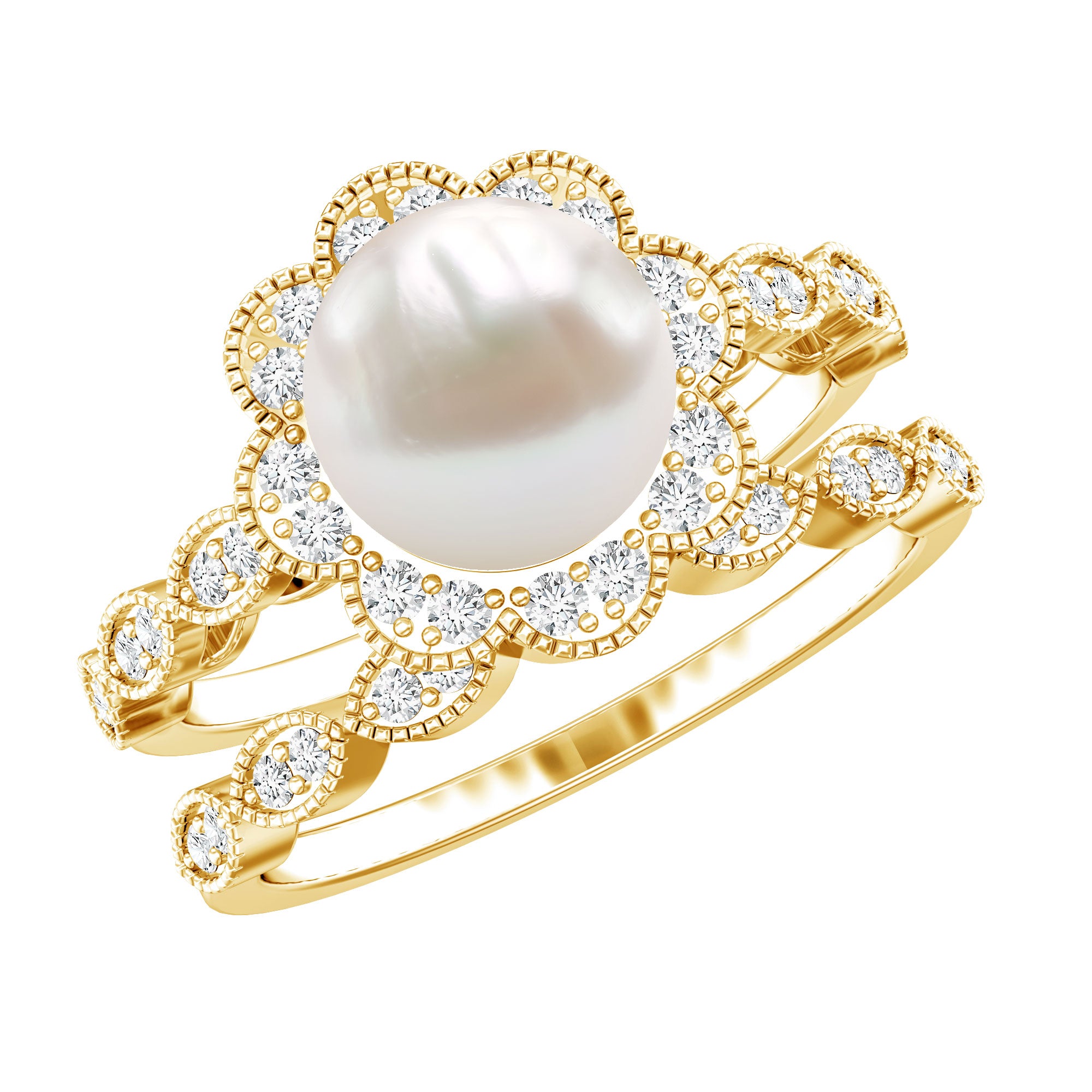 Make a dazzling statement on your big day with this exquisite Wedding Ring Set, featuring a Round Shape Freshwater Pearl in a bead setting, flanked by shimmering Diamond stones on the sides set with beaded gold. Expertly crafted in gold, this Pearl Engagement Ring Set is a truly elegant adornment that will add a touch of sophistication to your bridal ensemble, ensuring you sparkle a little more on your special day.