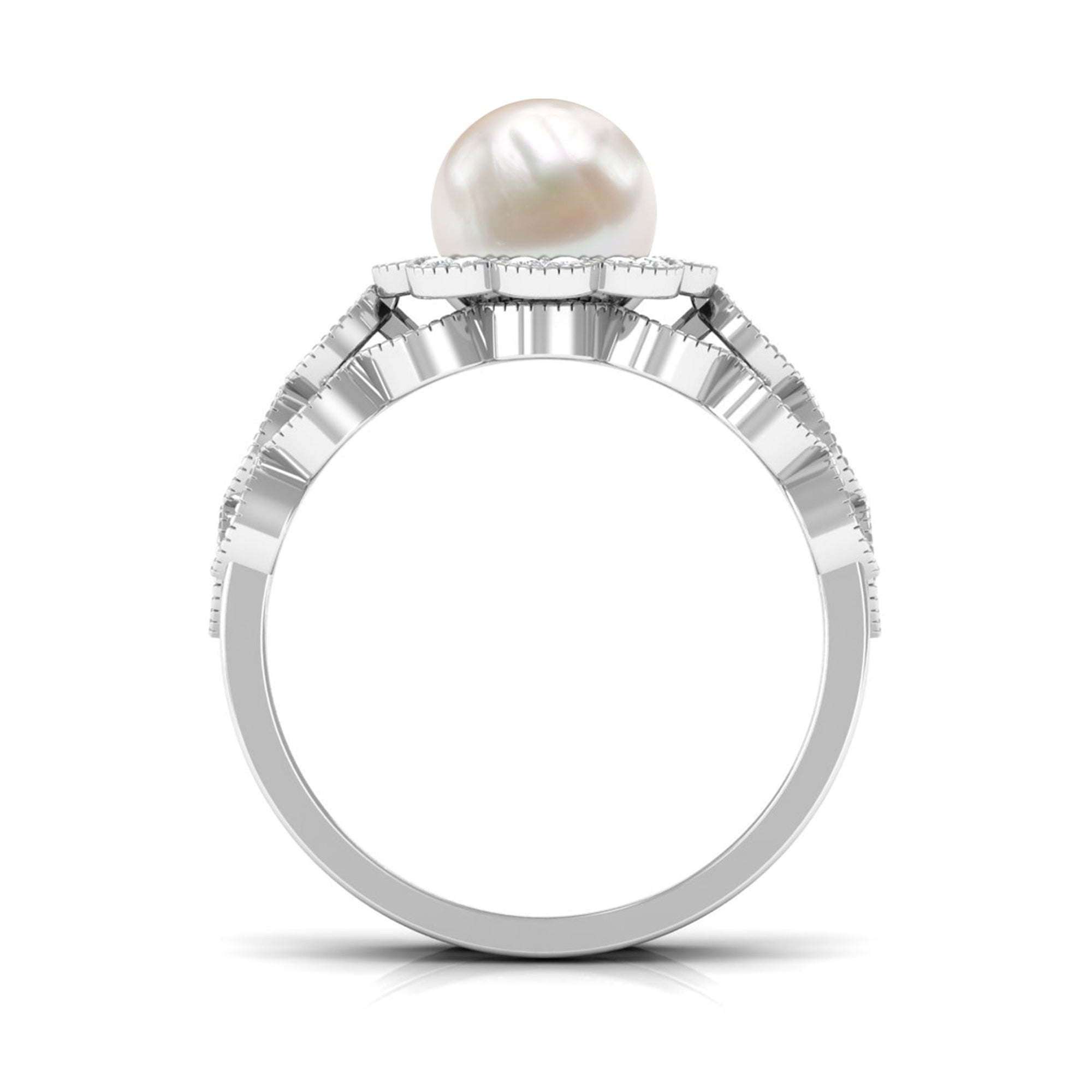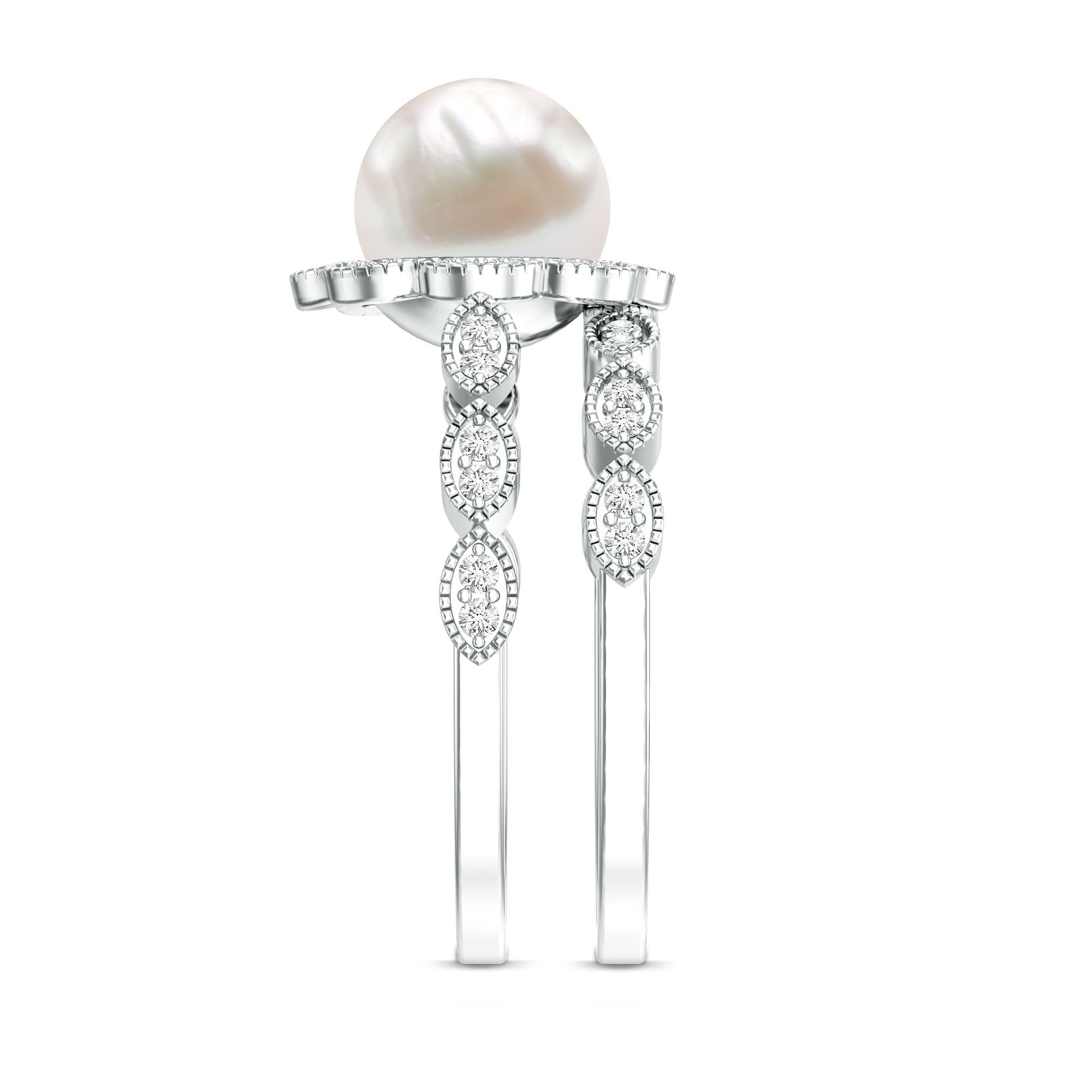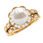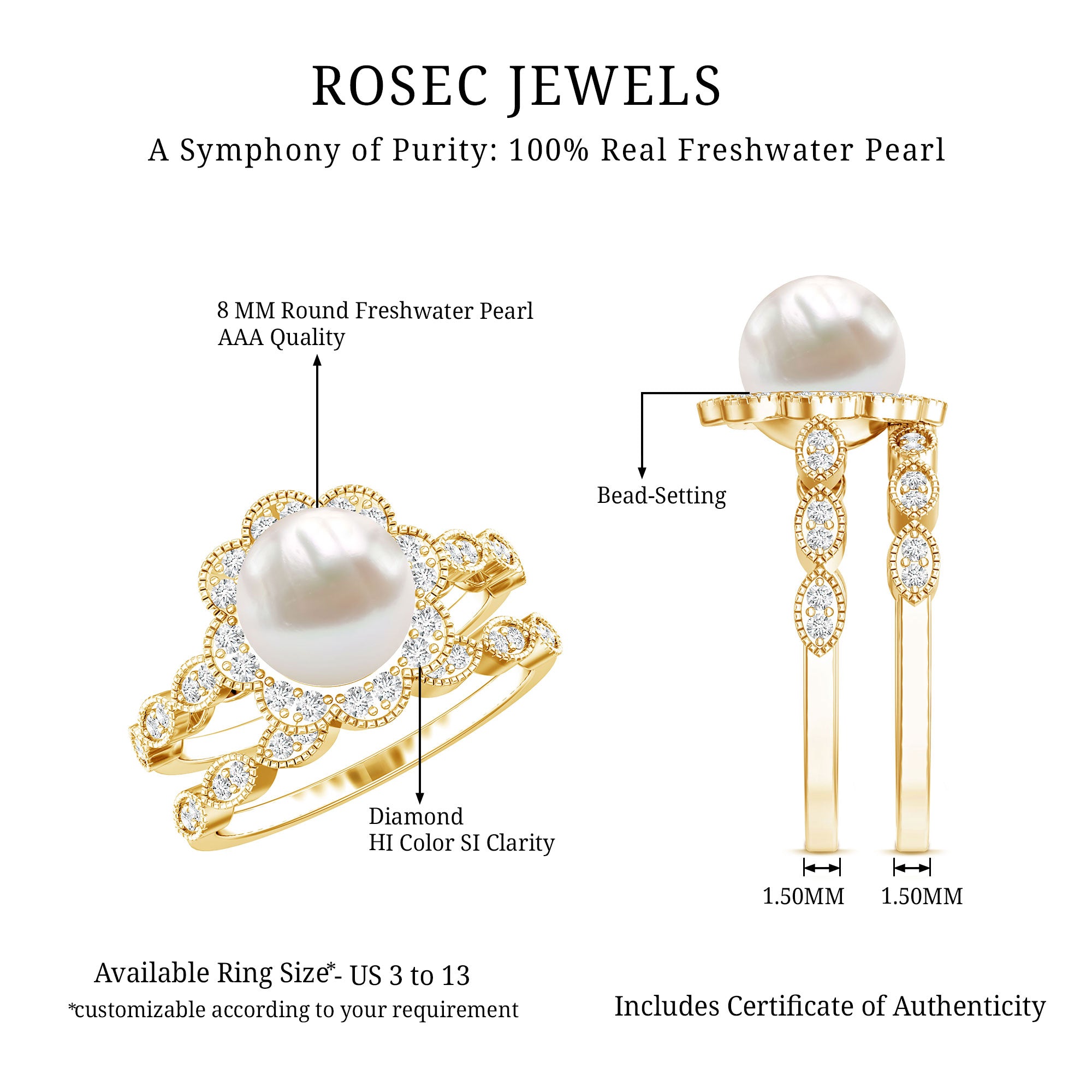 Make a dazzling statement on your big day with this exquisite Wedding Ring Set, featuring a Round Shape Freshwater Pearl in a bead setting, flanked by shimmering Diamond stones on the sides set with beaded gold. Expertly crafted in gold, this Pearl Engagement Ring Set is a truly elegant adornment that will add a touch of sophistication to your bridal ensemble, ensuring you sparkle a little more on your special day.