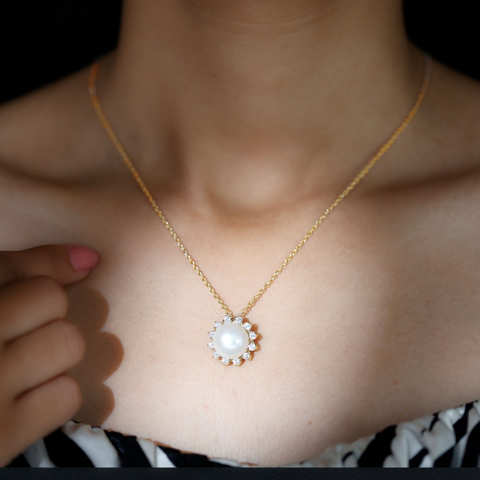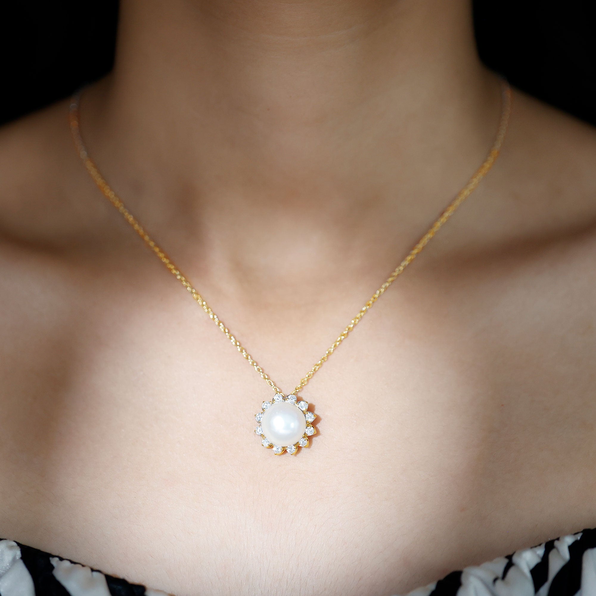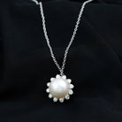 Get this Flower Pendant Necklace for your loved ones as it is embellished with Round Shape Freshwater Pearl and Round Cut Moissanites assembled in a Floral Design.