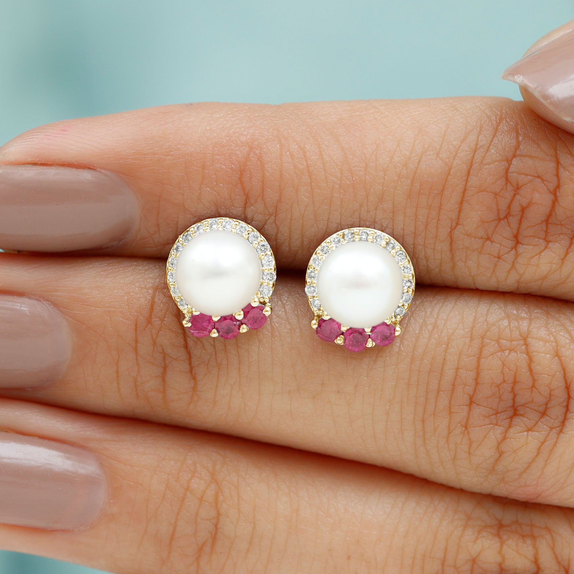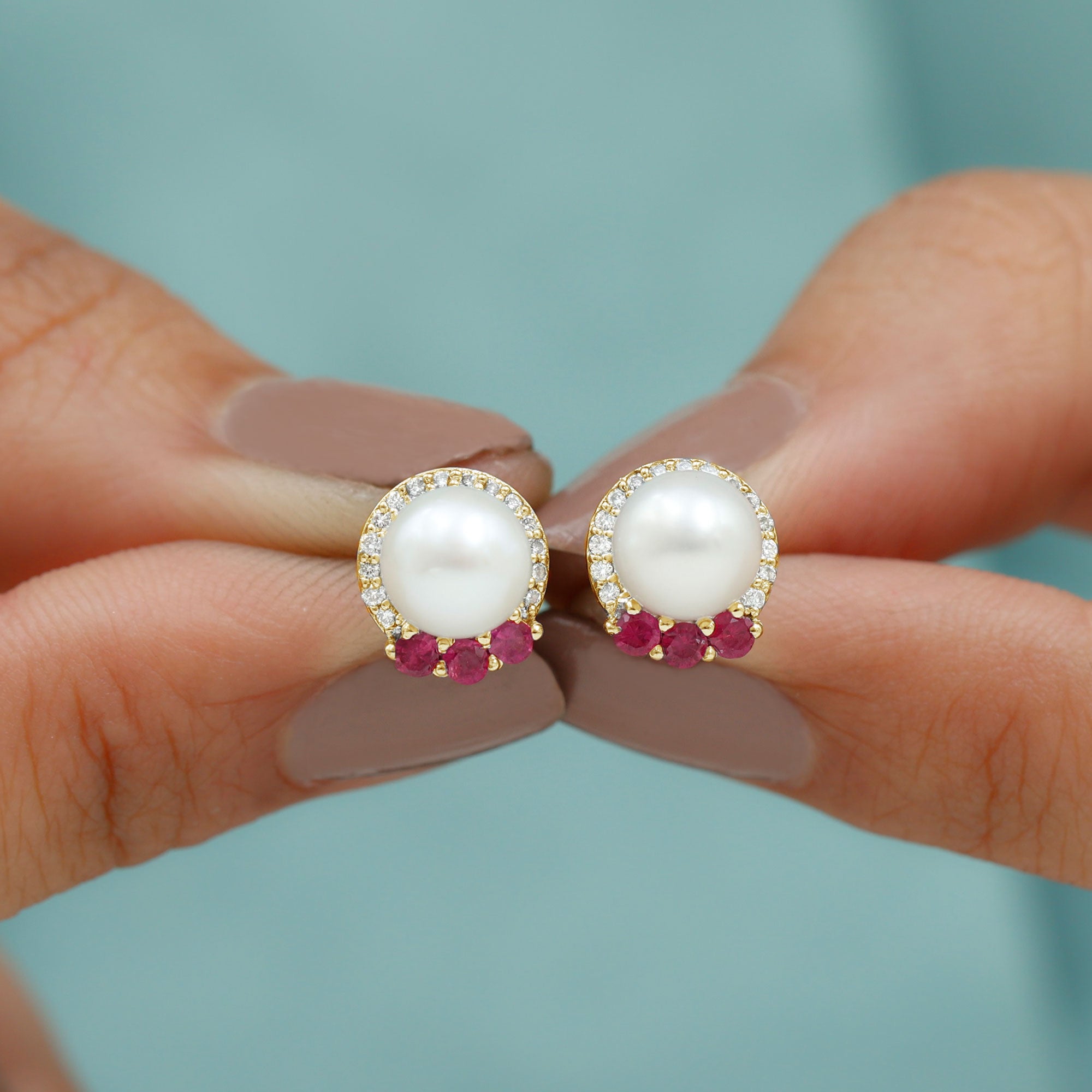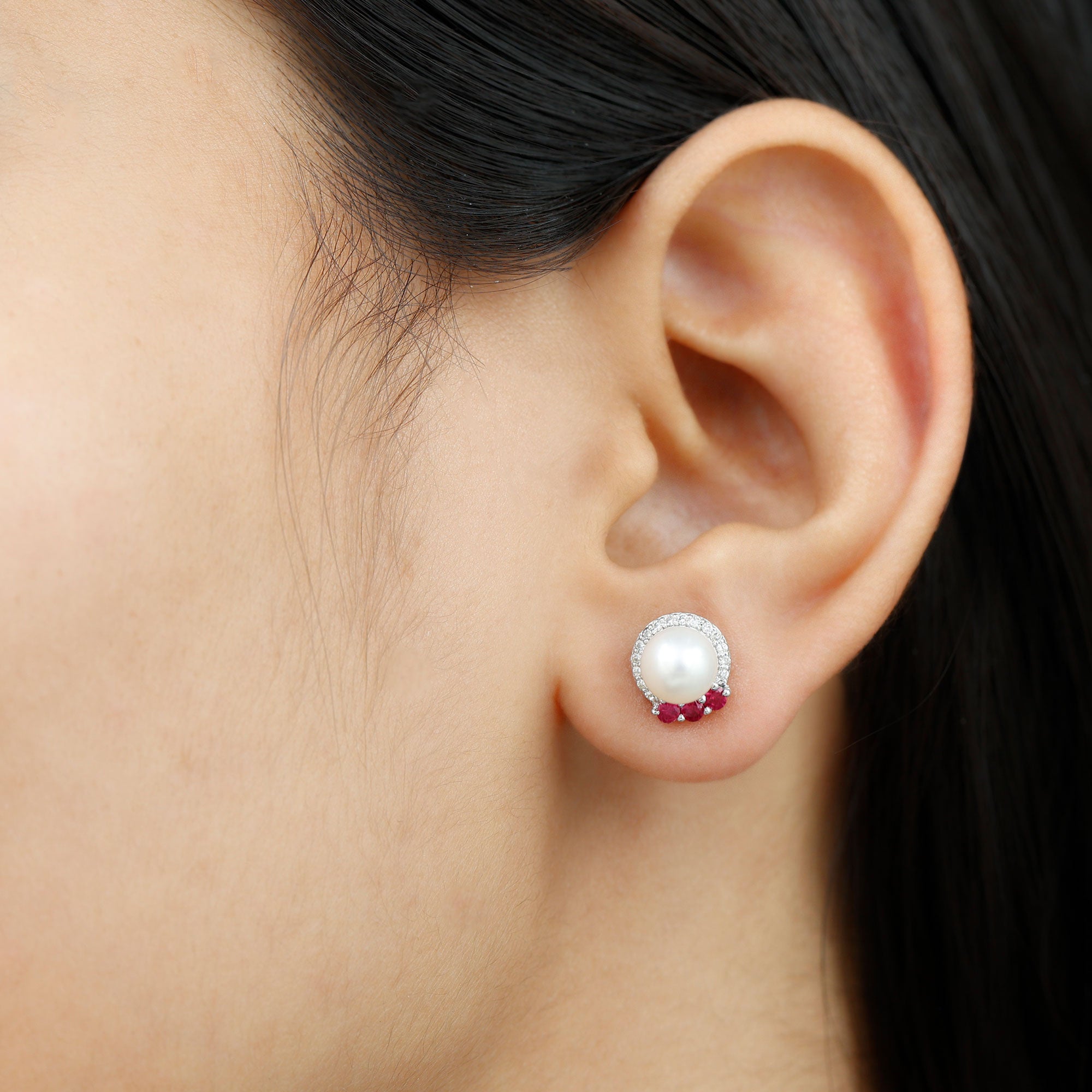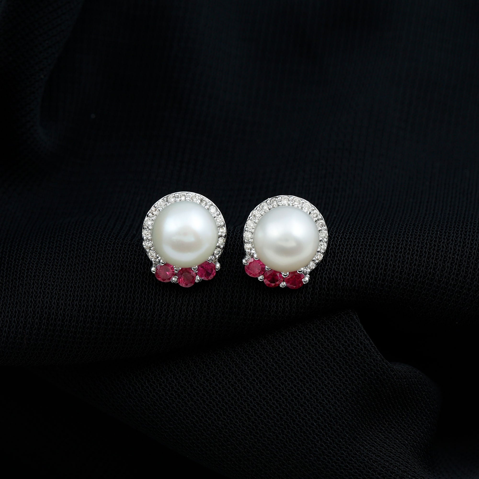 The Freshwater Pearl and Ruby Stud Earrings are a fabulous choice you wont be able to resist no matter what your style is. Featuring Round Shape Freshwater Pearl while Round Shape Diamonds studded as Halo and Round Ruby adds a touch of color. These Pearl Earrings are secure comfortably with screw backs. Celebrate any occasion with these shimmering Stud Earrings that can easily be worn to top off any casual, formal, or party look.