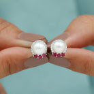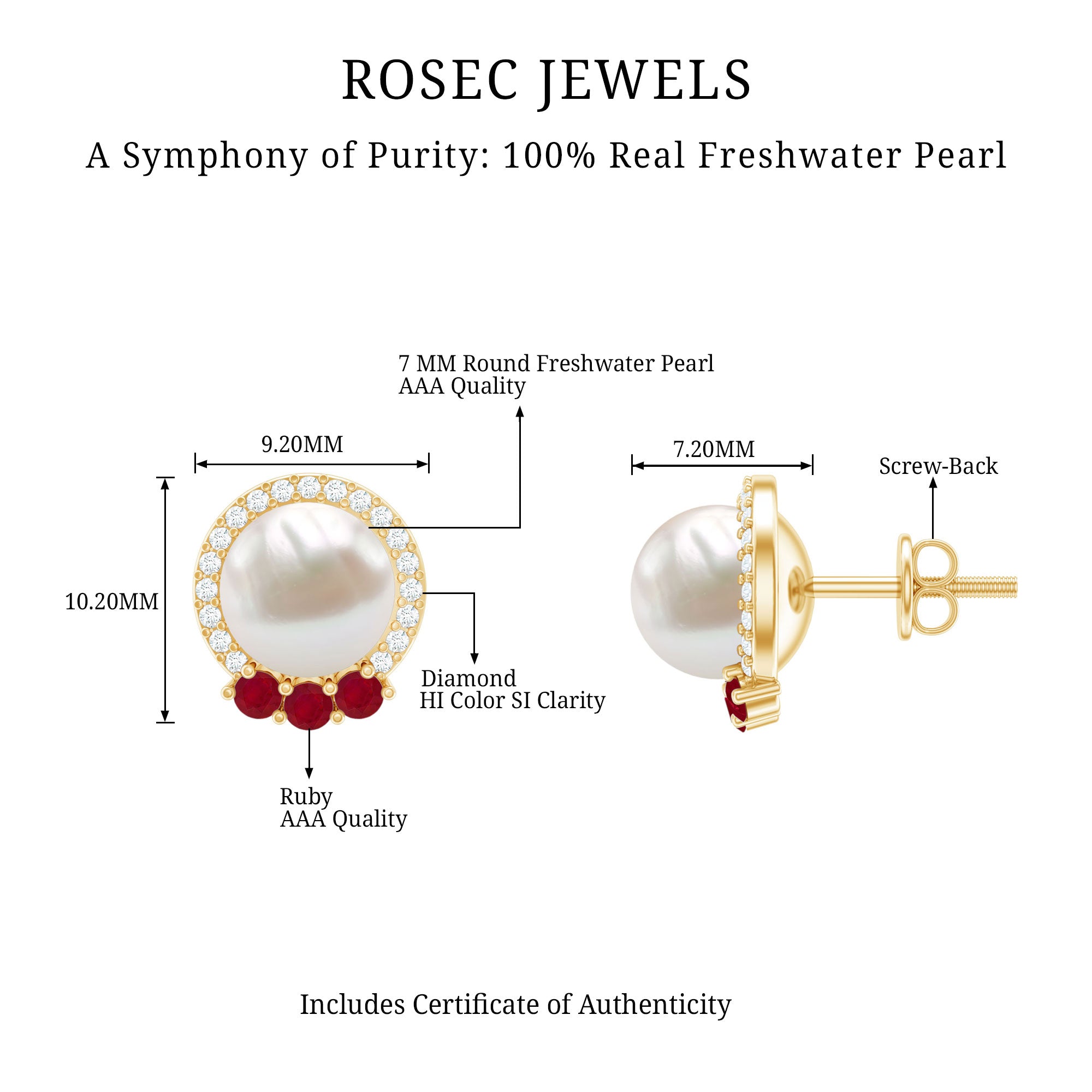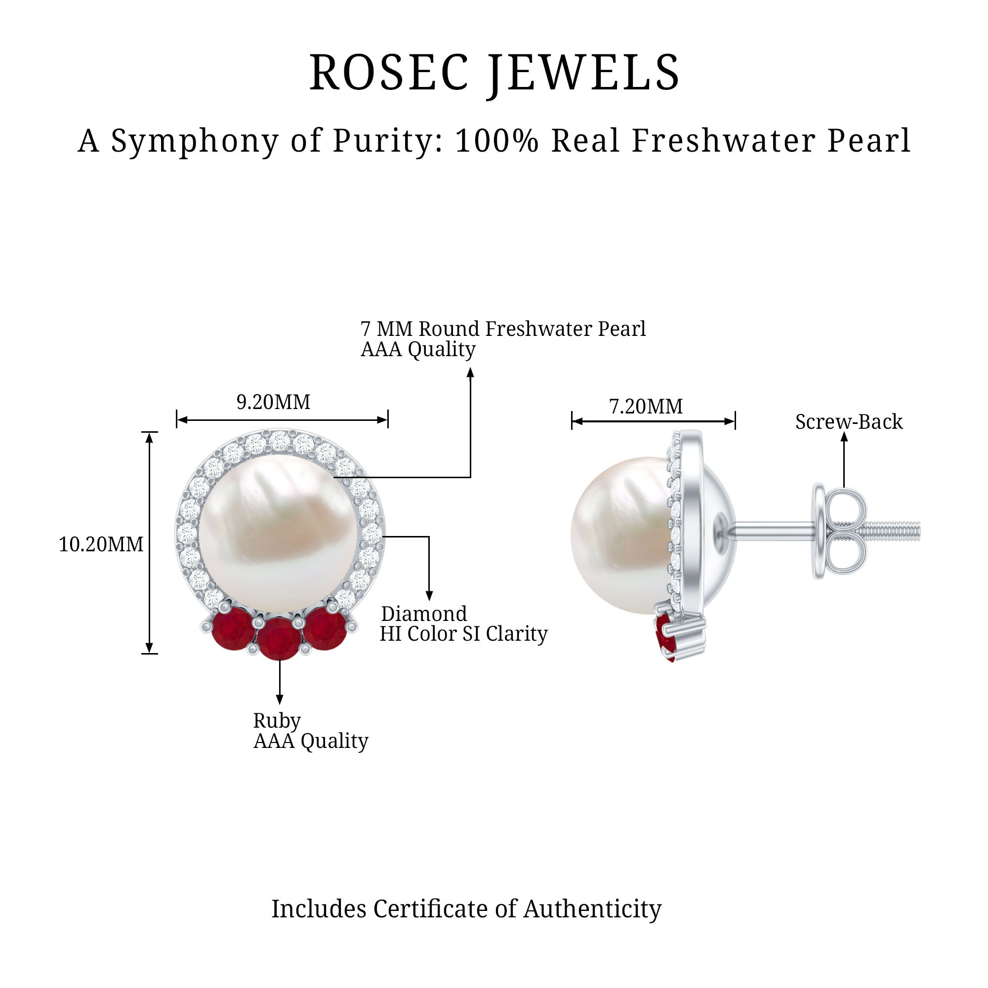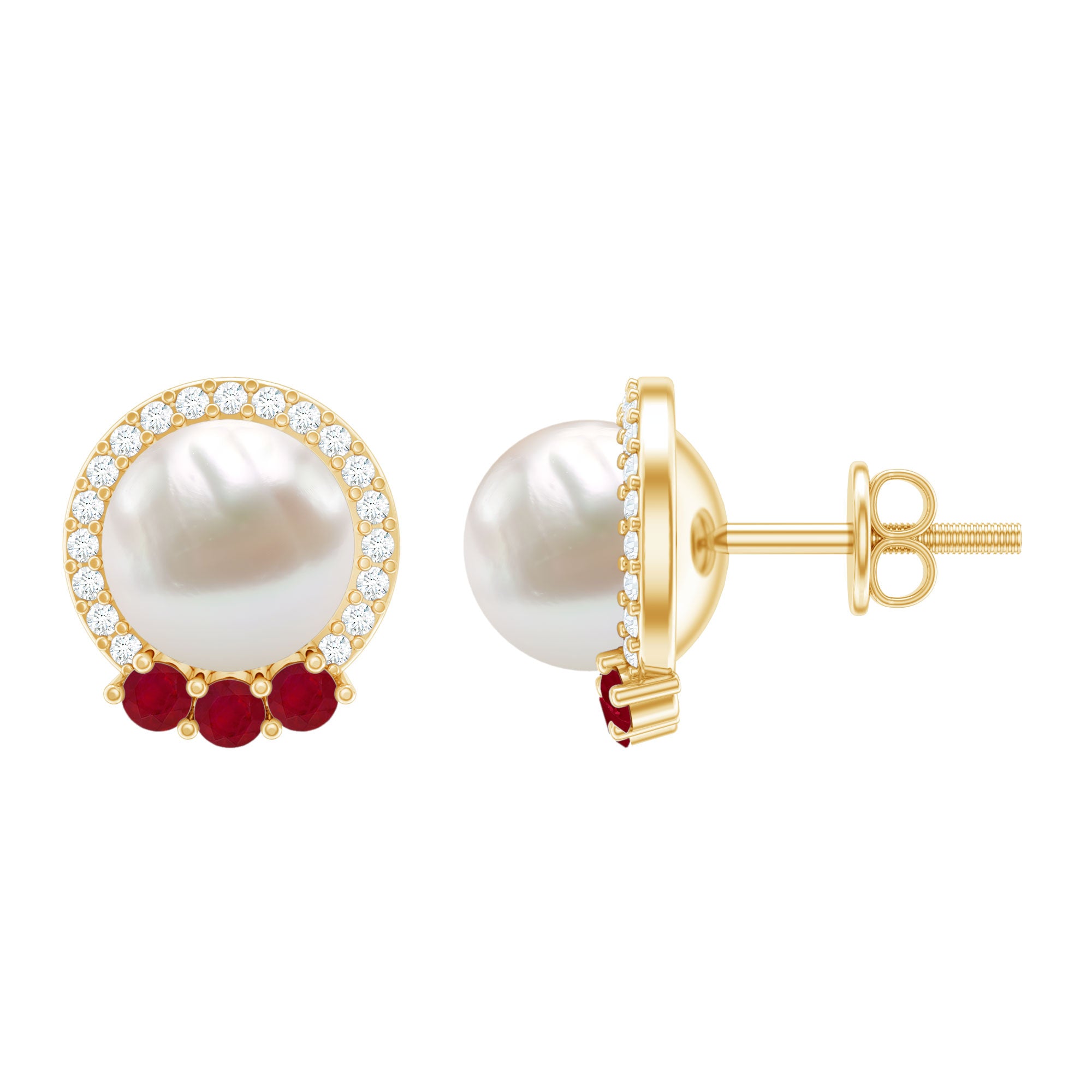The Freshwater Pearl and Ruby Stud Earrings are a fabulous choice you wont be able to resist no matter what your style is. Featuring Round Shape Freshwater Pearl while Round Shape Diamonds studded as Halo and Round Ruby adds a touch of color. These Pearl Earrings are secure comfortably with screw backs. Celebrate any occasion with these shimmering Stud Earrings that can easily be worn to top off any casual, formal, or party look.