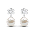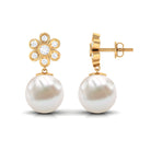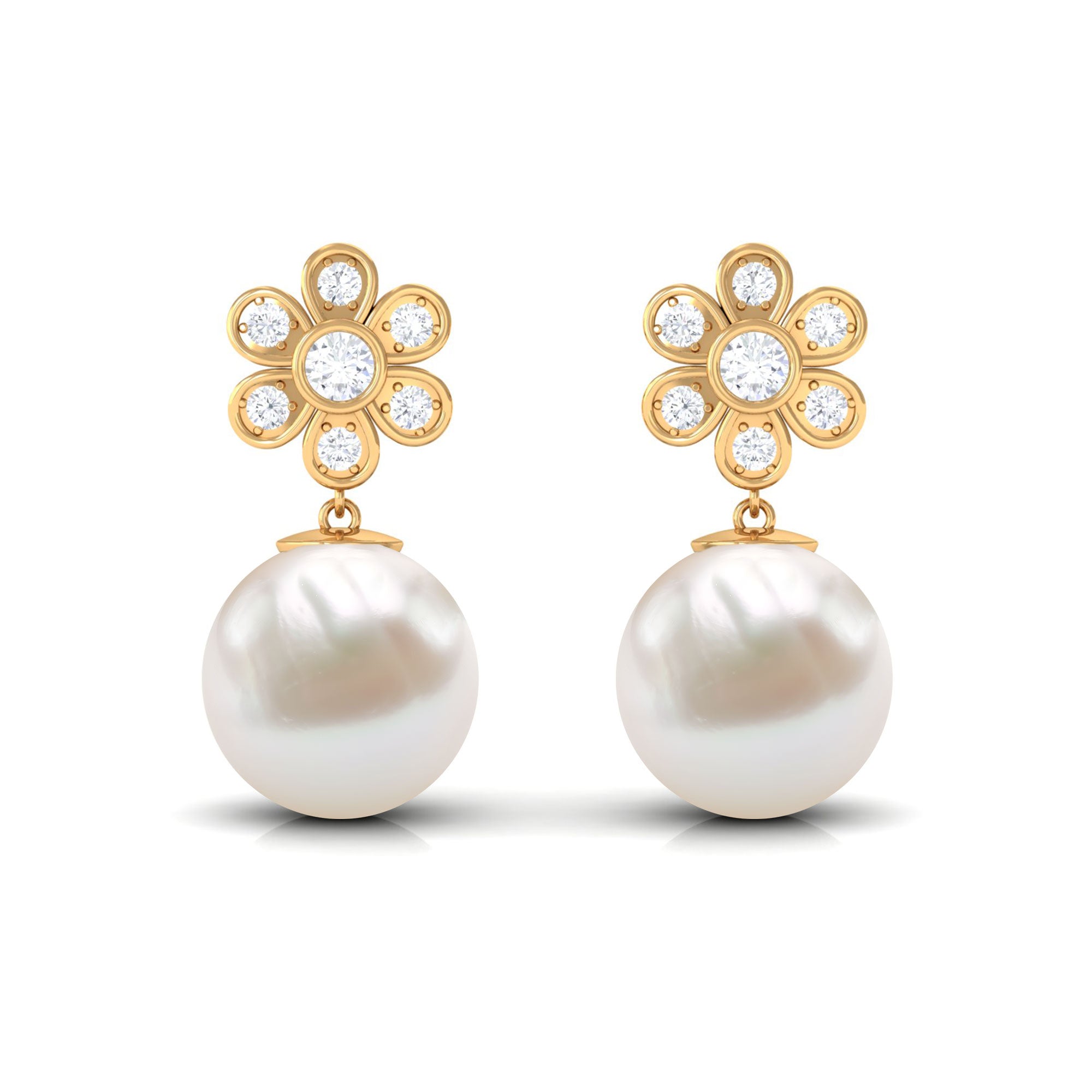 Freshwater Pearl Drop Earrings with Bezel Set Diamond Flower