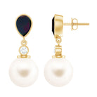 Behold the captivating beauty of these Freshwater Pearl Earrings secured with Screw Back Closure, a stunning piece of jewelry that instantly mesmerizes. A Round Shape White Freshwater Pearl delicately hangs as a drop, accentuated by a lustrous Pear Cut Black Opal on top in a bezel setting, and further adorned with Moissanite for a touch of luxury.