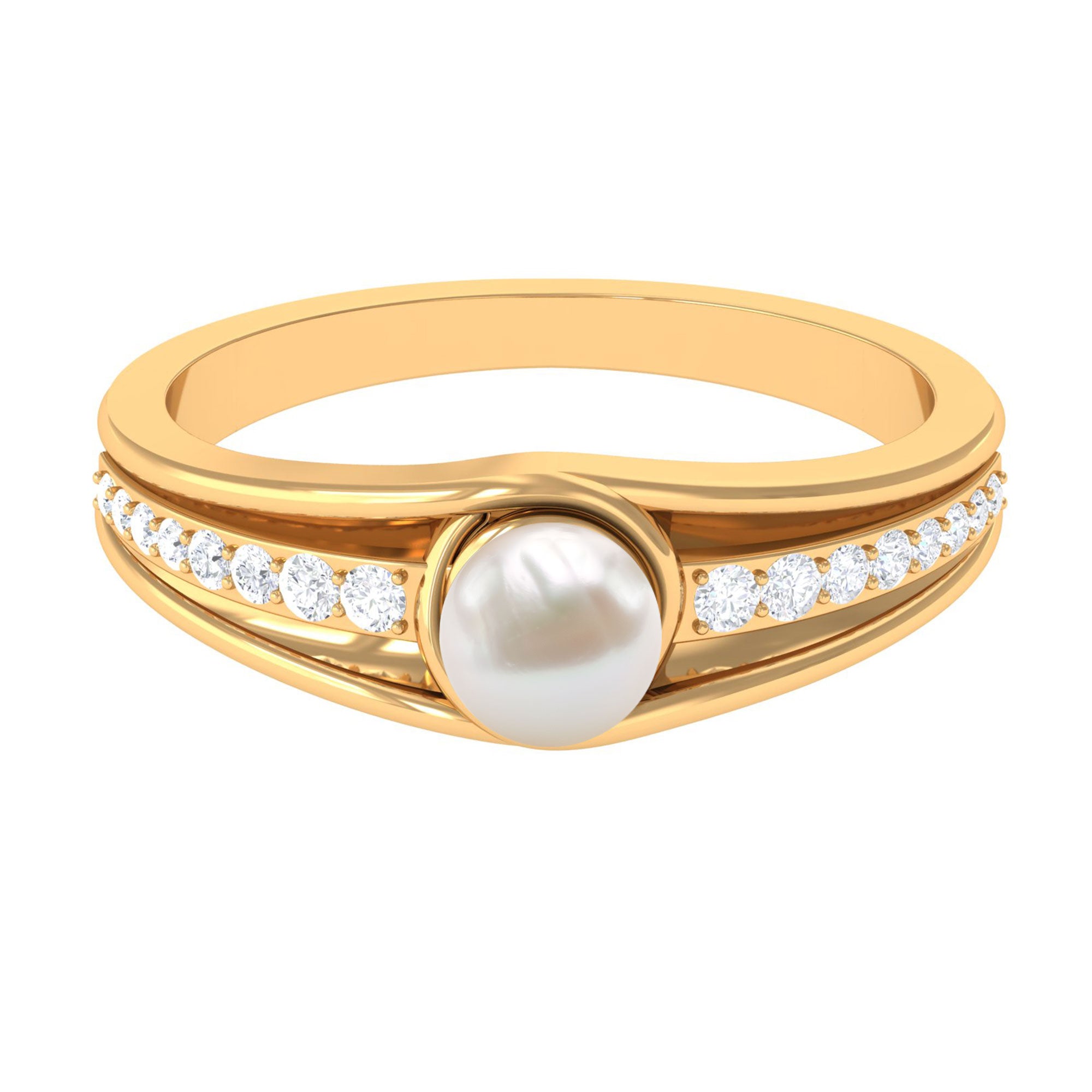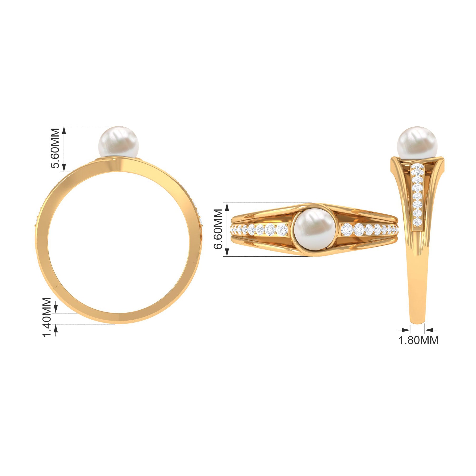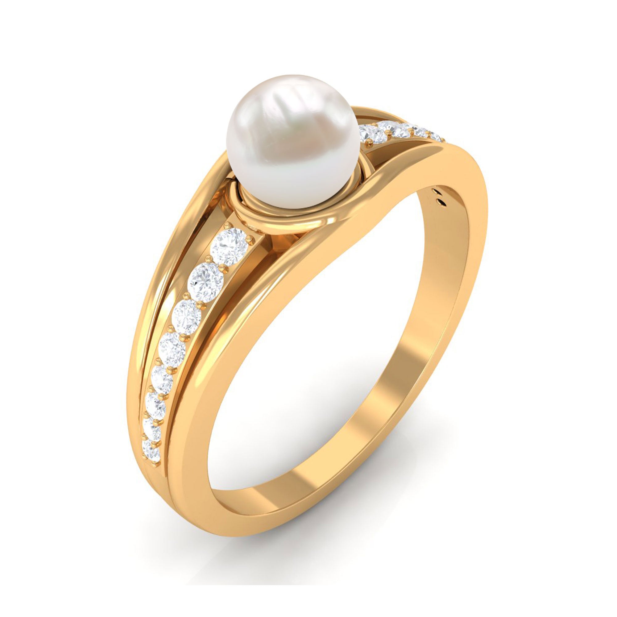 A bead set round freshwater pearl takes the center stage in this design. Diamond side stone grace the shank for added allure. This Freshwater Pearl and Diamond Ring is available in gold. This Solitaire Freshwater Engagement Ring will be a unique present for women that she can wear on any occasion.