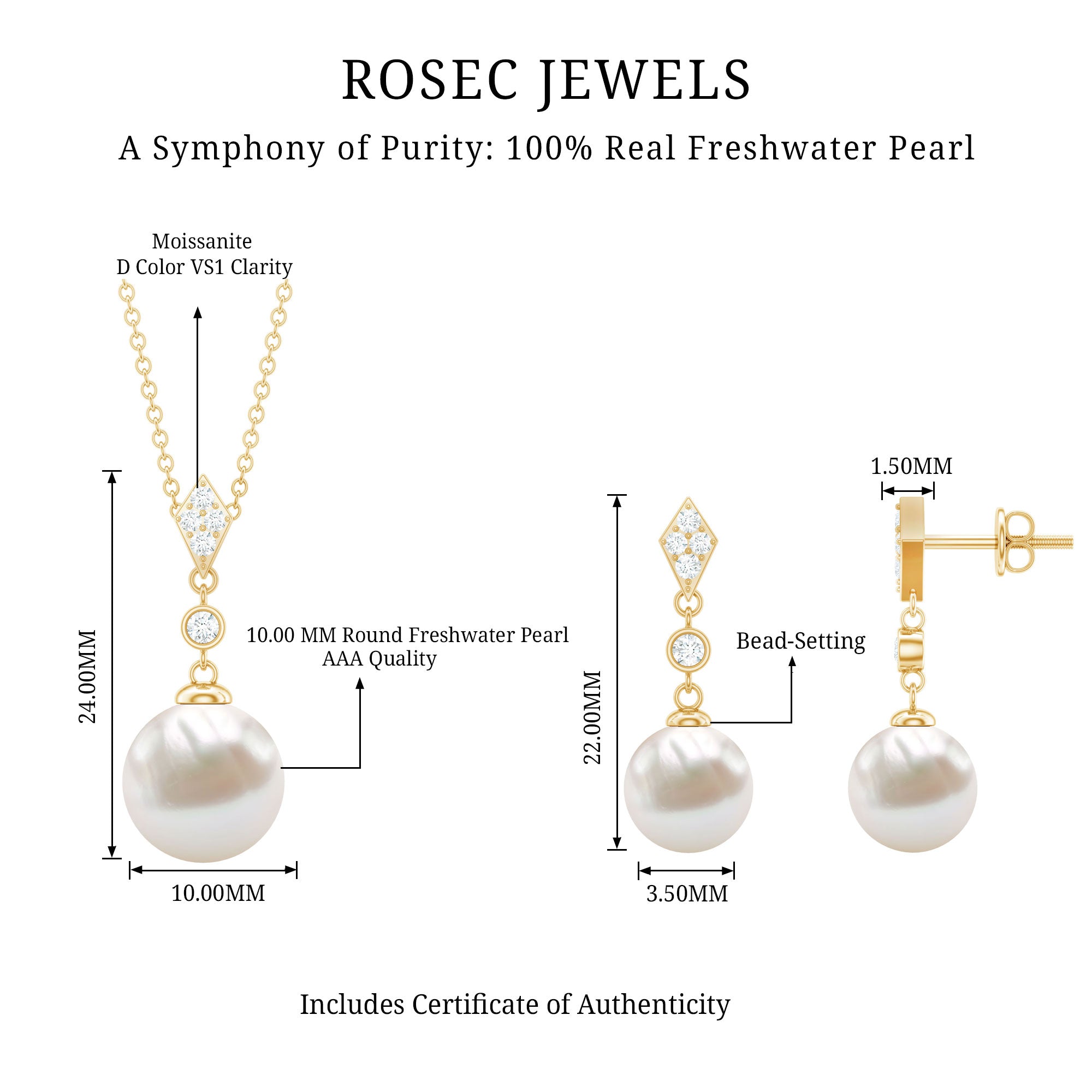 The jewelry Set comes with Solid Gold crafted Dangle Drop Pendant and Earrings with Bead Set Freshwater Pearl and Diamond studded in Prong Setting. The Dangle Earrings and Pendant Set is a perfect Bridal Accessory for Women on their Dream Day.