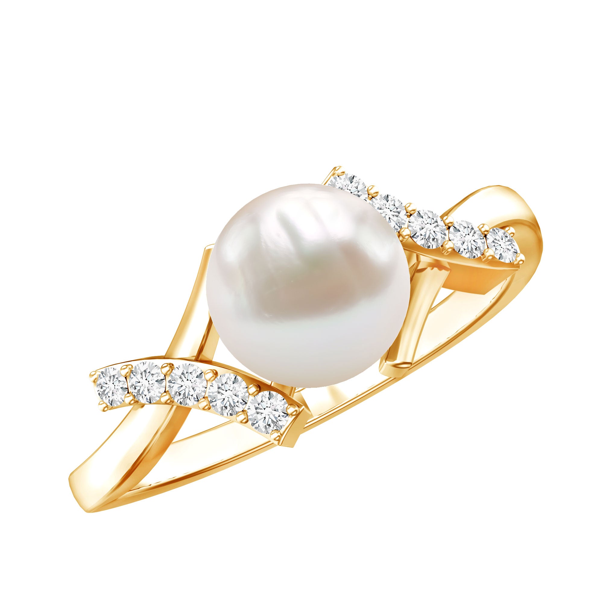 Add a touch of luxury and aesthetics in your style with this Freshwater Pearl Engagement Ring. Round Shape White Pearl set as solitaire beautifully in and to add more charm to its beauty, there are round Diamond studded on the crossover shank to enhance the beauty of this ring. This Freshwater Pearl Engagement Ring exhibit high brilliance.