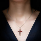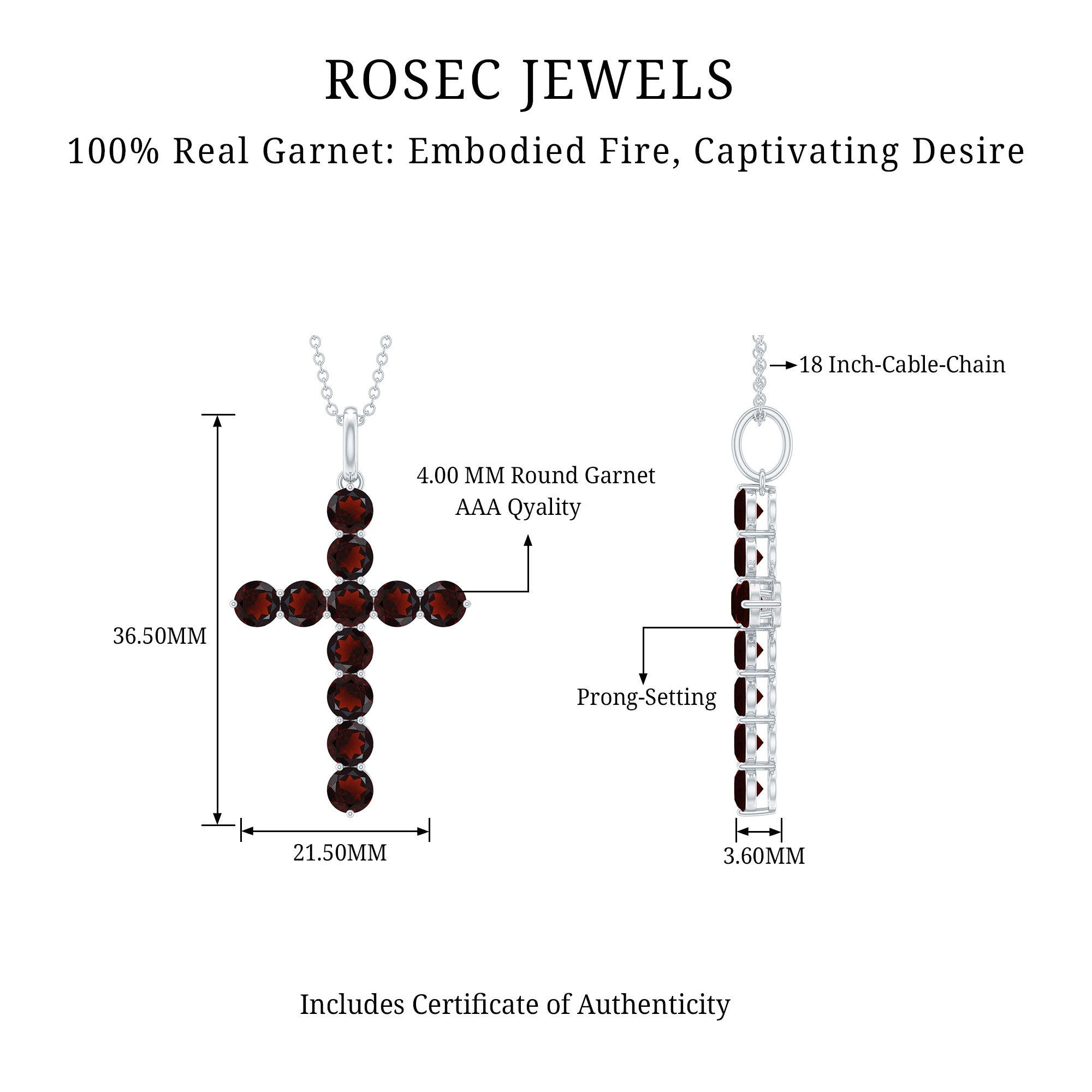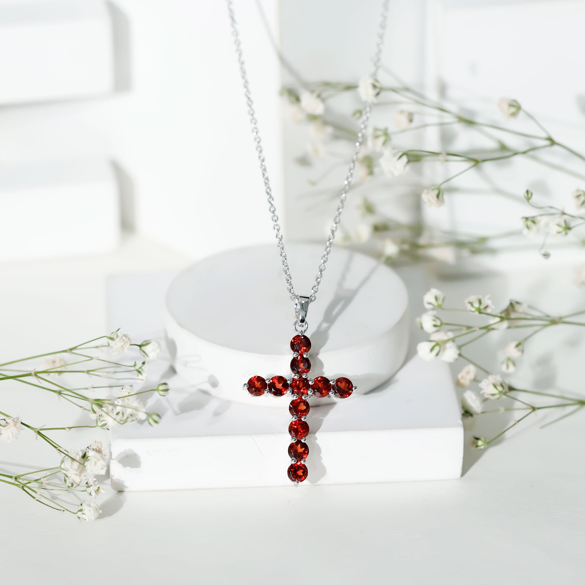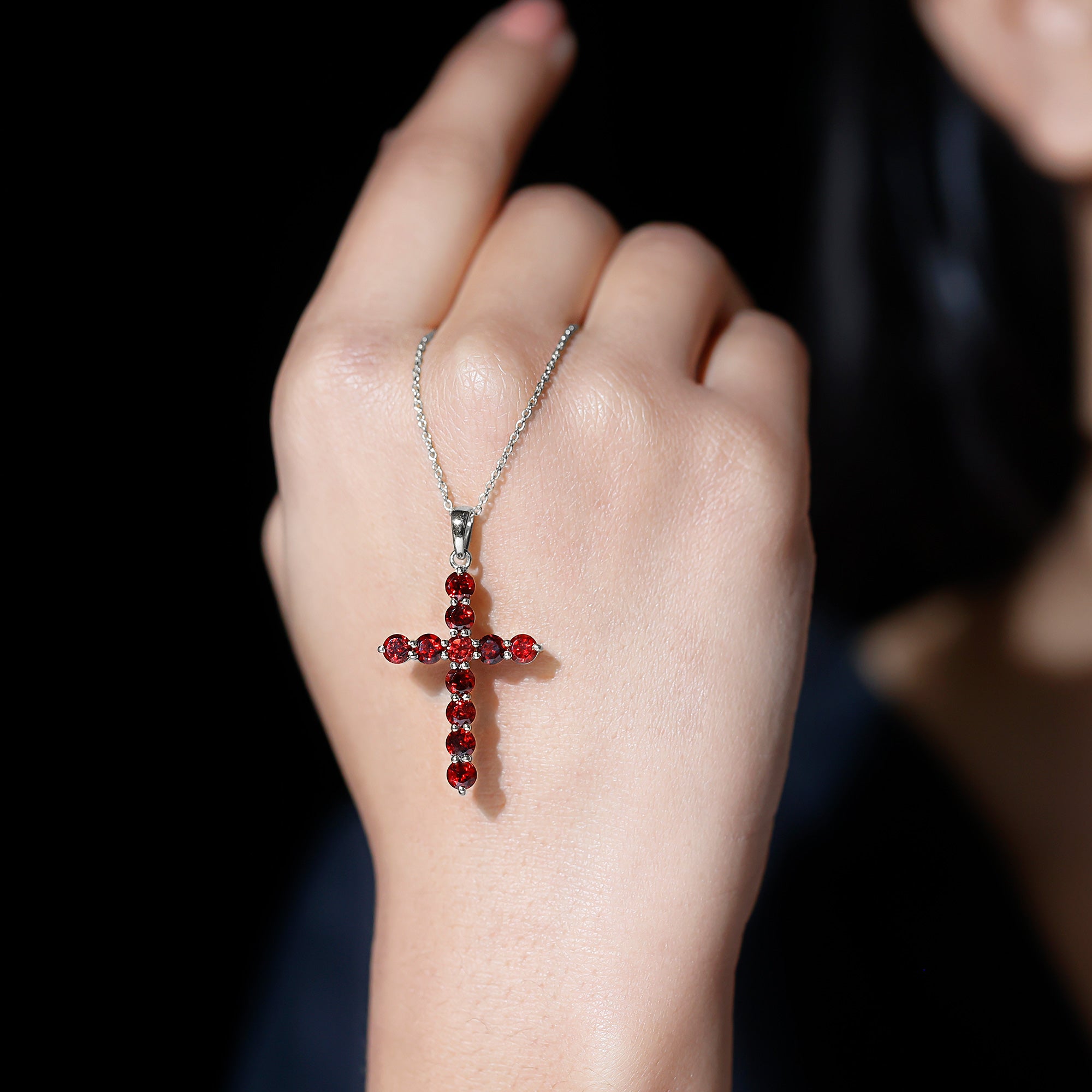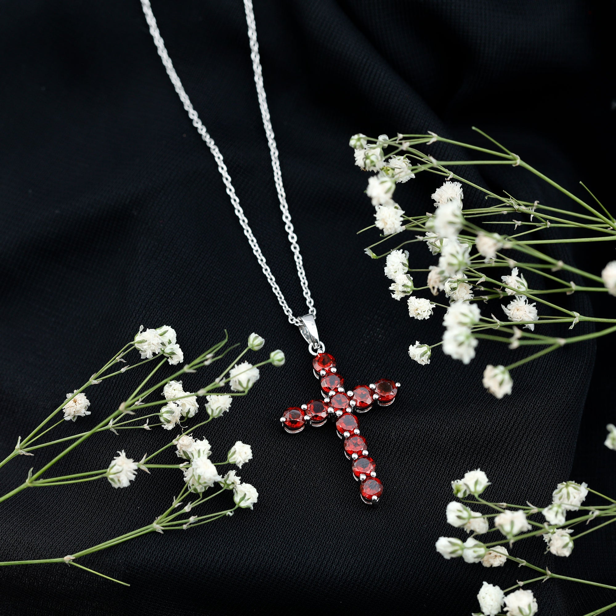Make a smart choice with this elegant yet eye-catching Cross Pendant Necklace that highlights beauty and a rich red tone. This charming Cross Faith Necklace boasts a captivating design that truly draws attention. It showcases 4 MM round cut natural garnet stones arranged in a cross shape, securely held in place by prong setting. The Religious Cross Necklace is made from 14k white gold plated silver and is suspended on a cable chain crafted from the same material. Make an impression with this exquisite Garnet Pendant Necklace that combines quality craftsmanship with a minimalist design. The bail connects the Cross Locket to the chain without overshadowing the gemstones. This design provides effortless style and comfort, perfect for both men and women, especially those born in January, as garnet is their birthstone. You can wear it alone or layer it with another necklace for a fashionable appearance. Incorporate this radiant religious symbol into your daily wardrobe to enhance your style with a touch of sparkle.
