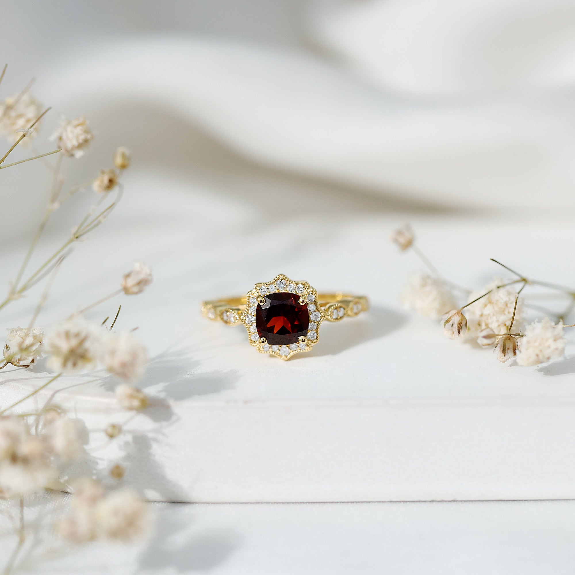 For the woman who carries passion in her heart and elegance in her soul, this Vintage Looking Engagement Ring is a bold tribute to timeless romance. Crafted with care in 14K yellow gold plated silver, this Halo Engagement Ring brings together deep color and intricate detail in a design meant to be cherished for generations. At the center sits a rich, 6 MM cushion cut AAA quality garnet. Set in secure prongs, the garnet radiates with a fire that draws every eye. Surrounding the center stone is a brilliant halo of round lab grown diamonds, each set to reflect light with a soft, luxurious sparkle. The shimmering contrast between the fiery garnet and sparkling diamonds adds a timeless depth and drama to the piece. Moving down the shank, you will find marquise shaped frames, each inset with petite lab grown diamonds, evoking an Art Deco influence. The edges are lined with delicate beaded detailing, giving the Garnet and Diamond Ring a handcrafted, heirloom-worthy finish that echoes the romance of eras past. This Garnet Engagement Ring is a story of passion, trust, and enduring love. Its bold color and elegant craftsmanship make it a perfect choice for engagements, anniversaries, or simply celebrating a love that is as classic as it is unique. Whether worn to mark a milestone or as a symbol of your forever, this Vintage Art Deco Ring brings together elegance, meaning, and a touch of old-world glamour, all in one unforgettable piece.