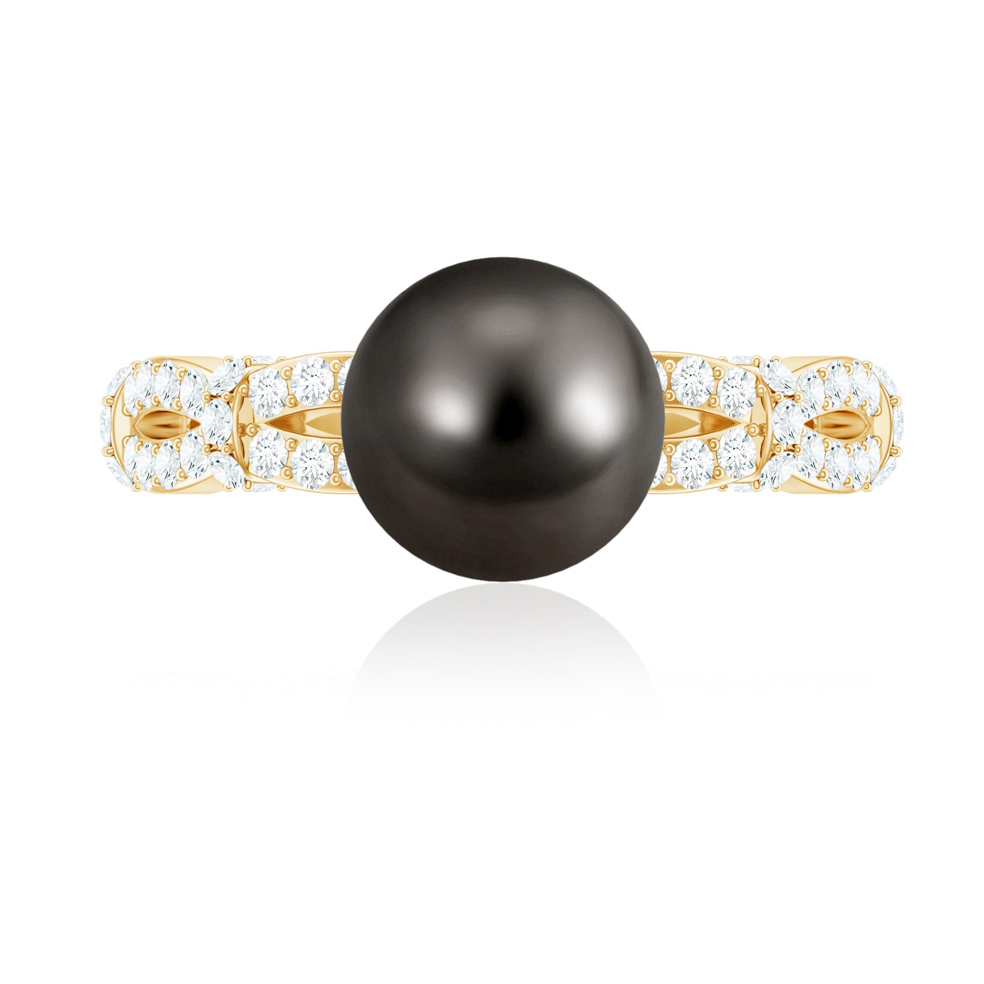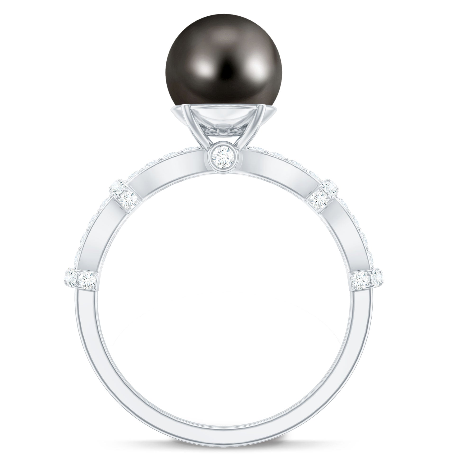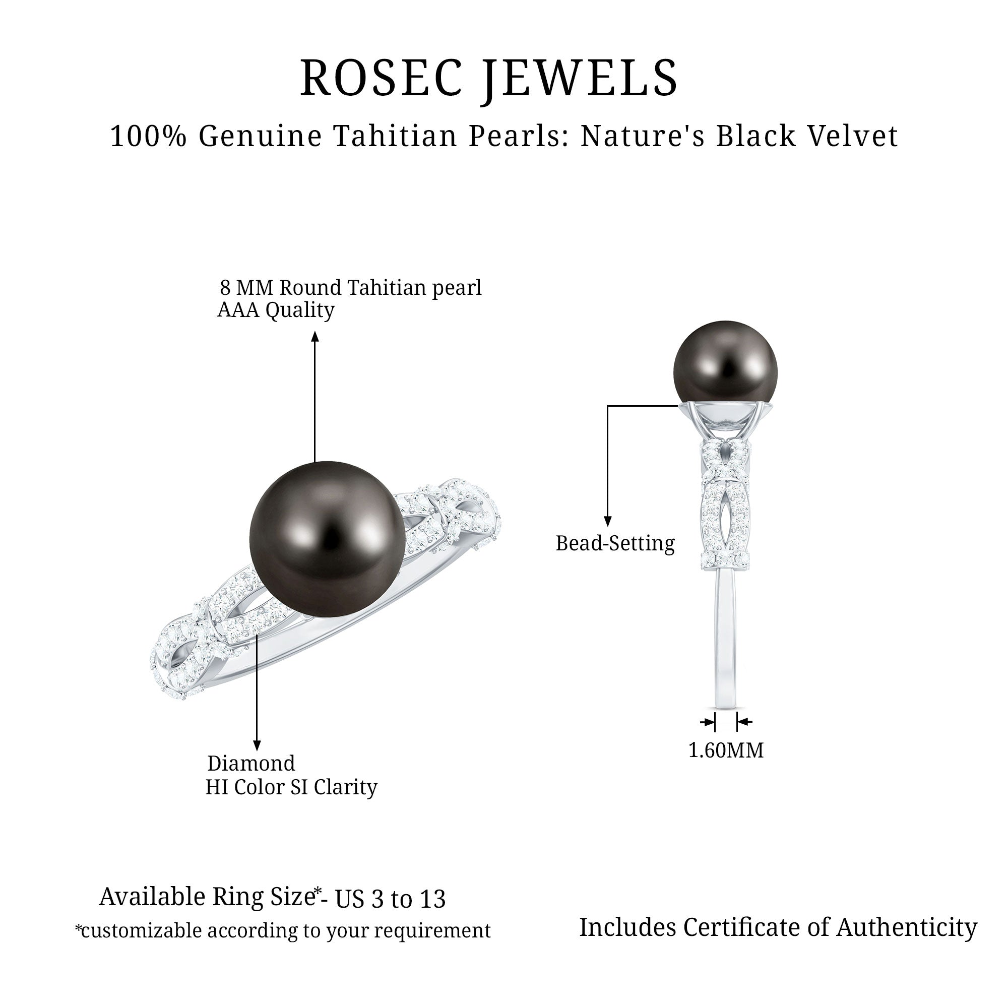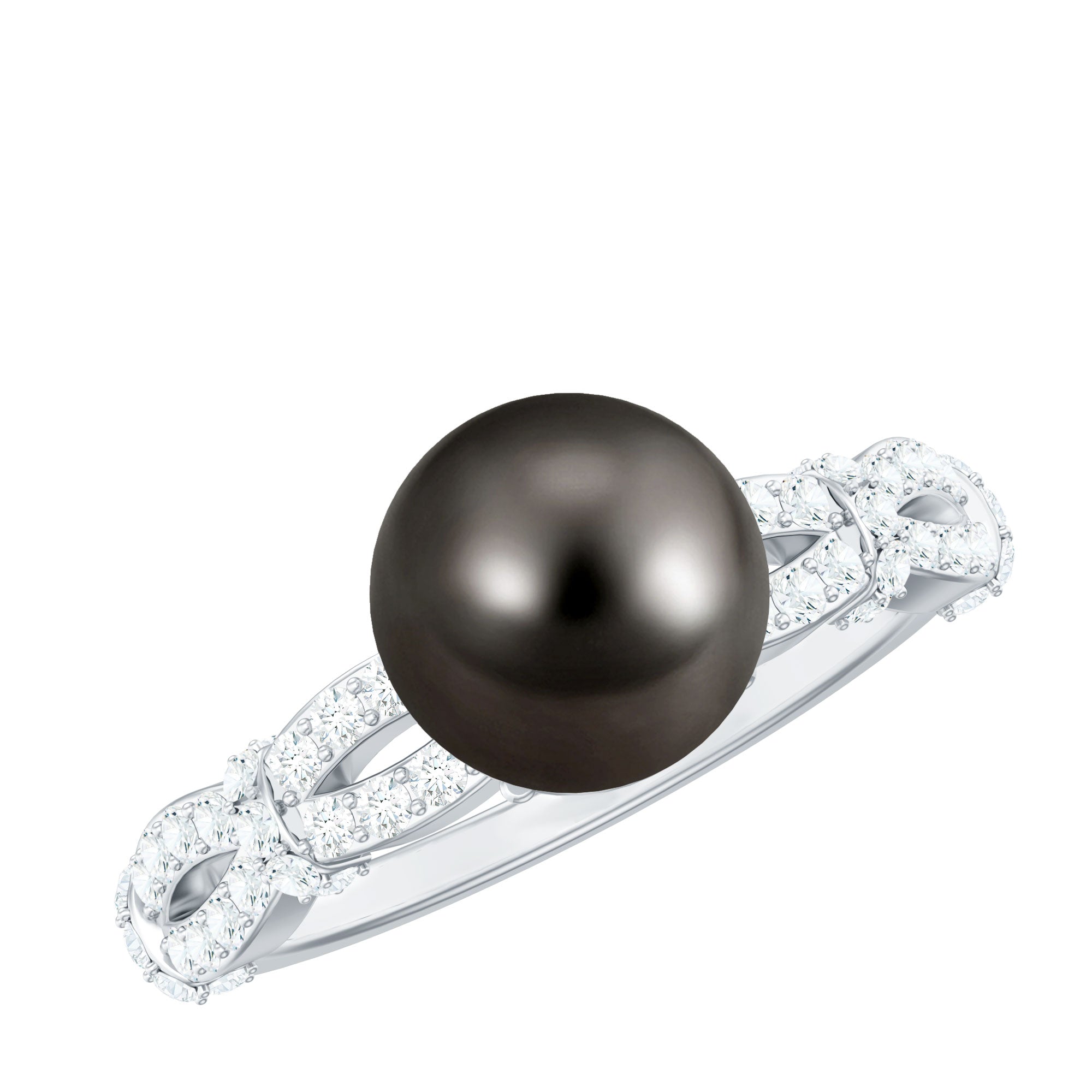 Add a touch of timeless elegance to your appearance with this Tahitian Pearl Engagement Ring, which symbolizes wisdom, prosperity, and protection, making it ideal for those born in June. The Crossover Ring features an 8 MM round Tahitian pearl, beautifully set in secure bead setting. Its distinctive design highlights a criss cross shank embellished with sparkling diamonds, providing a refined and designer flair that makes this piece truly exceptional. Underneath the black pearl, a delicate diamond is set in bezel setting, creating a hidden surprise that adds charm and intricacy to the Designer Engagement Ring. The combination of the AAA quality Tahitian pearl and shimmering HI-SI quality diamonds imparts a luxurious yet graceful essence, perfect for anyone who appreciates timeless beauty with a contemporary twist. The crisscross design elegantly symbolizes connection and harmony, making it a meaningful choice for engagements or special celebrations. This Tahitian Black Pearl and Diamond Ring is a statement of personality and style. Whether worn daily or for significant occasions, it brings a touch of sophistication and color to any outfit.