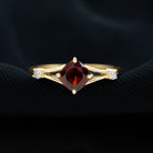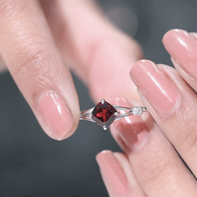 With the glow of romance and the promise of forever, this Cushion Cut Engagement Ring captures the beauty of a love meant to last. The 8 mm Cushion Cut Garnet, set diagonally in 4 Prong Setting at the center, brings a unique and artistic touch, its deep red color symbolizing passion, commitment and heartfelt connection. On either side of the elegant Split Shank, a dainty Diamond adds a whisper of sparkle, enhancing the delicate charm of this Solitaire Engagement Ring. The Split Shank design represents two paths coming together as one, making it a meaningful symbol of your shared journey. Crafted with care and available in a variety of ring sizes, this Split Shank Engagement Ring is made to fit perfectly for that life-changing moment. Whether you are planning a romantic proposal or gifting a cherished partner, this Garnet and Diamond Ring arrives in a signature jewelry box that elevates the magic of the occasion. Beautiful and filled with emotion, this Garnet Engagement Ring is a reflection of the love story you are building together.