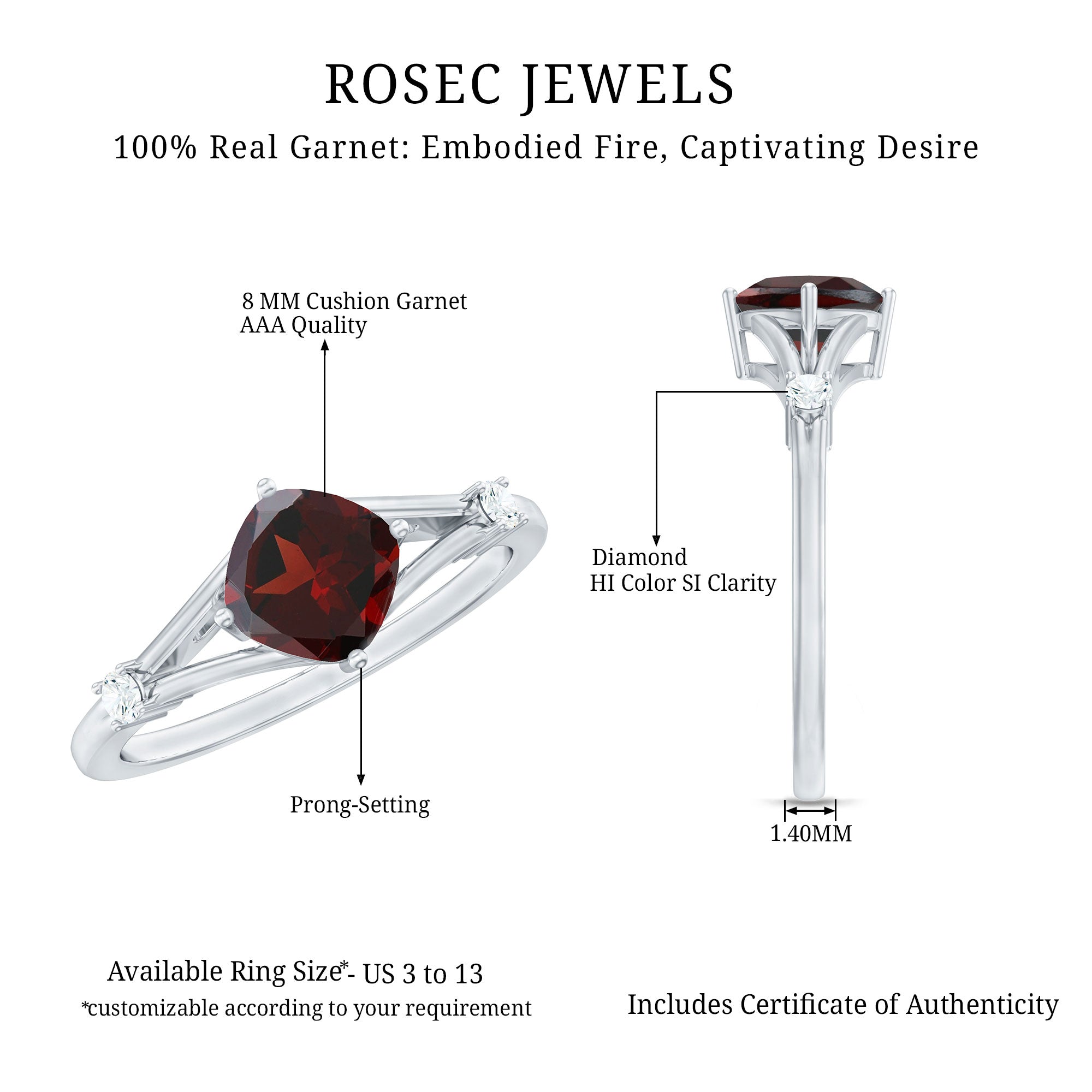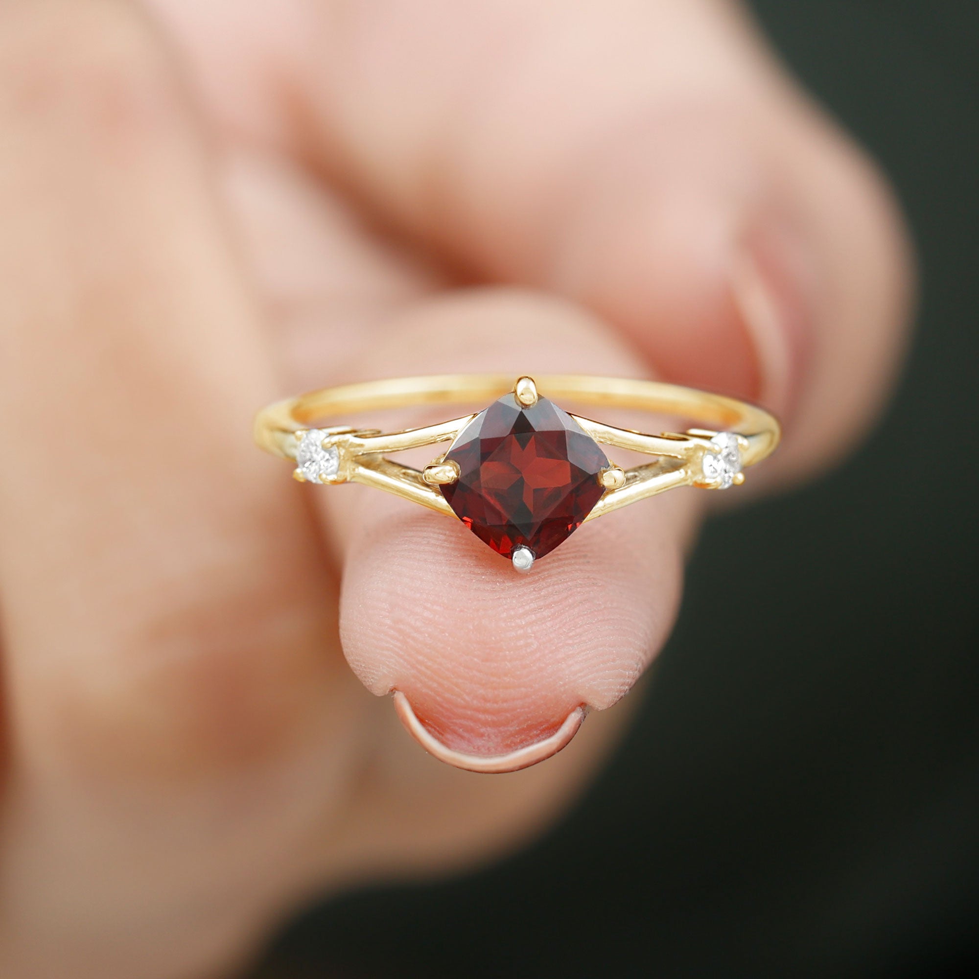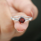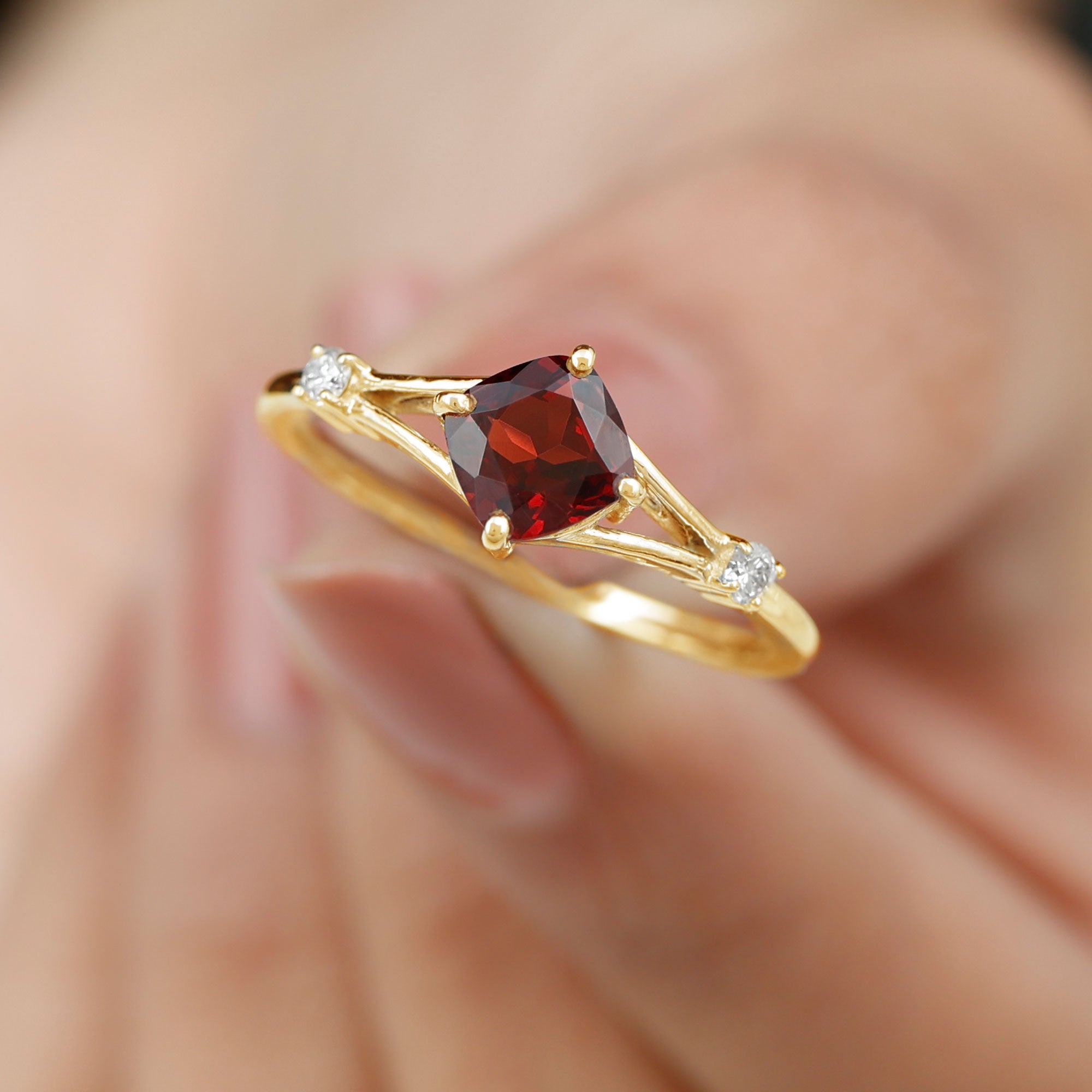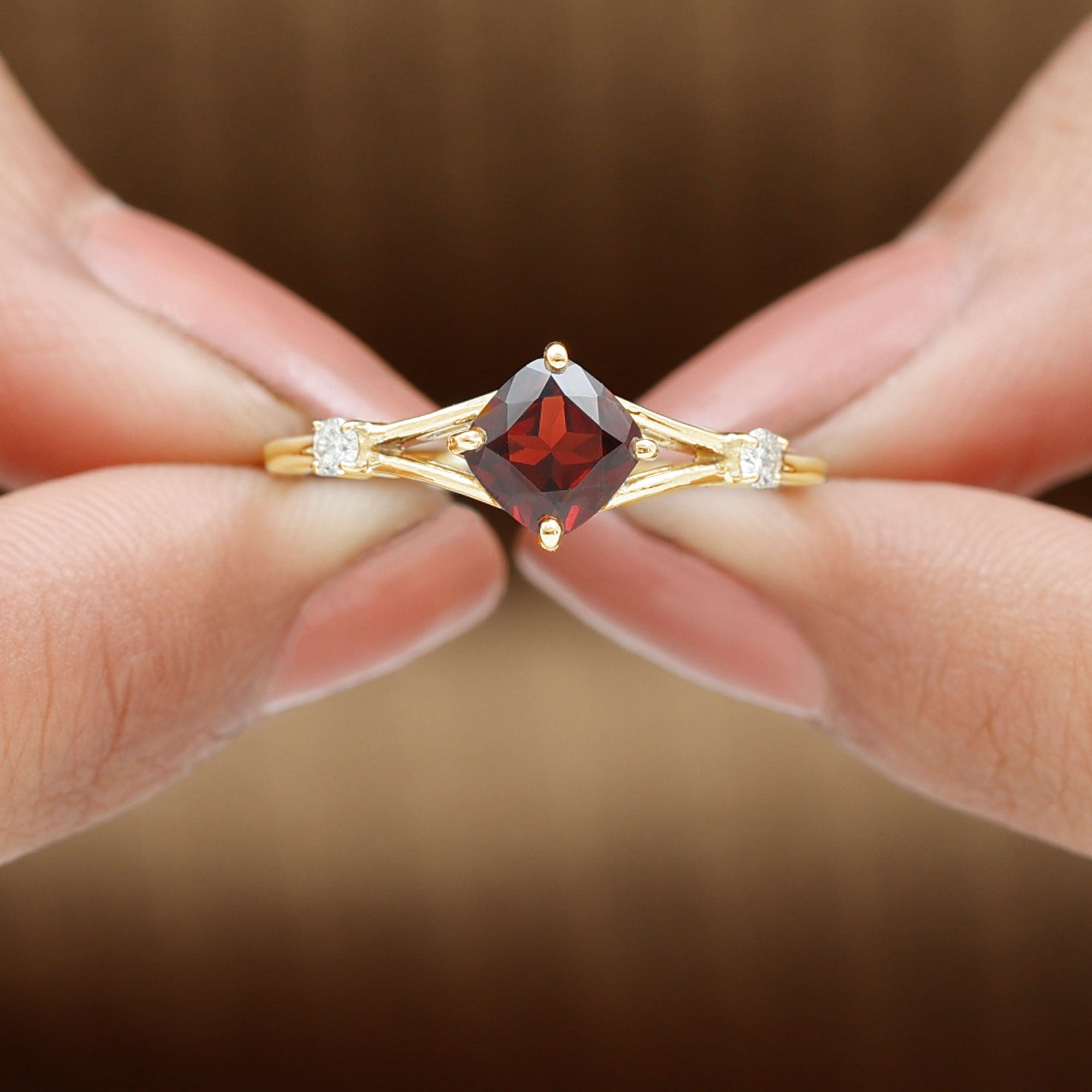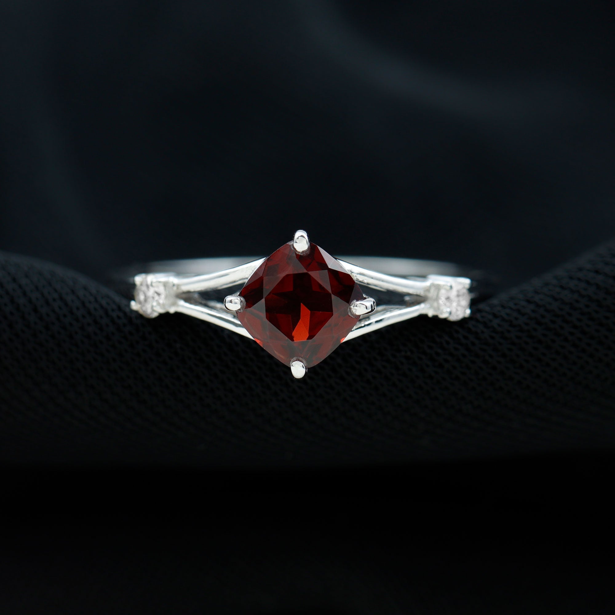 Genuine 8mm Garnet Diamond Cushion Cut Engagement Ring with Split Shank